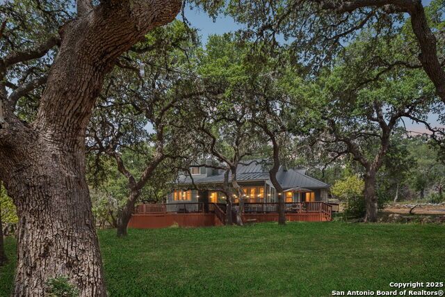 Set on nearly five acres, this Hill Country home is surrounded by mature oaks that frame wide outdoor decks and a wraparound porch.
