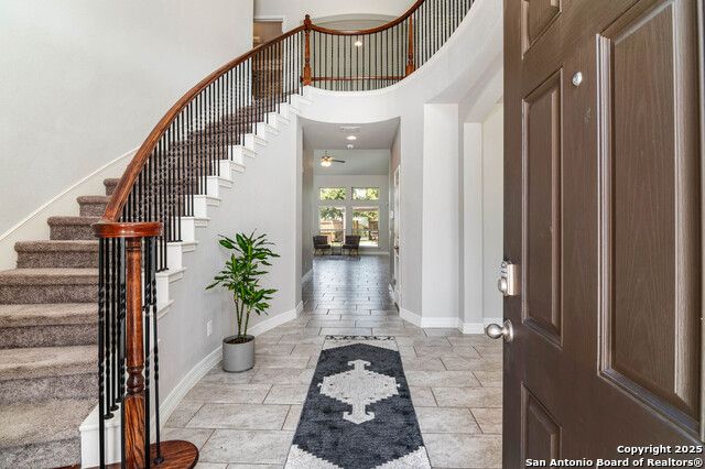 Stunning opulence as you enter into this amazing foyer with a rotunda ceiling and spiral staircase adorned with wrought iron and wooden handrails.