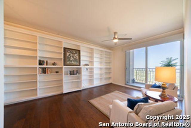 A full wall of bookcases awaits your book and objects collection in the living room of this incredible unit on the 22nd floor of The Towers on Parklane.