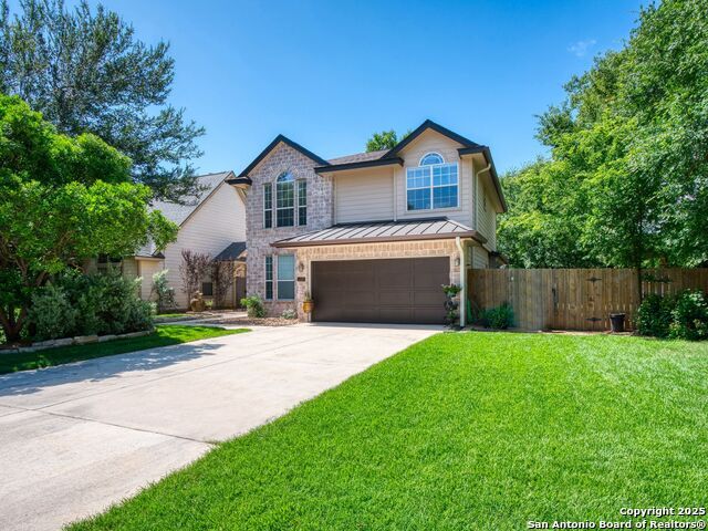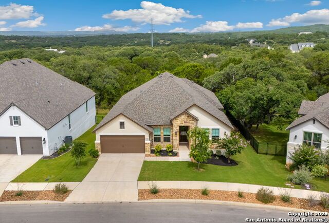This painted white brick two story home sits on a larger corner lot with views from the rear patio of the Hill Country.
