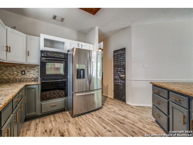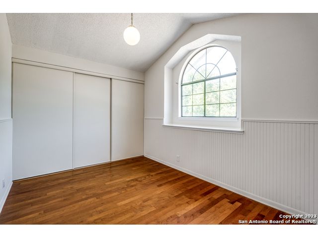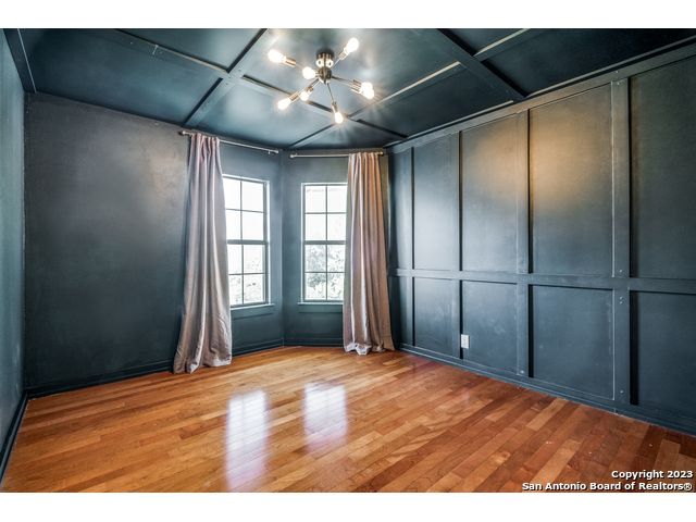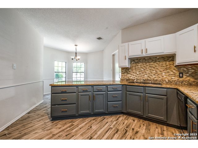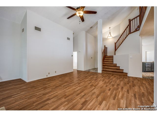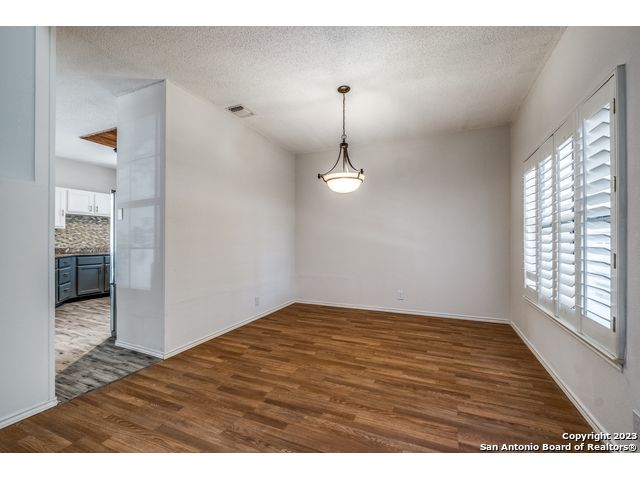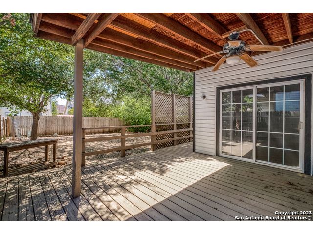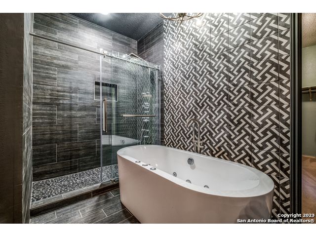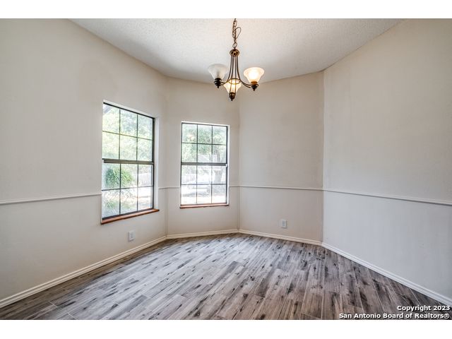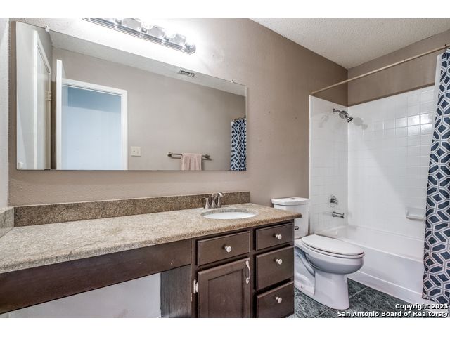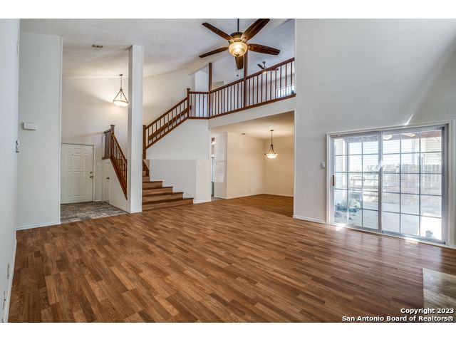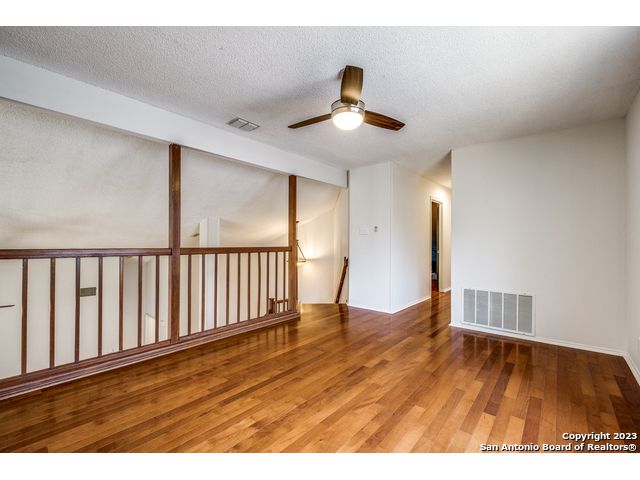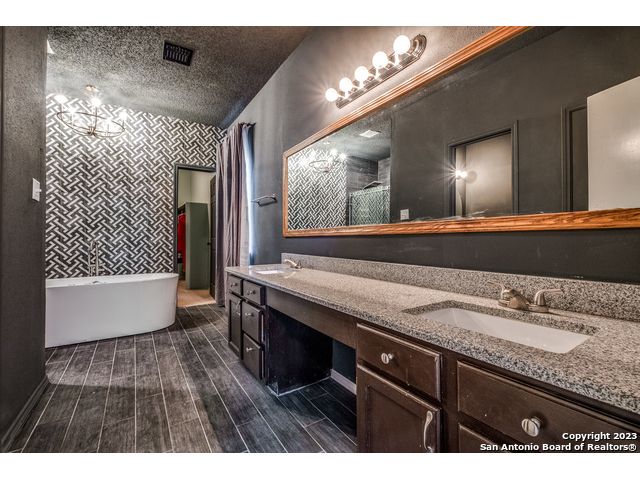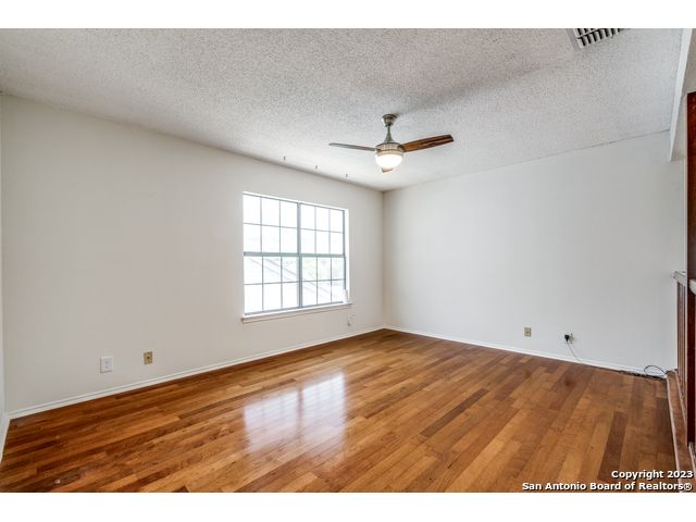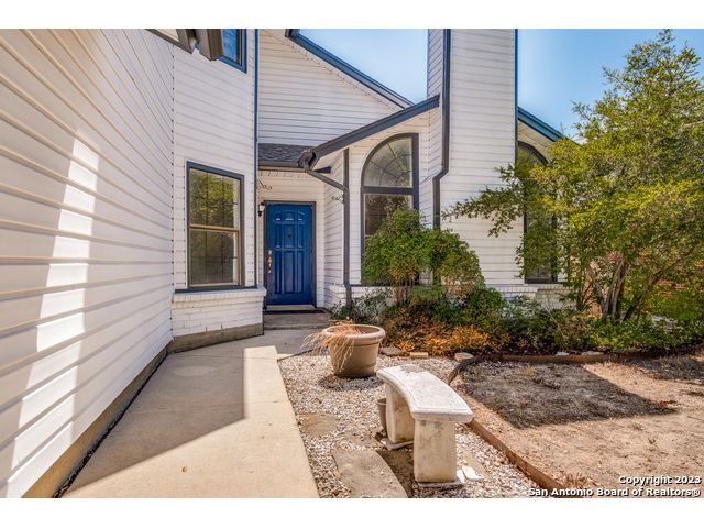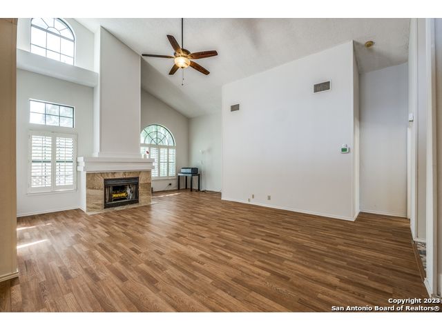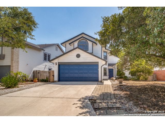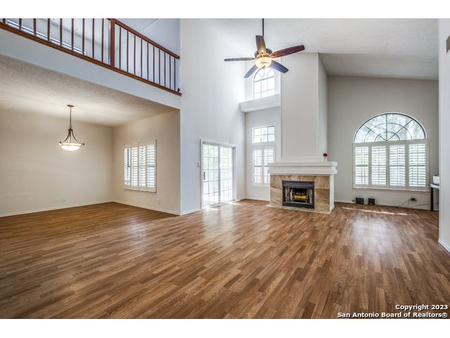 Welcome to this charming two-story home in the Eden Roc community located near Loop 1604, 281, Morgan's Wonderland, Retama Park, Heroes Stadium, and so much more! Upon entering the home, you are greeted by natural light, soaring ceilings, many great windows, hardwood flooring throughout, a separate dining room, and a wood burning fireplace. The main level Master Bedroom has its own fireplace and a beautifully updated modern, master bathroom, featuring a glass walk-in shower, a standalone jetted tub, a dual vanity and a large walk-in closet. The tastefully updated Kitchen features abundant cabinetry, granite counter tops, a built-in oven, a glass cooktop and a breakfast nook. Upstairs, a second family room perfect for game night and two additional bedrooms. Step outside to the fully covered patio overlooking the large backyard with mature shade trees and a full privacy fence!
