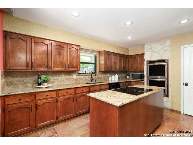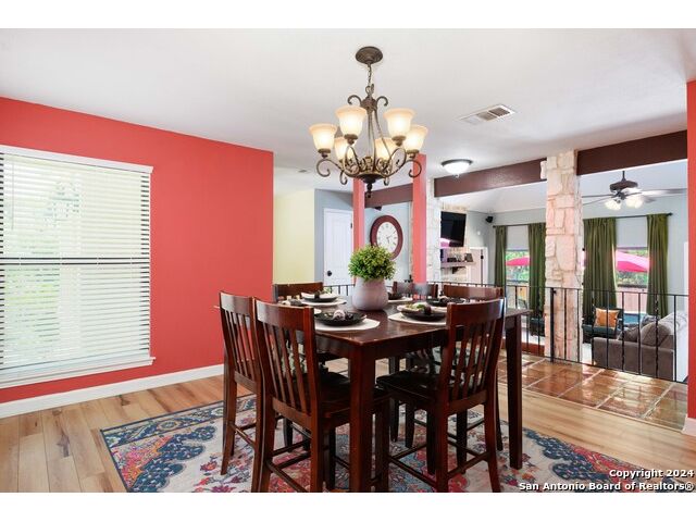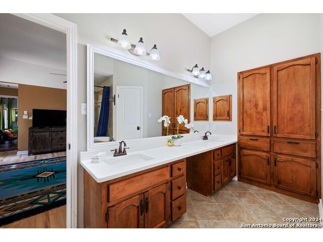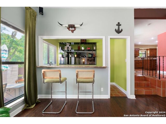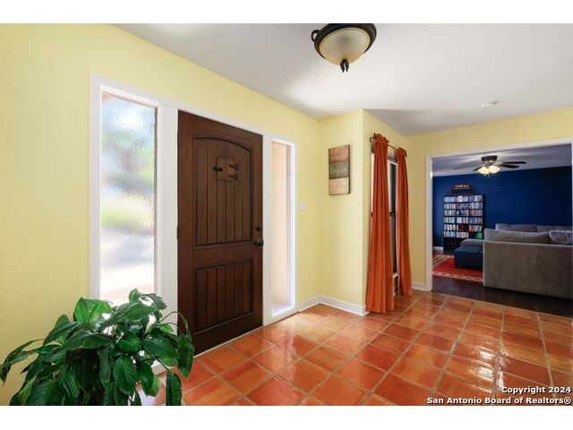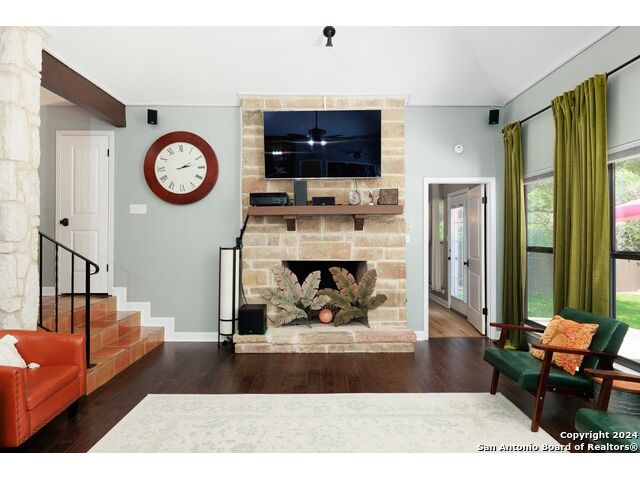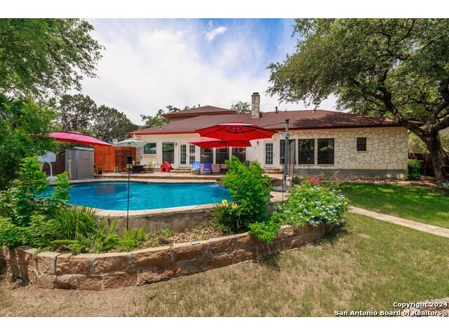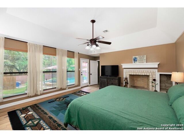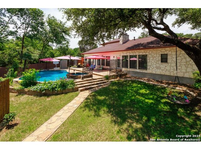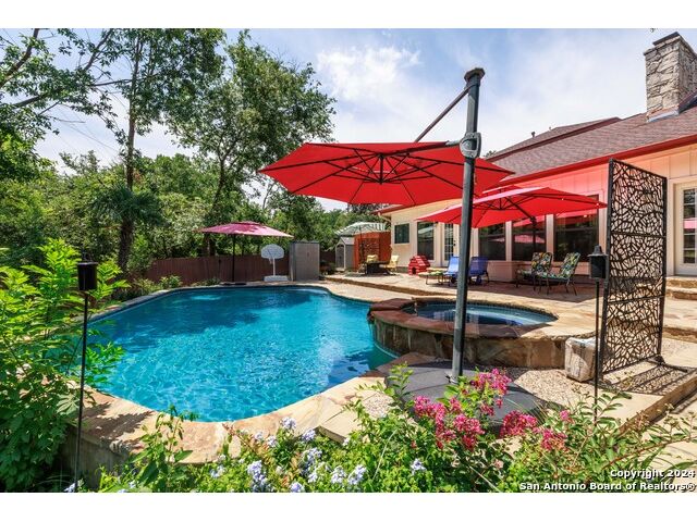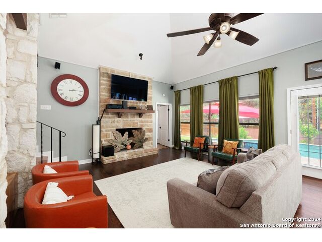 Rare Spanish style home with a "California feel" is located in the quiet Village in the Woods. This exceptional property on a spacious 0.29-acre lot perfectly blends luxury and convenience. Step inside to be greeted by beautiful Saltillo Tile and hard flooring throughout, which offers a sleek and seamless look. The expansive living area is filled with natural light, complemented by a wet bar and cozy fireplace, creating a perfect space for relaxation and entertaining. The primary bedroom, located on the main floor, serves as a private retreat with an en suite bath complete with two separate closets, its own fireplace, and direct outdoor access to your backyard oasis. The kitchen has granite countertops, double ovens placed on a stone-accented wall, a breakfast nook, and a separate dining room. Upstairs, the three additional bedrooms are spacious and well-appointed for privacy. BONUS ROOM currently being used as a media room can be used as a home office, game room, etc. The backyard is designed for entertaining, featuring a sparkling pool and spa, a charming pergola (with water and electricity), and plenty of space for entertaining family and friends. Additional features include a two-car garage, sprinkler system, a recently replaced roof, and with NO HOA, you have the freedom to truly make this home your own.