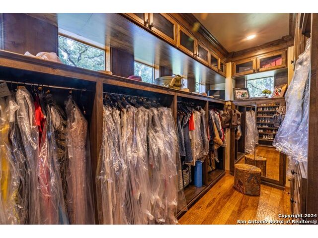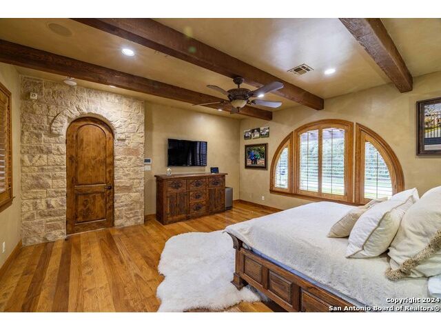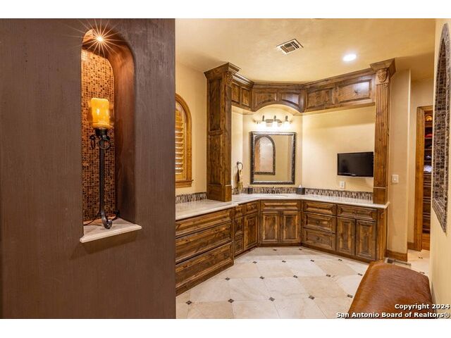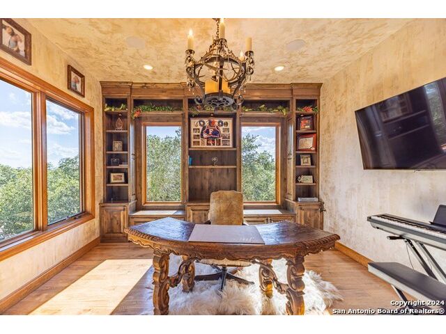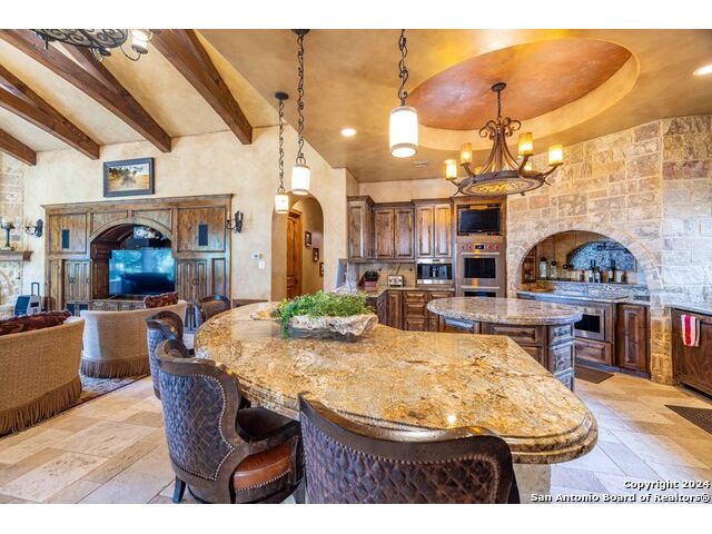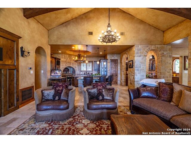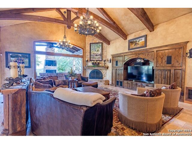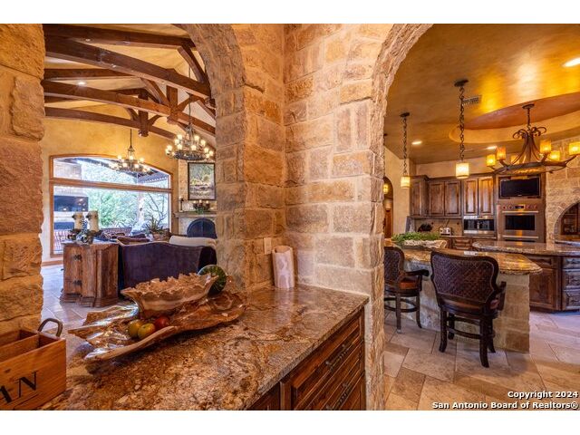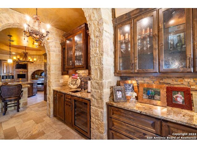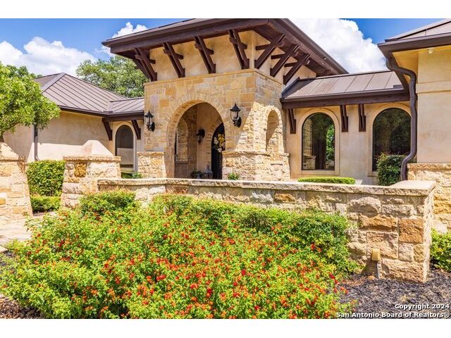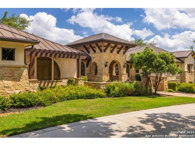 Welcome to 14454 Santa Rita, which backs up to 12,000 acres of restricted conservation land known as Government Canyon, a stunning residence that epitomizes luxury and meticulous craftsmanship. This exquisite home sits on 3.24 acres of land and features 4 spacious bedrooms, each with its own full bath and built-ins, complemented by 2 additional half baths. A charming casita with a full bath provides a perfect retreat for guests. The master bedroom is a true sanctuary, boasting an outdoor patio and walk-in closets with built-in shelves, offering ample storage and convenience. The other bedrooms also feature built-ins and cozy window seats, adding charm and functionality to each room. Step inside to discover an inviting library that seamlessly connects to an upstairs office, ideal for working from home. Wine enthusiasts will appreciate the temperature-controlled wine cellar, perfect for storing and showcasing your collection. The house is equipped with a state-of-the-art speaker system throughout, ensuring your favorite tunes are always at your fingertips. The culinary heart of the home is the kitchen, adorned with high-end Wolf appliances, a large walk-in pantry, and a butler's pantry. The house is enhanced by the artistry of Chris Voss, whose chandeliers illuminate the space with elegance throughout the house. The attention to detail extends to the finely painted walls, creating a warm and inviting atmosphere. Outdoor living is equally impressive, with a backyard patio designed for entertaining. Enjoy the outdoor kitchen area, complete with a grill and fireplace, perfect for gatherings with family and friends. The infinity pool, featuring a beach entry, offers breathtaking views of the hill country, creating a serene and picturesque setting. Built with an unwavering commitment to quality and design, 14454 Santa Rita is a home where luxury meets functionality, offering a lifestyle of unparalleled comfort and sophistication.