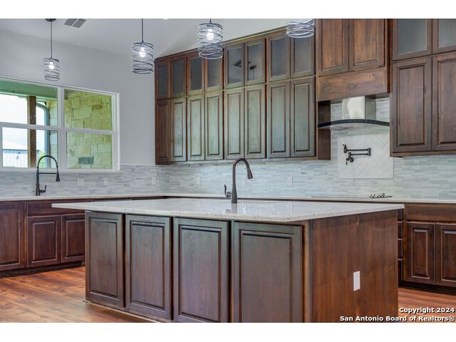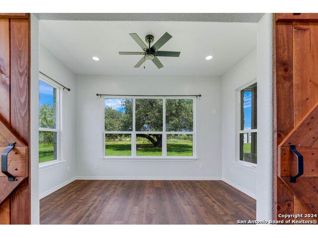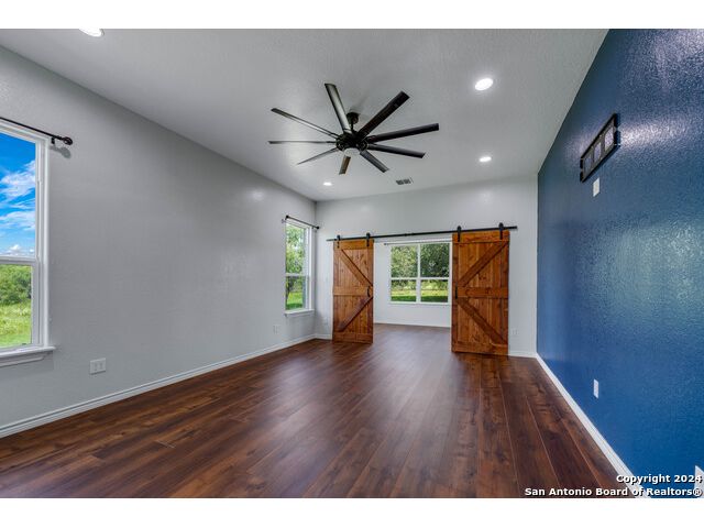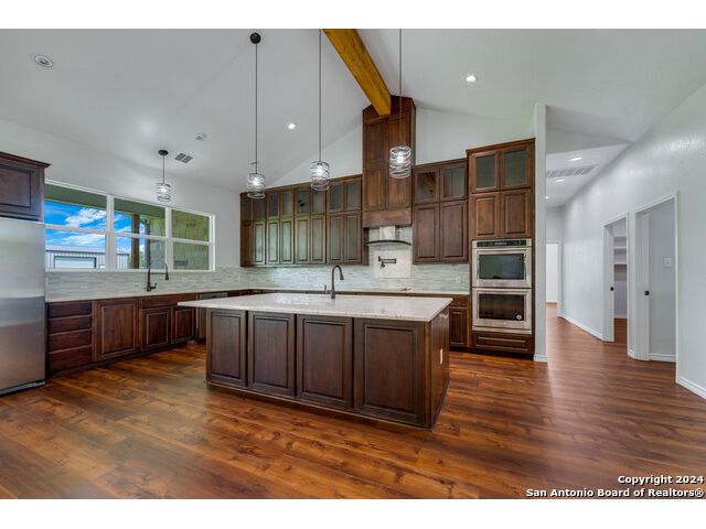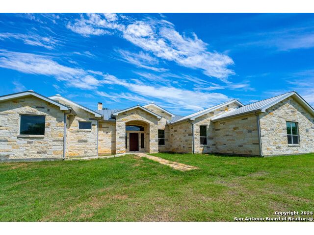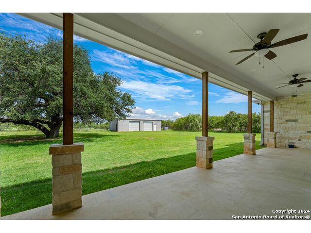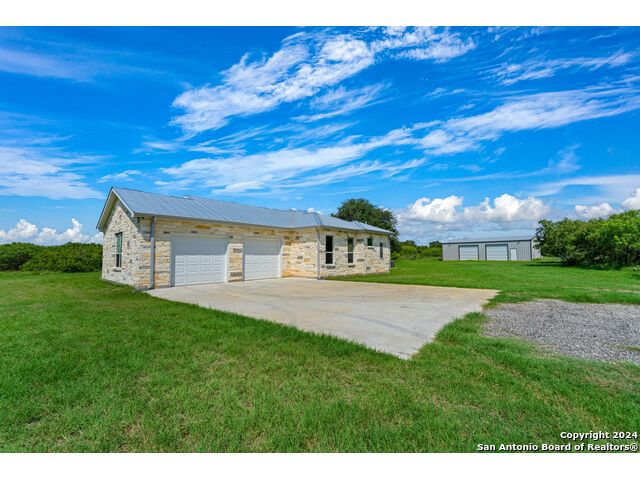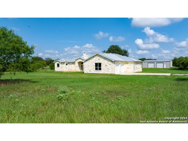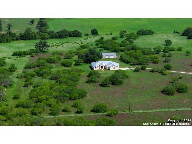This exquisite property, nestled on 40 acres of serene landscape, features a stunning open-concept home designed for both luxury and practicality. The expansive living space is highlighted by a cathedral ceiling, seamlessly integrating the living, dining, and kitchen areas. The living room is a cozy focal point, centered around a charming wood-burning fireplace. The dining area, situated between the living room and kitchen, makes entertaining effortless. The kitchen is a culinary dream, boasting beautiful soft-close cabinets and drawers, solid countertops, a tiled backsplash, and a spacious 9x5 island with additional cabinetry and a sink. Wide windows above the secondary sink provide delightful natural light. The kitchen is further enhanced with a pot filler above the stove, extensive upper cabinetry offering ample storage, and double ovens for the home chef. Adjacent to the kitchen is a butler's pantry, equipped with built-in cabinets, shelves, and a water line for an extra refrigerator or icemaker. Through the mudroom, you'll find the garage and a well-appointed laundry room with a sink and closet. On one side of the house, there are two bedrooms sharing a Jack and Jill bathroom, a half bath, and a guest room with its own ensuite. All bedrooms are equipped with walk-in closets. The primary suite, located on the opposite side of the house, features a bonus space accessible through barn doors, perfect for an office or sitting room with direct access to the back patio. The primary ensuite includes two walk-in closets, a luxurious garden tub, a walk-in shower, and a double vanity. The back patio is an inviting space for relaxation or entertainment, while the attached, oversized garage is insulated, finished, and includes a 14x8.5 storage room. Outside, a 2000 sqft metal shop building stands ready to meet a variety of needs. This versatile structure is fully insulated, with two large and one small roll-up doors, three large fans, LED lighting and system. Other features of home include: 10' ceilings, 2 gas tankless water heaters, 2 HVACs (one dedicated to Primary Suite), metal roof, outlets in eves, gutters, Generac Generator, water well for water grass, wall outlets for TVs, wall blocking behind TV locations and TP holders, insulation around all bathrooms. Heritage Live Oak in the backyard for your peaceful enjoyment. This property is a harmonious blend of elegance, comfort, and functionality, offering an idyllic retreat for its new owners.