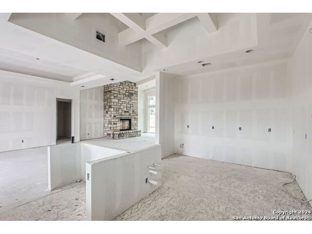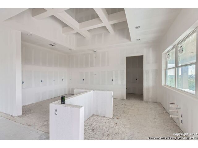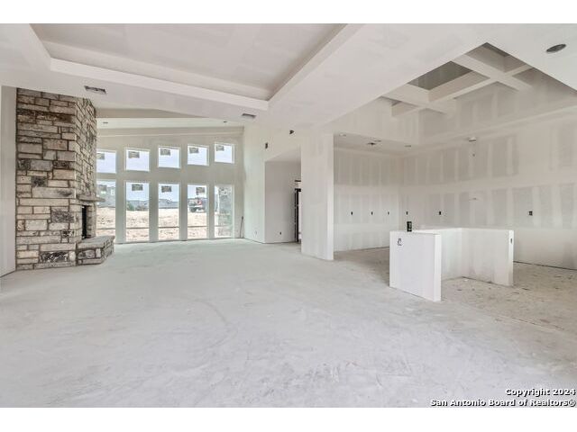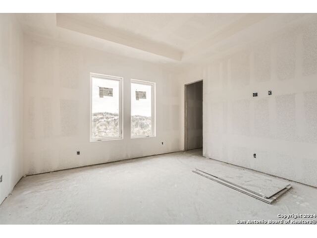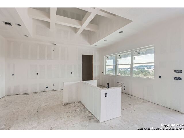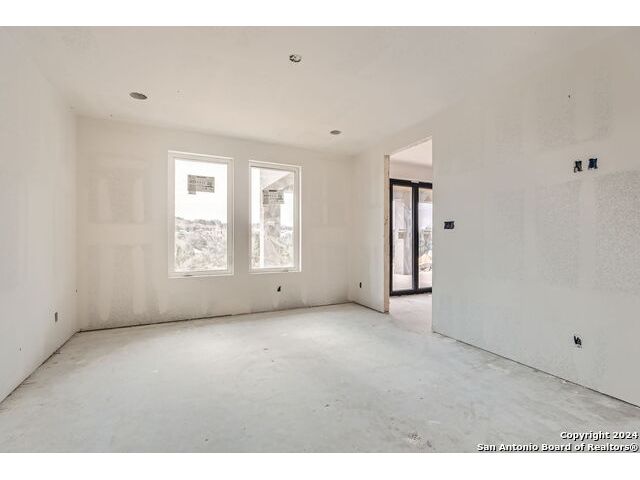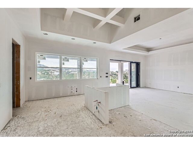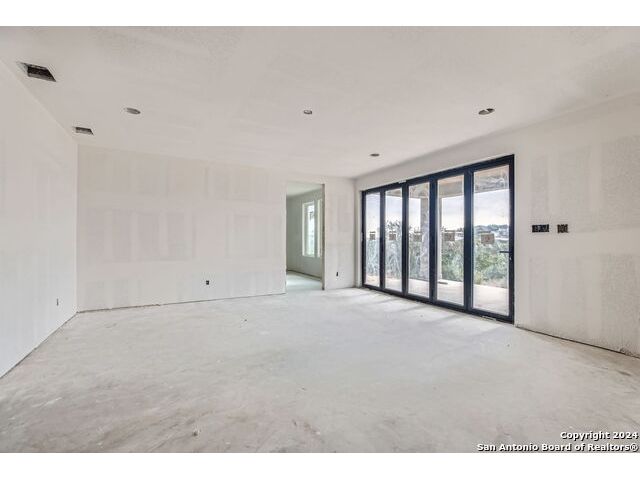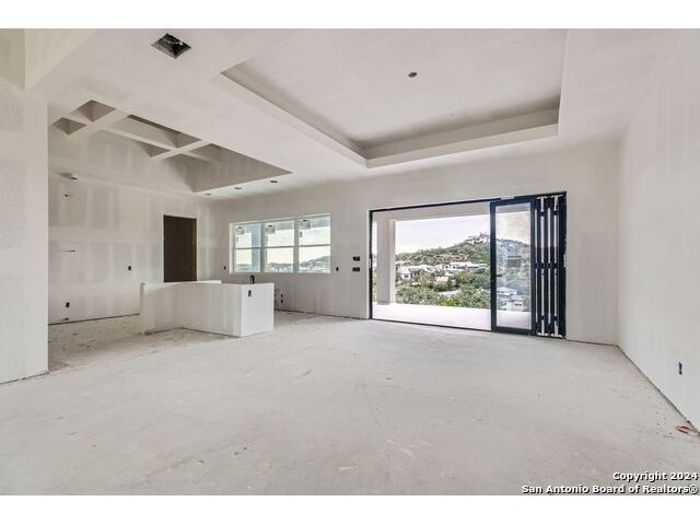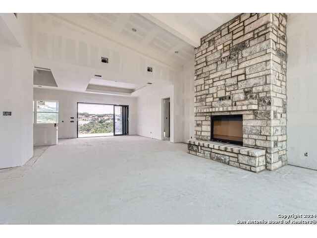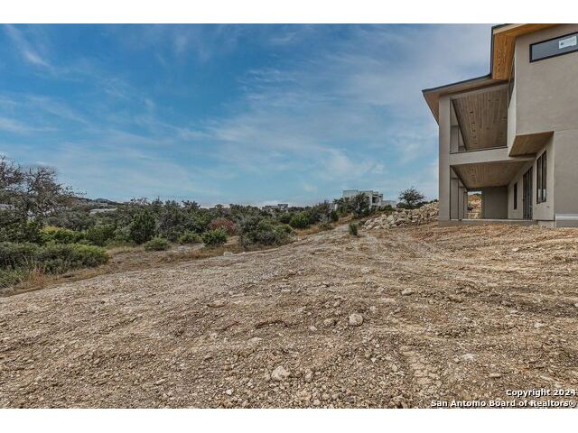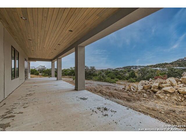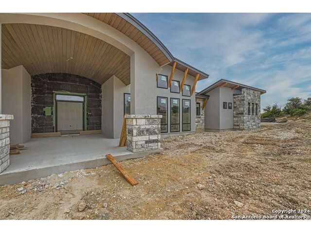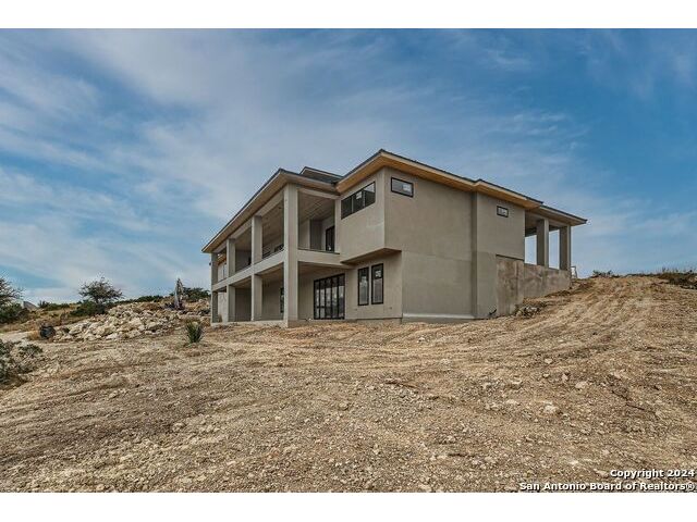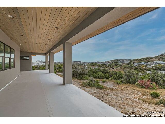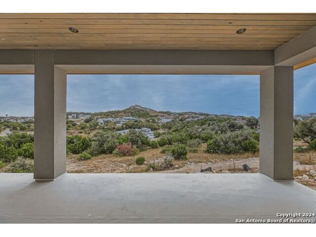 Experience the height of modern Hill Country living in this spectacular new construction, where functional design meets breathtaking panoramic views. This unique residence features an intelligent reverse floor plan and offers highly desirable main-level living, including two complete suites on the primary floor. Accessing the home is effortless with an oversized driveway leading to a spacious three car garage, offering ample parking and storage for all your needs. The main (upper) level is the heart of the home, featuring a grand, light-filled family room with beamed ceilings, a floor-to-ceiling stone fireplace, and expansive multi-sliding doors opening to a view-soaked covered patio. The chef's kitchen boasts an oversized island and designer finishes, perfect for hosting any gathering. The main level also houses the serene primary suite, a private sanctuary with a custom wood accent wall and tranquil vistas. A second, private guest suite (bedroom two) provides ideal accommodation for visitors. The secluded home office/study is perfectly positioned, offering a door to the covered porch for seamless indoor-outdoor accessibility. The lower level is dedicated to versatility, featuring two additional spacious bedrooms, a game room, and a second covered patio. Built with enduring quality - premium stone/stucco exterior, dramatic windows, and a resilient metal roof - this home sets a new standard for sophisticated, practical luxury in the exclusive, guard gated Canyons at Scenic Loop.
