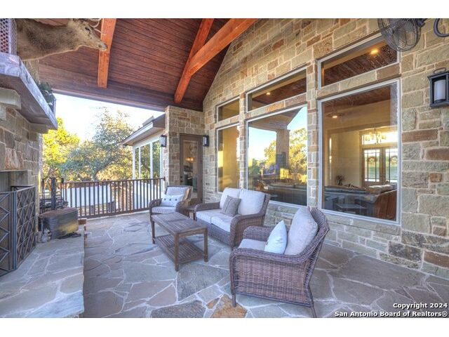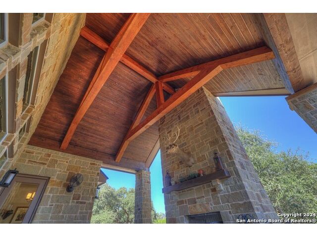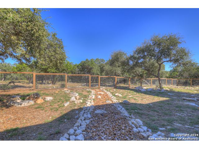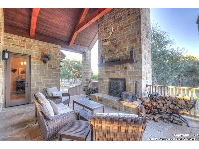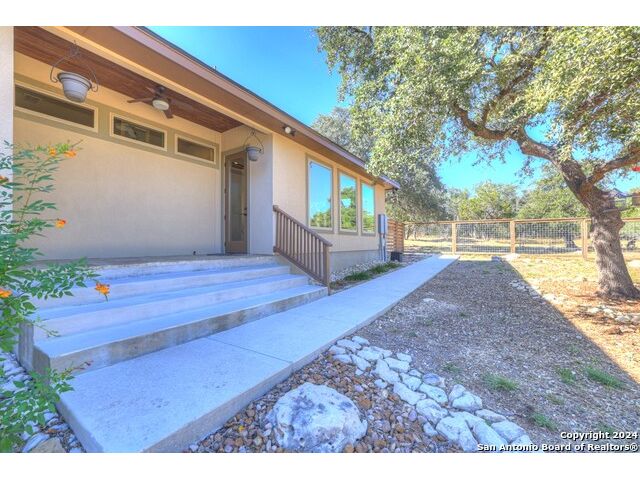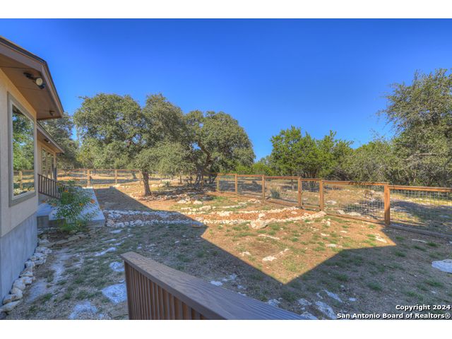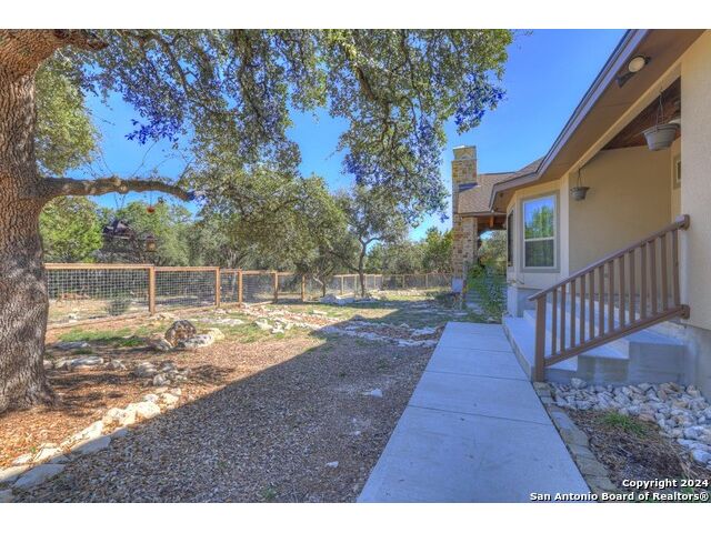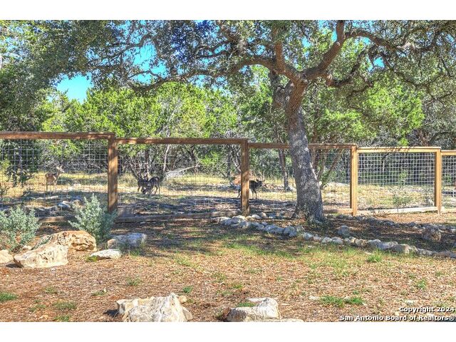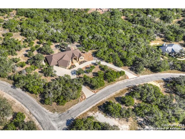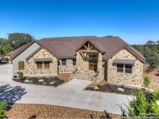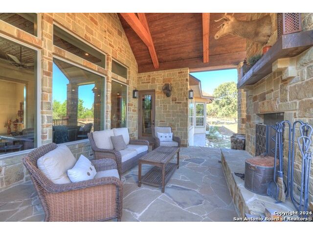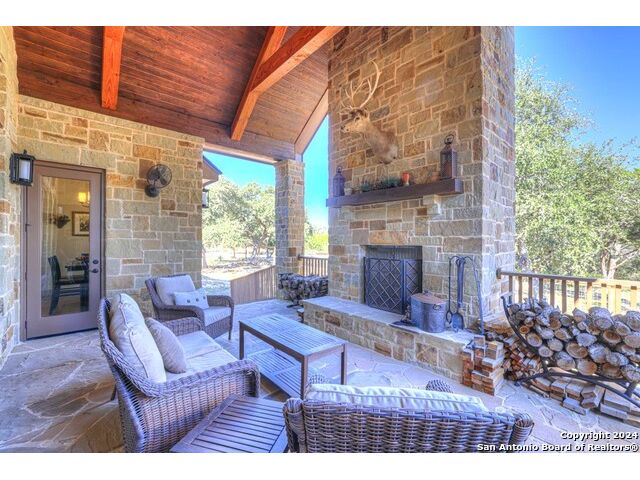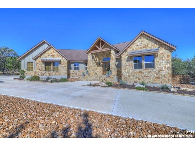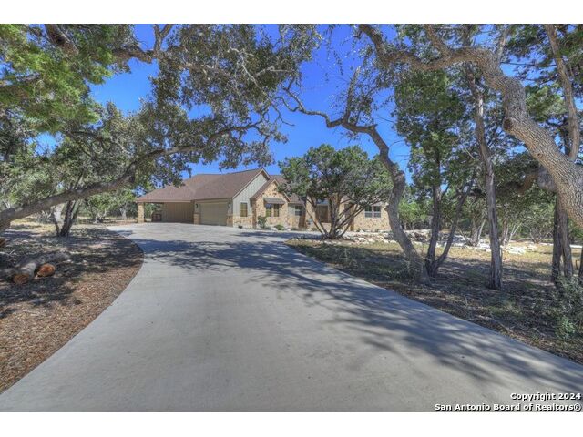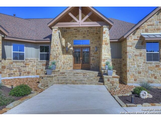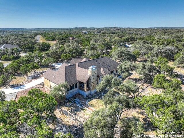 Situated on over 5 acres in the sought-after Serenity Oaks gated community of Spring Branch, this stunning custom home built in 2021 combines modern luxury with serene country living. Just under 4,000 sq ft, this lightly lived-in residence is thoughtfully designed to blend style, functionality, and comfort. The inviting entry features striking double mahogany doors, opening to wood-like tiled floors and an open-concept floor plan. The main living area showcases tongue-and-groove ceilings, while other rooms feature elegant beamed ceilings for added charm. The chef's kitchen is a true centerpiece, equipped with a large island, custom-built cabinetry, and propane cooking with a downdraft. The luxurious primary suite offers a spacious walk-in closet with reinforced framing for storms and safety, a spa-inspired bath with dual vanities, a walk-in shower, and a 6-foot soaking tub on a raised tub deck. Oversized secondary bedrooms provide comfort and versatility, and a fourth room can serve as an office or additional bedroom. A flexible bonus room with backyard access and 220v pre-wiring for a dry sauna is perfect for an exercise room, office or media room. Outdoor living spaces include multiple covered patios, one featuring a custom 4-sided stoned fireplace with a firewood cradle, perfect for entertaining. A fenced backyard offers security with access to the expansive property beyond. The porte-cochere, finished with a stained tongue-and-groove ceiling, complements the approximately 6,000 sq ft concrete half circle driveway. The oversized garage features an 18'x8' door, epoxy flooring, and ample shelving. This home is equipped with modern conveniences like a water softener, doorbell and exterior cameras, dual HVAC systems with PICO air filtration and UV lights, wood-trimmed windows, and 220v pre-wiring for a pool or hot tub. Surrounded by majestic oaks and natural beauty, this property offers a perfect retreat with endless possibilities. Welcome home!