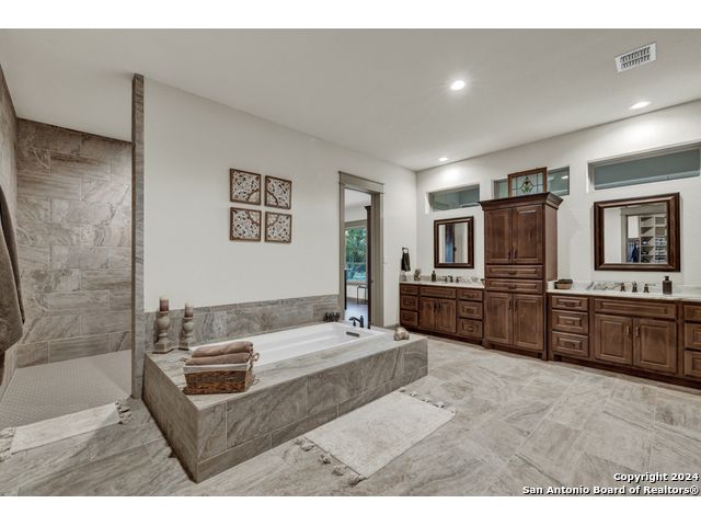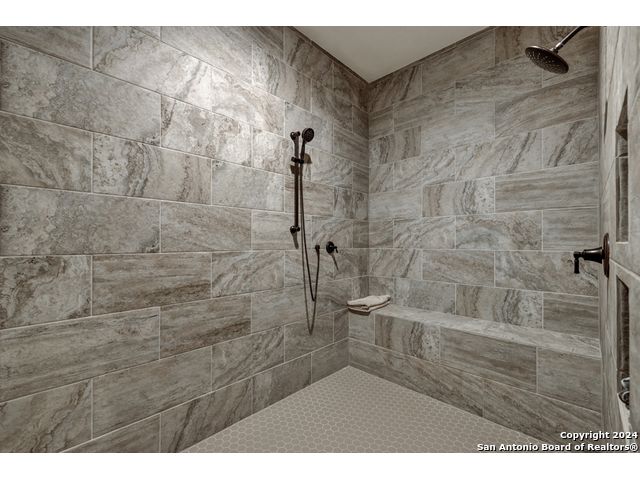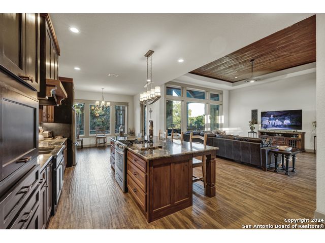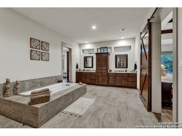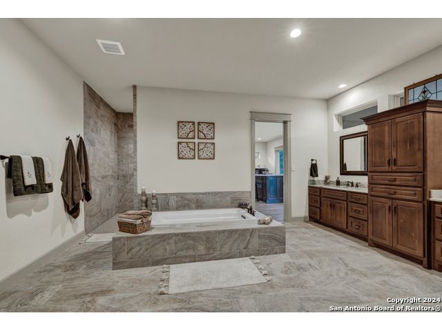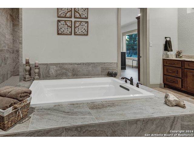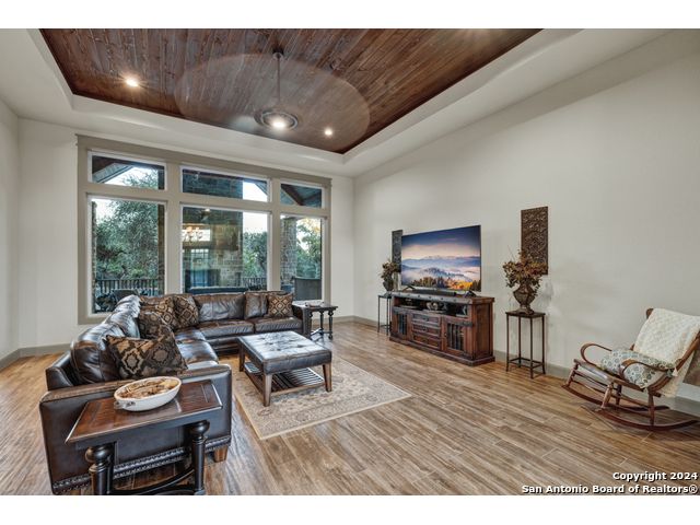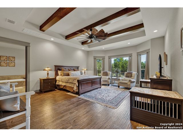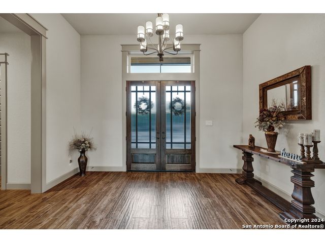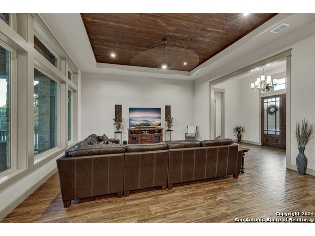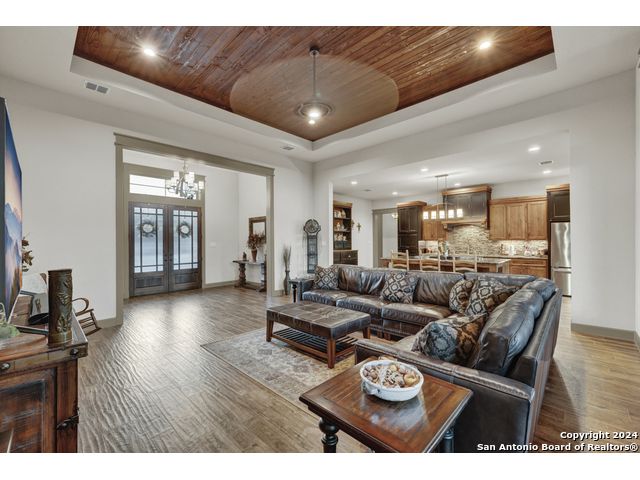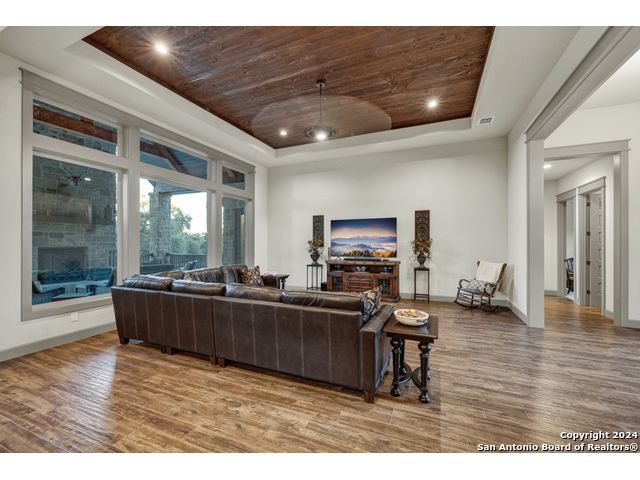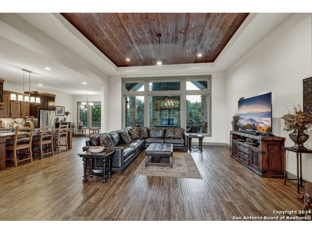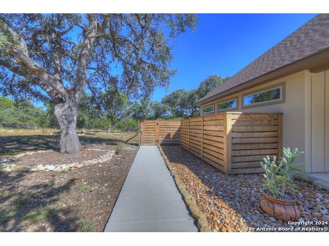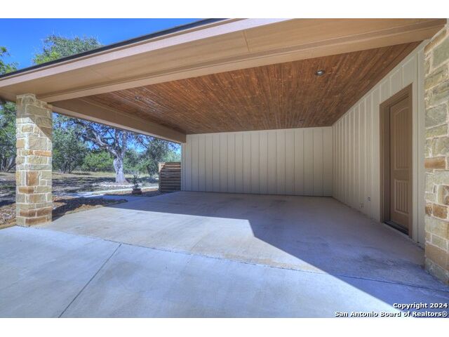 Situated on over 5 acres in the sought-after Serenity Oaks gated community of Spring Branch, this stunning custom home built in 2021 combines modern luxury with serene country living. Just under 4,000 sq ft, this lightly lived-in residence is thoughtfully designed to blend style, functionality, and comfort. The inviting entry features striking double mahogany doors, opening to wood-like tiled floors and an open-concept floor plan. The main living area showcases tongue-and-groove ceilings, while other rooms feature elegant beamed ceilings for added charm. The chef's kitchen is a true centerpiece, equipped with a large island, custom-built cabinetry, and propane cooking with a downdraft. The luxurious primary suite offers a spacious walk-in closet with reinforced framing for storms and safety, a spa-inspired bath with dual vanities, a walk-in shower, and a 6-foot soaking tub on a raised tub deck. Oversized secondary bedrooms provide comfort and versatility, and a fourth room can serve as an office or additional bedroom. A flexible bonus room with backyard access and 220v pre-wiring for a dry sauna is perfect for an exercise room, office or media room. Outdoor living spaces include multiple covered patios, one featuring a custom 4-sided stoned fireplace with a firewood cradle, perfect for entertaining. A fenced backyard offers security with access to the expansive property beyond. The porte-cochere, finished with a stained tongue-and-groove ceiling, complements the approximately 6,000 sq ft concrete half circle driveway. The oversized garage features an 18'x8' door, epoxy flooring, and ample shelving. This home is equipped with modern conveniences like a water softener, doorbell and exterior cameras, dual HVAC systems with PICO air filtration and UV lights, wood-trimmed windows, and 220v pre-wiring for a pool or hot tub. Surrounded by majestic oaks and natural beauty, this property offers a perfect retreat with endless possibilities. Welcome home!
