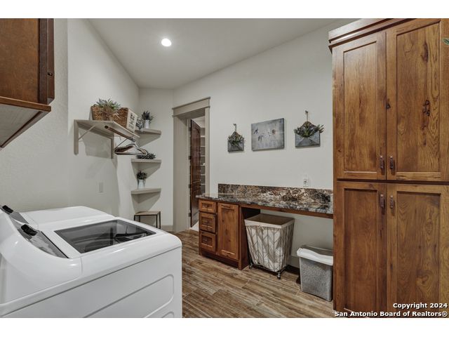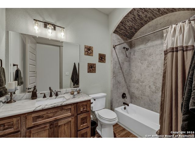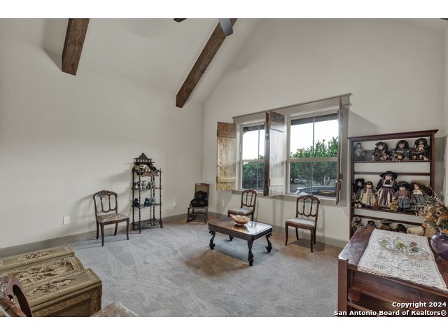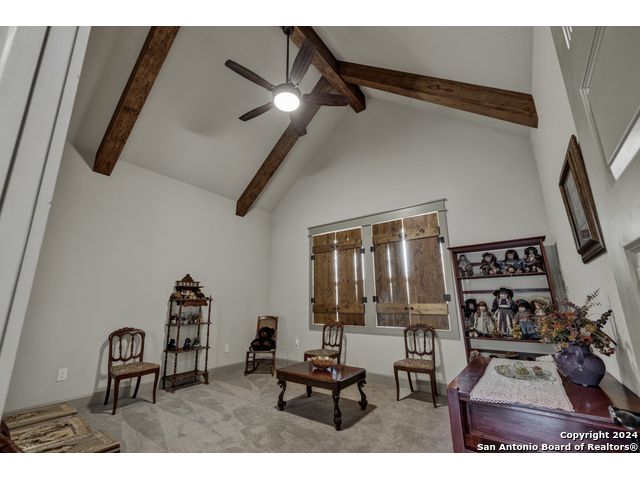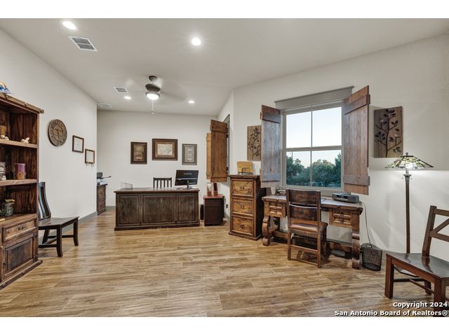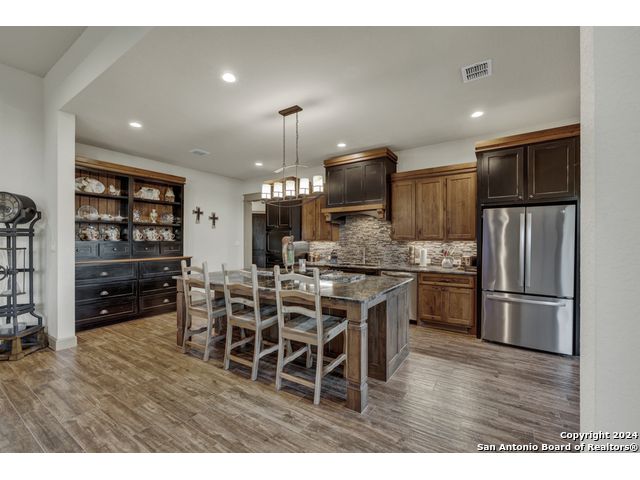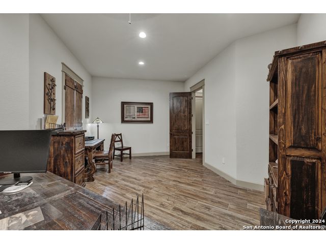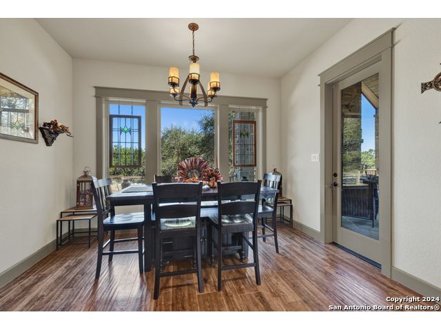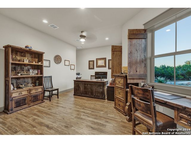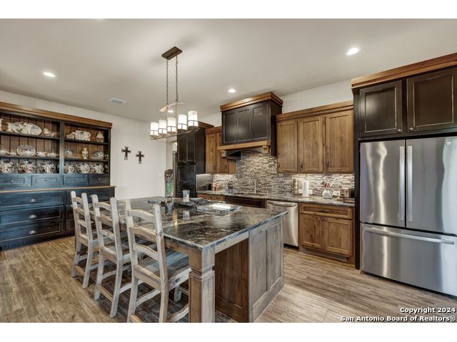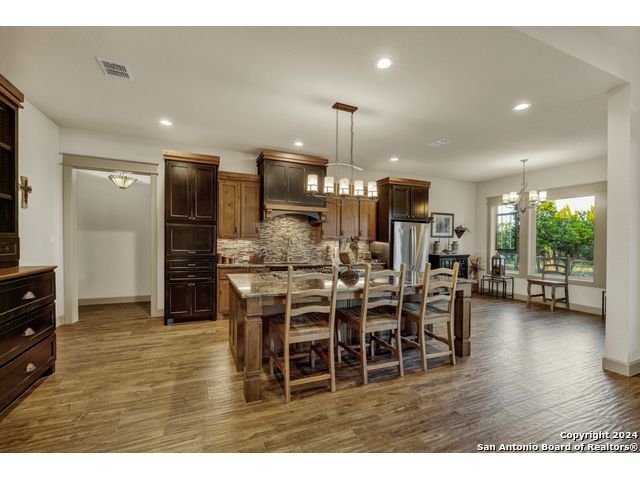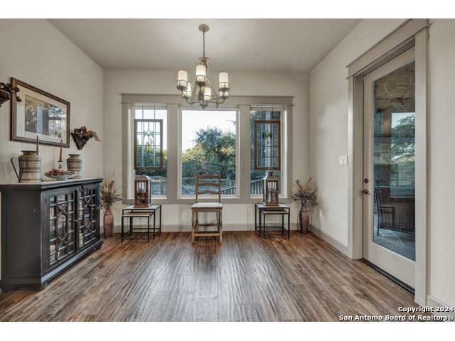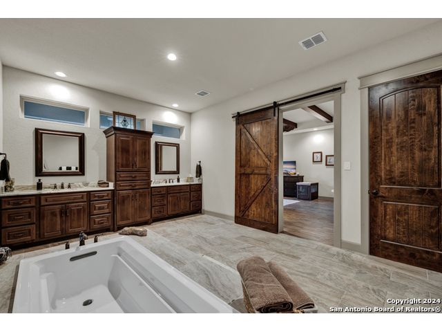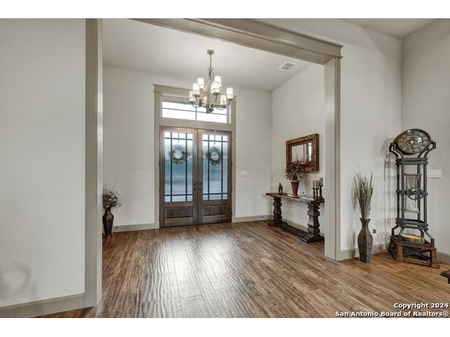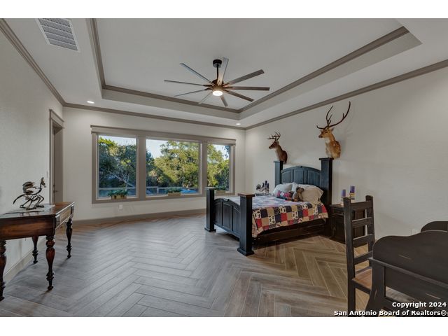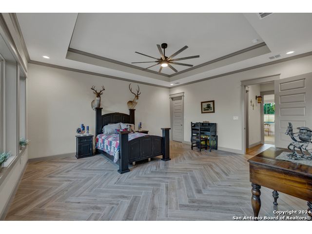 Situated on over 5 acres in the sought-after Serenity Oaks gated community of Spring Branch, this stunning custom home built in 2021 combines modern luxury with serene country living. Just under 4,000 sq ft, this lightly lived-in residence is thoughtfully designed to blend style, functionality, and comfort. The inviting entry features striking double mahogany doors, opening to wood-like tiled floors and an open-concept floor plan. The main living area showcases tongue-and-groove ceilings, while other rooms feature elegant beamed ceilings for added charm. The chef's kitchen is a true centerpiece, equipped with a large island, custom-built cabinetry, and propane cooking with a downdraft. The luxurious primary suite offers a spacious walk-in closet with reinforced framing for storms and safety, a spa-inspired bath with dual vanities, a walk-in shower, and a 6-foot soaking tub on a raised tub deck. Oversized secondary bedrooms provide comfort and versatility, and a fourth room can serve as an office or additional bedroom. A flexible bonus room with backyard access and 220v pre-wiring for a dry sauna is perfect for an exercise room, office or media room. Outdoor living spaces include multiple covered patios, one featuring a custom 4-sided stoned fireplace with a firewood cradle, perfect for entertaining. A fenced backyard offers security with access to the expansive property beyond. The porte-cochere, finished with a stained tongue-and-groove ceiling, complements the approximately 6,000 sq ft concrete half circle driveway. The oversized garage features an 18'x8' door, epoxy flooring, and ample shelving. This home is equipped with modern conveniences like a water softener, doorbell and exterior cameras, dual HVAC systems with PICO air filtration and UV lights, wood-trimmed windows, and 220v pre-wiring for a pool or hot tub. Surrounded by majestic oaks and natural beauty, this property offers a perfect retreat with endless possibilities. Welcome home!