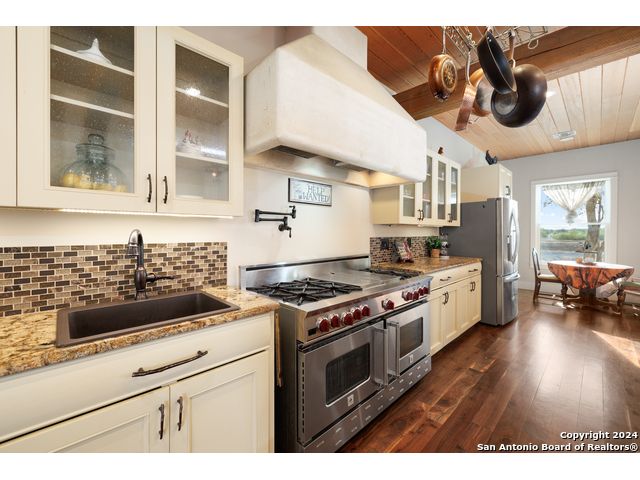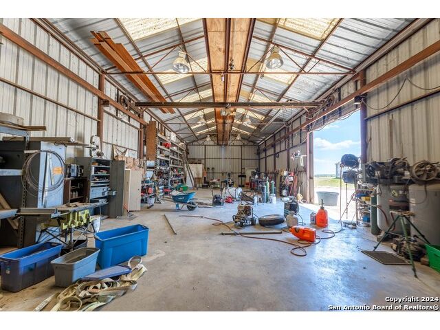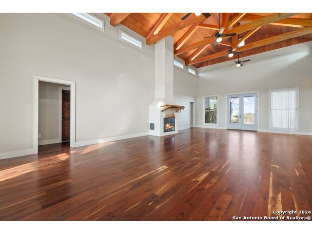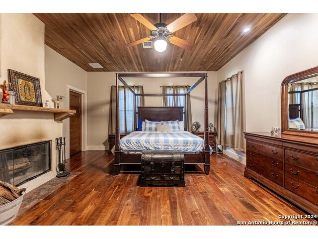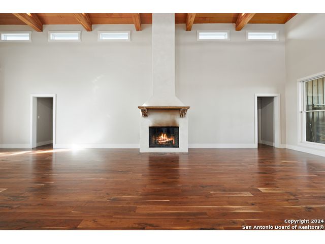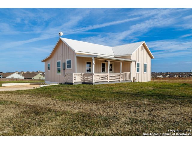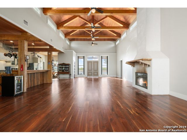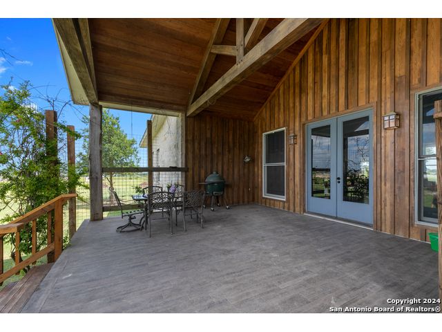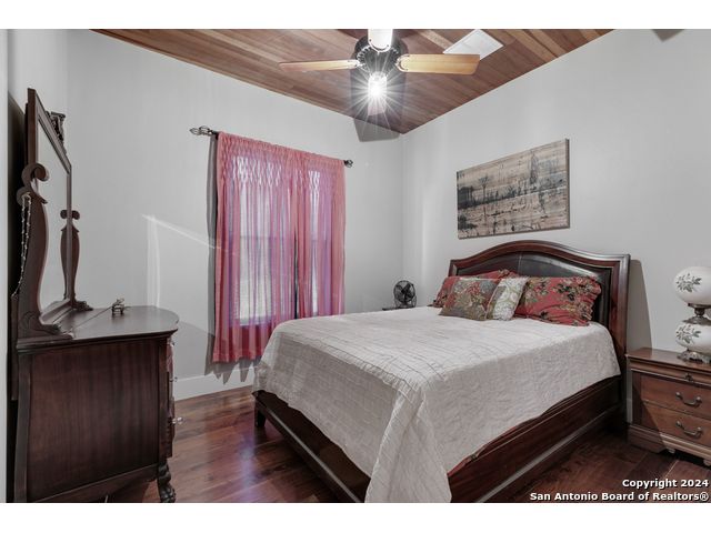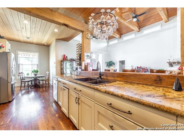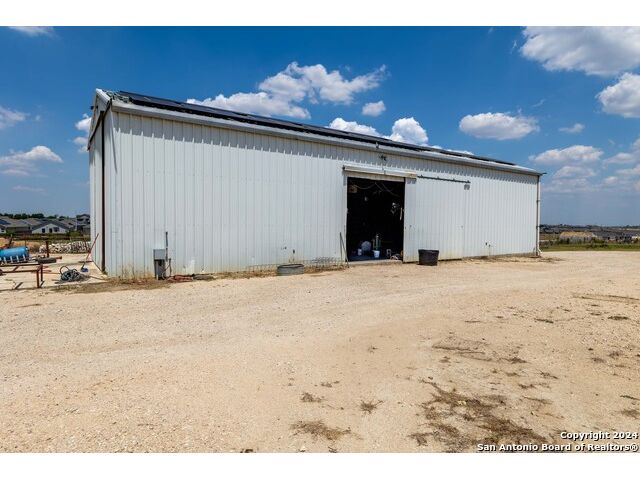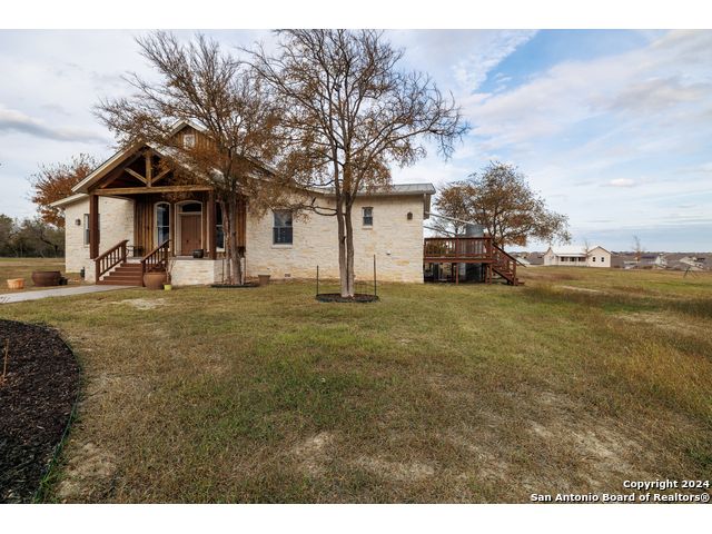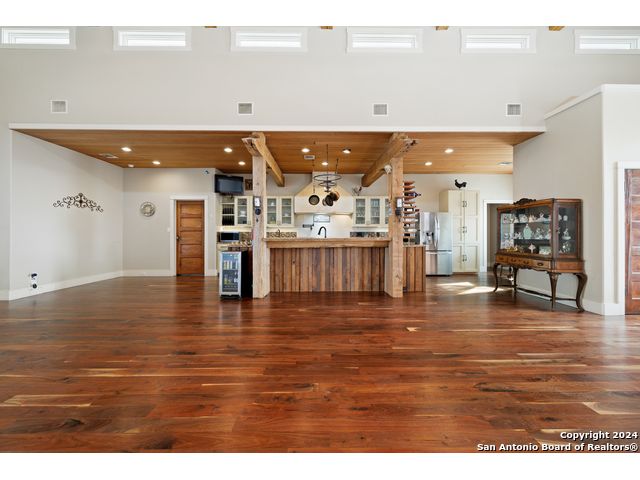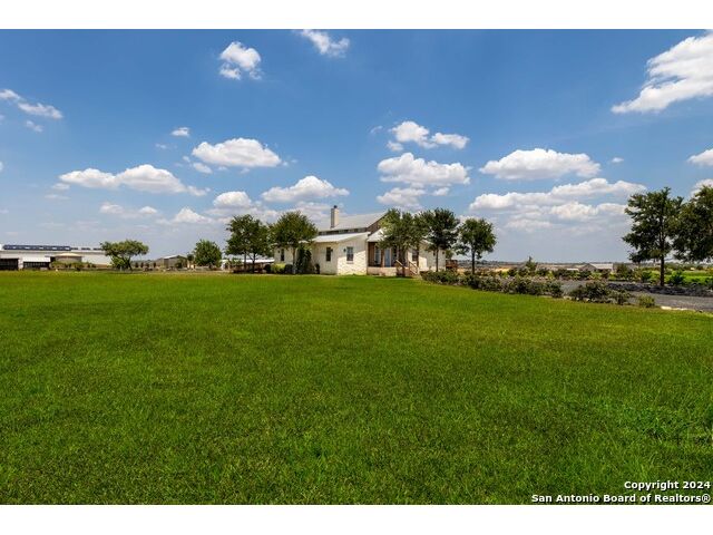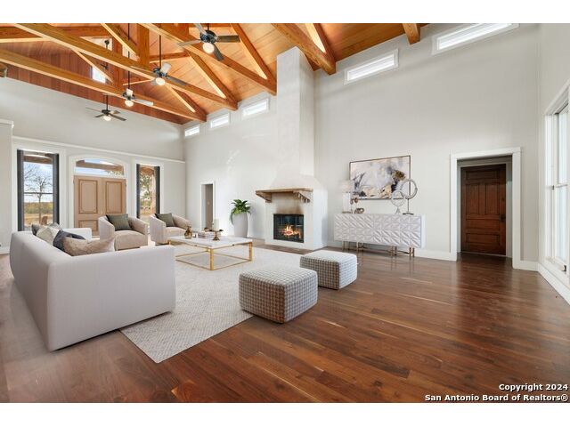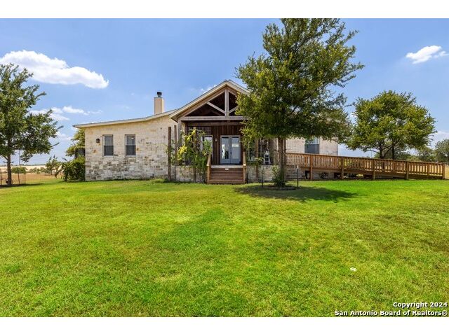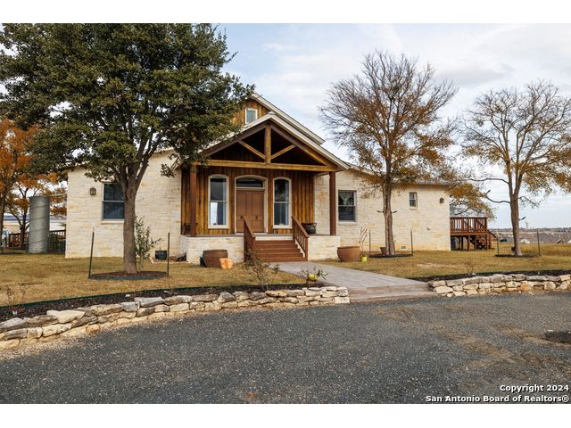 Nestled on expansive land, this home draws inspiration from an old Fredericksburg barn, blending rustic charm with modern craftsmanship. This custom 4,200 sq ft home has a split-bedroom layout on the main level, offering a private master suite with a fireplace, walk-in shower, and hydrotherapy tub, while three additional bedrooms and two baths sit on the opposite wing. The heart of the home boasts soaring vaulted ceilings framed with East Texas yellow pine timber, reclaimed bleacher seat planks, and 5" black walnut floors showcasing stunning grain variations. The fully finished basement features a bedroom, family room, full bath, and secure room, while foam insulation ensures energy efficiency. Rainwater harvesting systems, a 90' well, and solar panels complement the eco-friendly design. A spacious 2,400 sq ft, 17' ceiling, metal building with sliding doors and an additional 1,100 sq. ft. dwelling expand the property's versatility. Located just outside of New Braunfels city limits on over 10 acres, this one-of-a-kind Texas haven, offering unparalleled character, sustainability, and functionality.