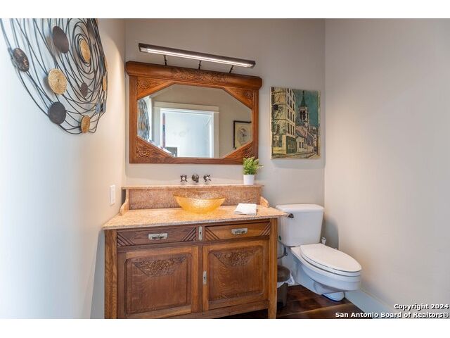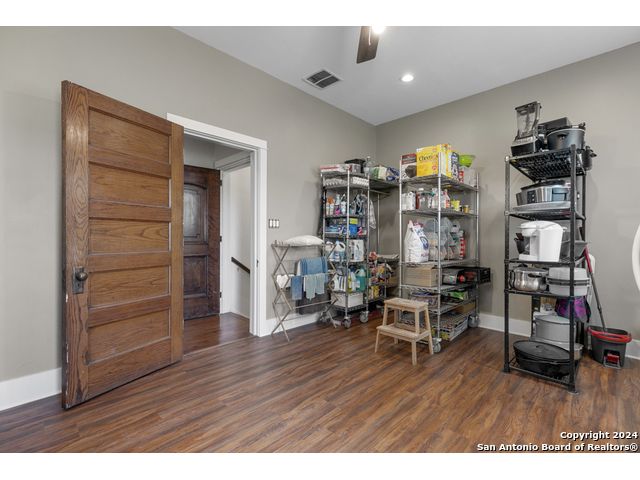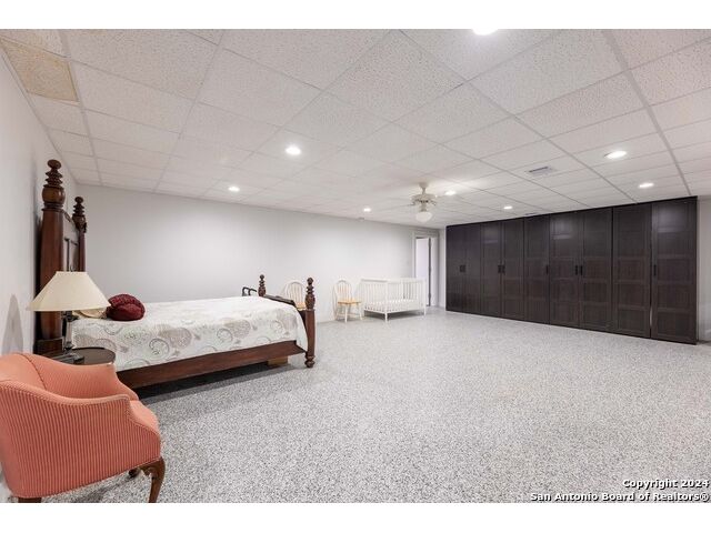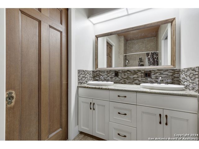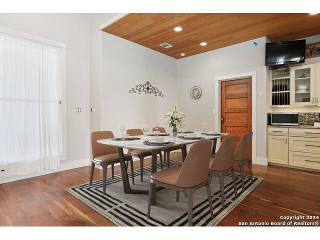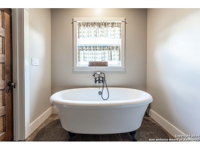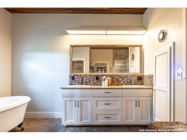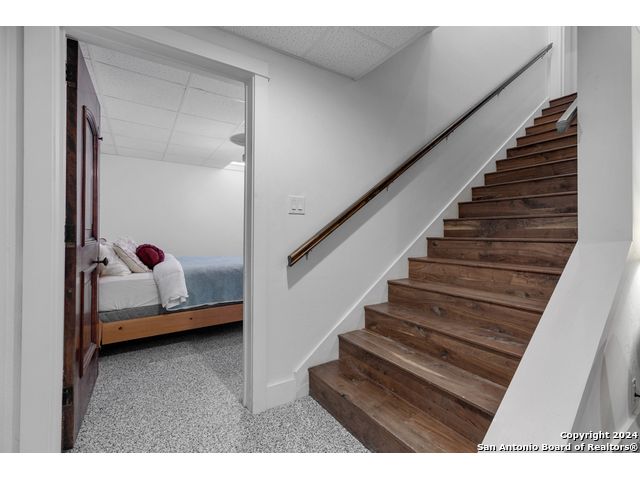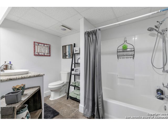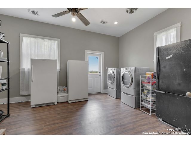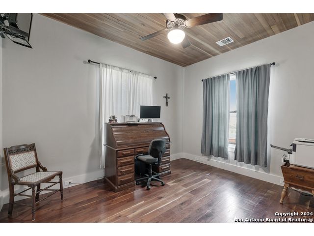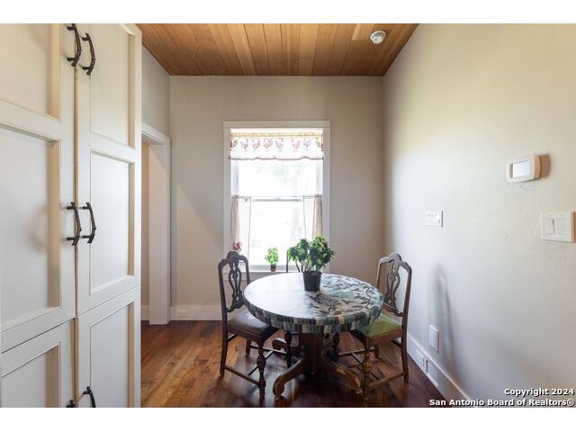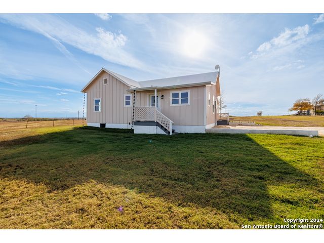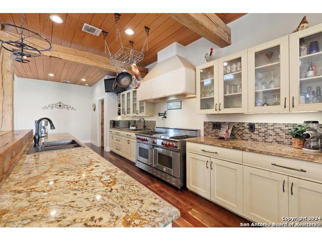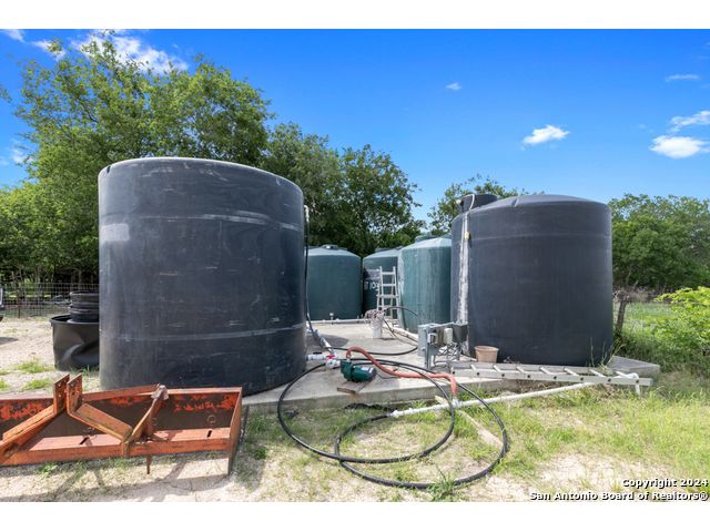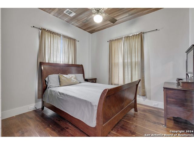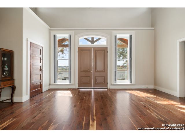Nestled on expansive land, this home draws inspiration from an old Fredericksburg barn, blending rustic charm with modern craftsmanship. This custom 4,200 sq ft home has a split-bedroom layout on the main level, offering a private master suite with a fireplace, walk-in shower, and hydrotherapy tub, while three additional bedrooms and two baths sit on the opposite wing. The heart of the home boasts soaring vaulted ceilings framed with East Texas yellow pine timber, reclaimed bleacher seat planks, and 5" black walnut floors showcasing stunning grain variations. The fully finished basement features a bedroom, family room, full bath, and secure room, while foam insulation ensures energy efficiency. Rainwater harvesting systems, a 90' well, and solar panels complement the eco-friendly design. A spacious 2,400 sq ft, 17' ceiling, metal building with sliding doors and an additional 1,100 sq. ft. dwelling expand the property's versatility. Located just outside of New Braunfels city limits on over 10 acres, this one-of-a-kind Texas haven, offering unparalleled character, sustainability, and functionality.