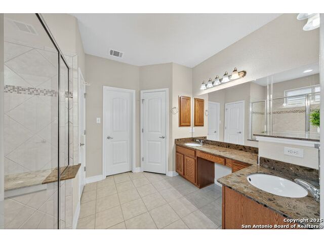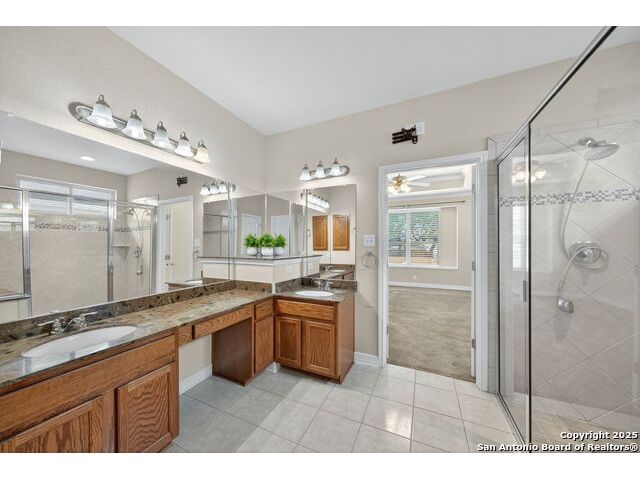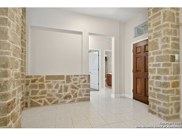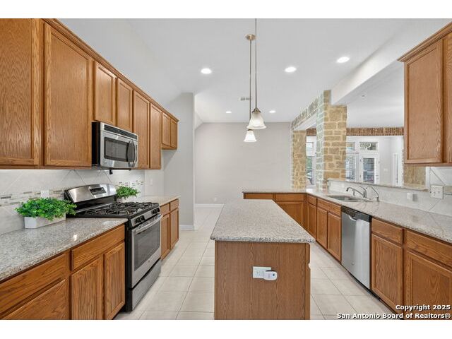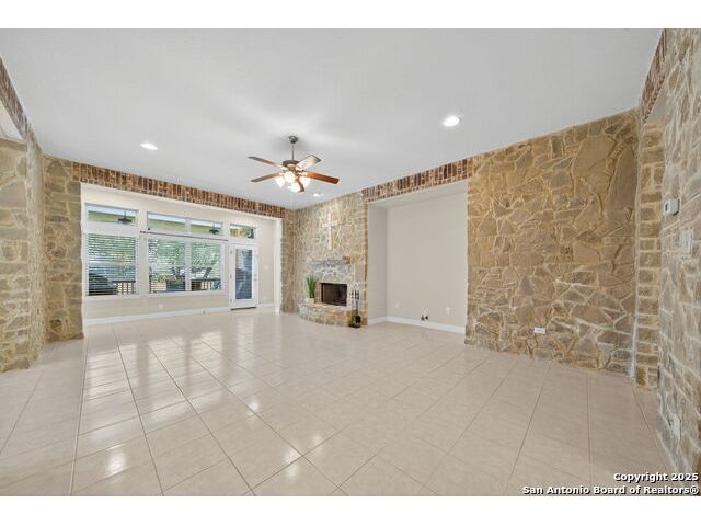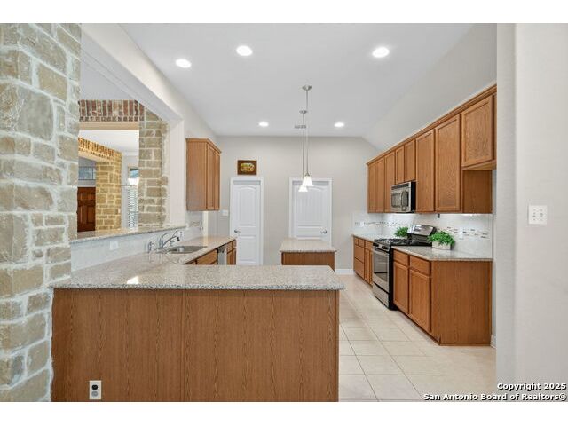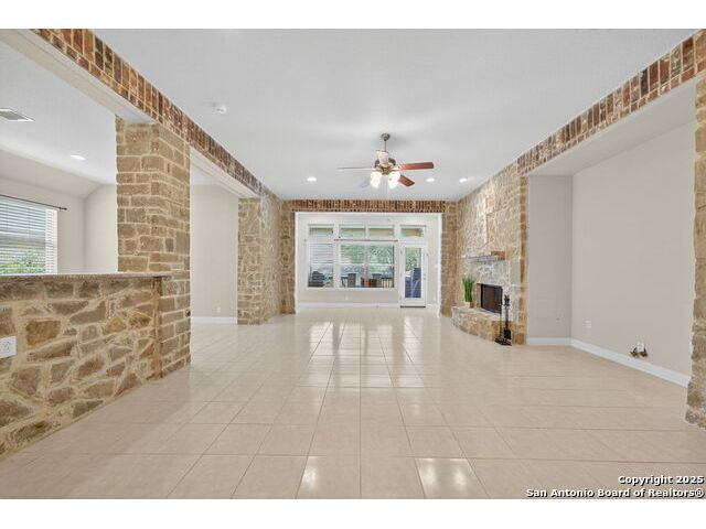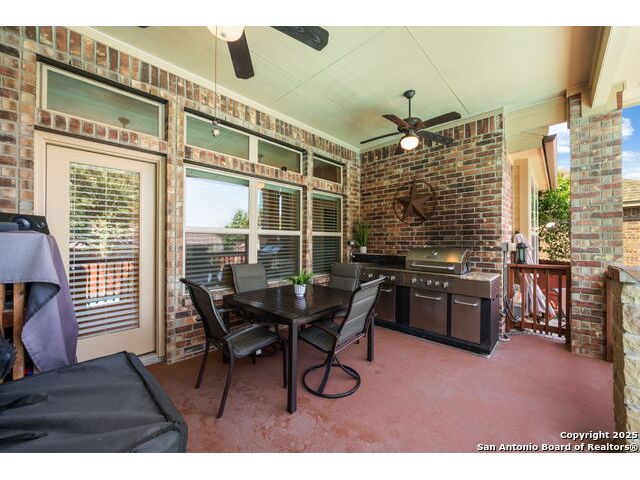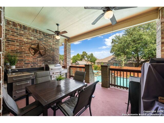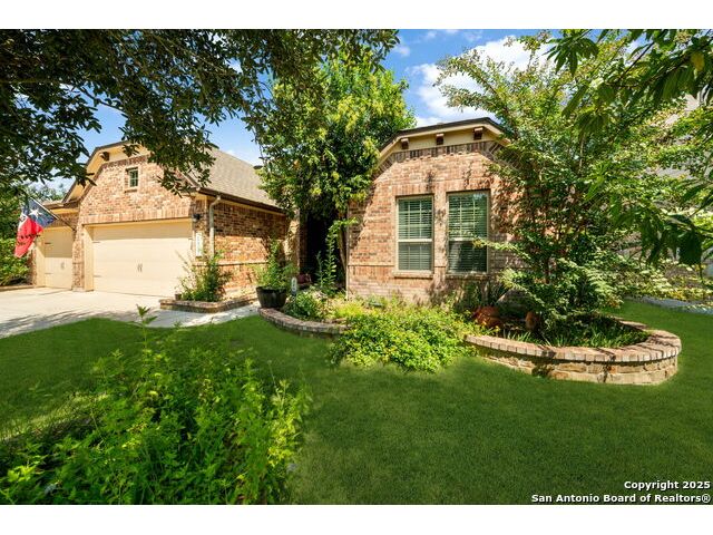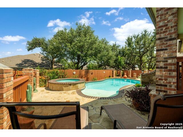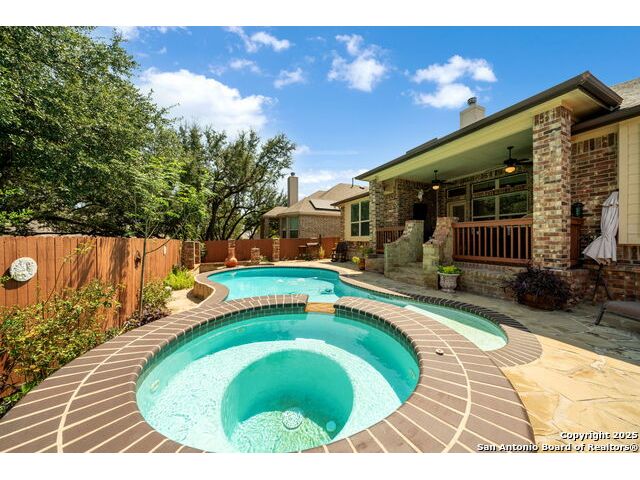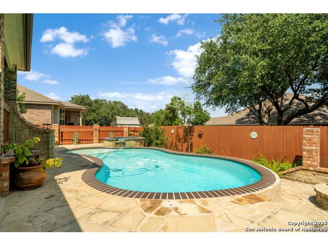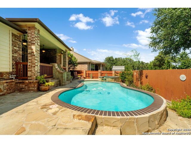 Experience Hill Country elegance in this beautifully crafted single-story residence located in the gated community of Balcones Creek. Designed to impress, this home offers 2,316 square feet of thoughtfully planned living space with four spacious bedrooms, three bathrooms, and a formal dining area. At the heart of the home, a floor-to-ceiling stone fireplace with custom hearth and brick mantle serves as a stunning centerpiece, complemented by soaring tray ceilings and abundant natural light. Expansive sight lines connect the inviting family room to the gourmet kitchen, where upgraded granite countertops, rich cabinetry, a large center island, and stainless steel appliances create the perfect setting for everyday living and entertaining. The serene primary suite offers a luxurious retreat, featuring dual vanities, a walk-in shower, and a generous closet. Secondary bedrooms provide flexibility for family, guests, or a dedicated office. Throughout the home, custom rock and brickwork elevates the architectural character, with the living room fireplace designed to the ceiling and a cross inlay seamlessly worked into the stone. Stepping outside, you'll discover a private backyard oasis built for relaxation and entertaining. A covered patio overlooks the sparkling pool and spa, surrounded by thoughtful upgrades that include a custom rocked firepit, brick light columns, curved rock patio stairwell, brick-framed benches, and an outdoor kitchen designed for alfresco gatherings. Extensive exterior stonework continues throughout, from the stucco chimney to the brick patio columns, ensuring a timeless and durable finish that sets this property apart. Custom LED lighting illuminates both interior and exterior spaces, including the pool and spa, creating an inviting ambiance after sunset. This home is as functional as it is beautiful, featuring a smart home system with alarm and full irrigation, a CPS-approved $30,000 home power backup system with discreet south-facing panels, and the highly desirable Tesla Powerwall 3-an industry-leading backup power solution eligible for a 30 rebate from the federal government. Garden enthusiasts will appreciate the raised vegetable and herb garden with internet-controlled irrigation that extends to backyard flower beds, while those who enjoy poolside living will benefit from the recently rebuilt pool and spa equipment, complete with new display, valves, pump, and natural gas heating for efficient year-round use. A new HVAC system, with most critical components replaced in 2025 and under warranty, provides peace of mind for years to come. Balcones Creek is a premier Hill Country community offering gated privacy, a planned junior Olympic pool, scenic trails, and close proximity to Boerne's charming Main Street, top-rated schools, and the conveniences of San Antonio just minutes away. Whether enjoying quiet evenings under the Hill Country sky or hosting unforgettable gatherings by the pool, this property offers a lifestyle that is both elevated and enduring.