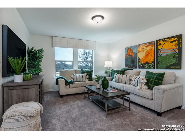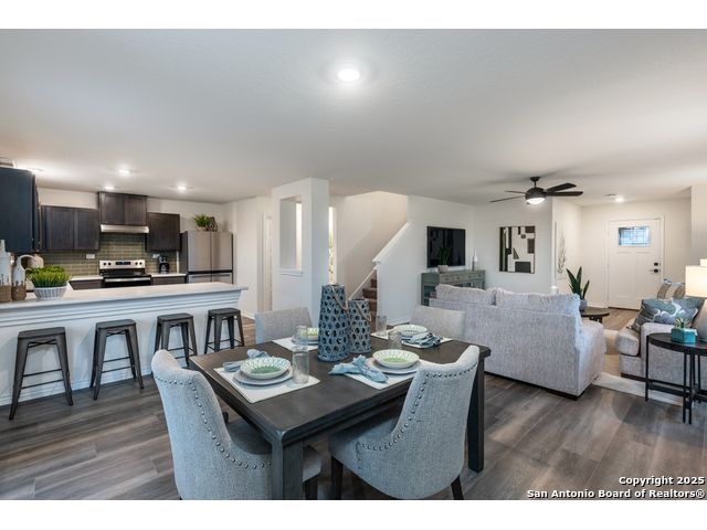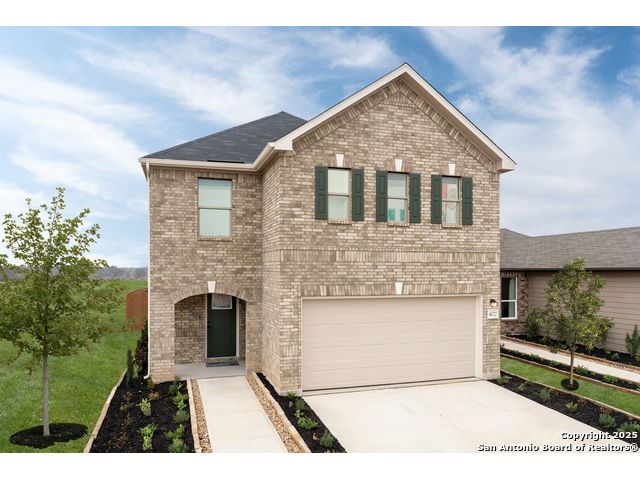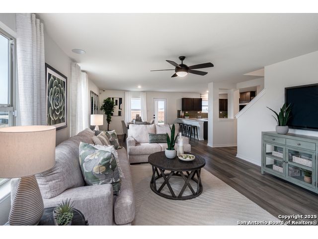 Discover modern living in this beautifully designed home featuring an open floor plan and stylish finishes. The kitchen impresses with Whirlpool stainless steel appliances, Woodmont Dakota Shaker panel 30-in. upper cabinets, an extended breakfast bar, an Emser tile backsplash, and a Moen Sleek high arc faucet. The primary bath offers an extended cabinet with knee space, upgraded cabinets, and a luxurious 42-in. shower with Emser tile surround. Decorative touches include a classic ceiling fan in the great room, a Sherwin-Williams Accessible Beige Monterey-style entry door, and Kwikset Ladera interior door hardware. Additional highlights include a wireless security system, durable vinyl plank flooring, a covered patio, and an automatic sprinkler system for outdoor convenience.