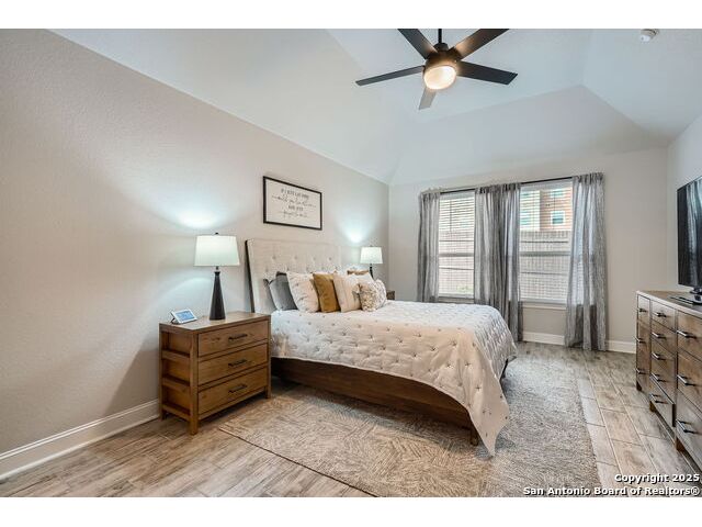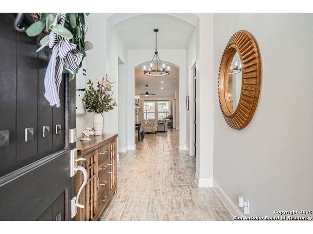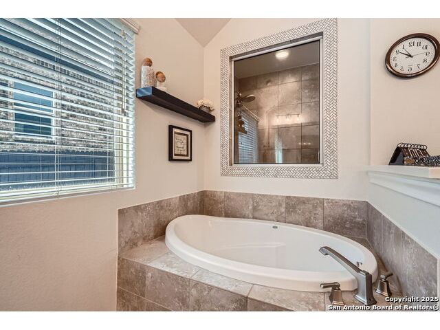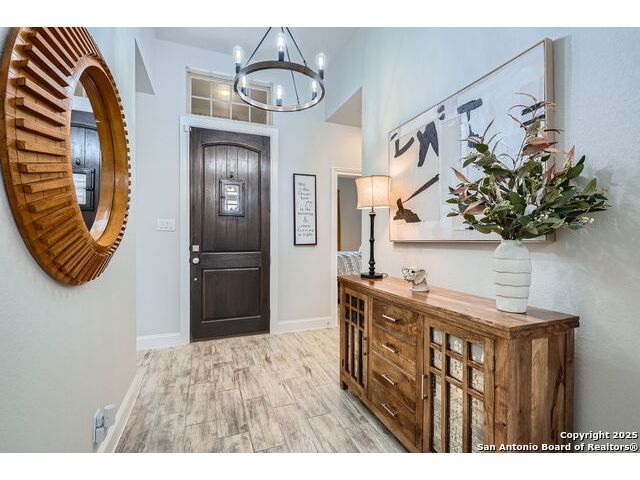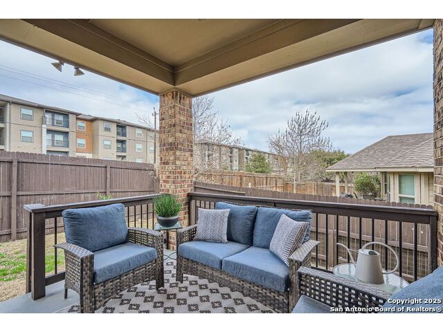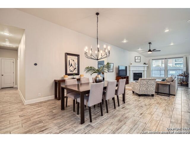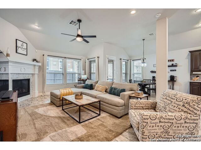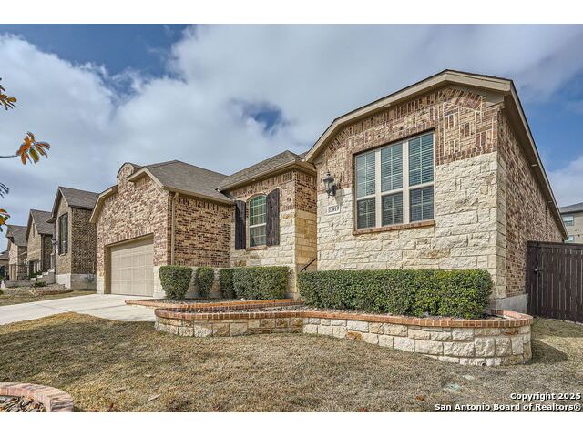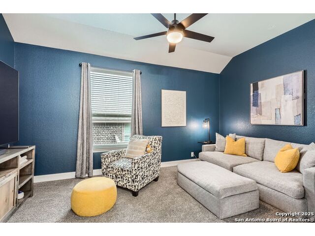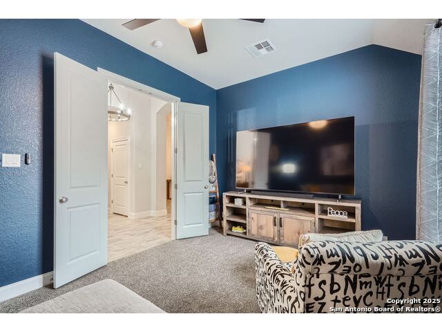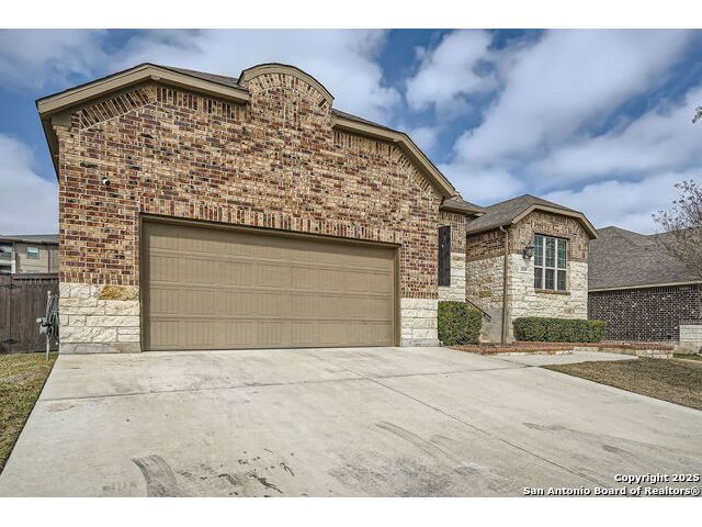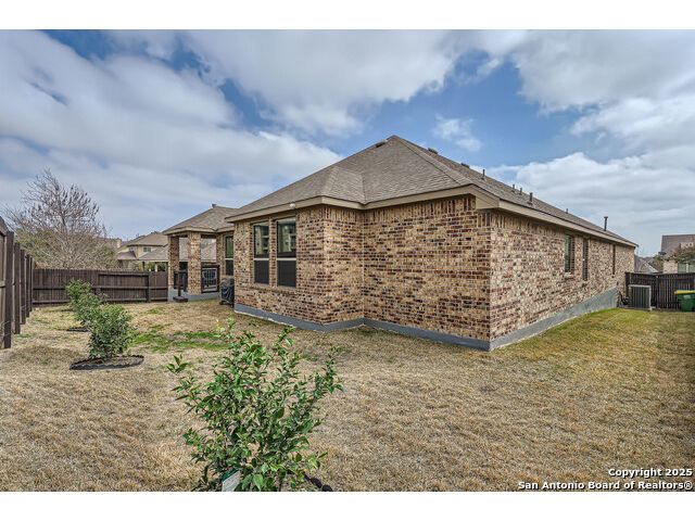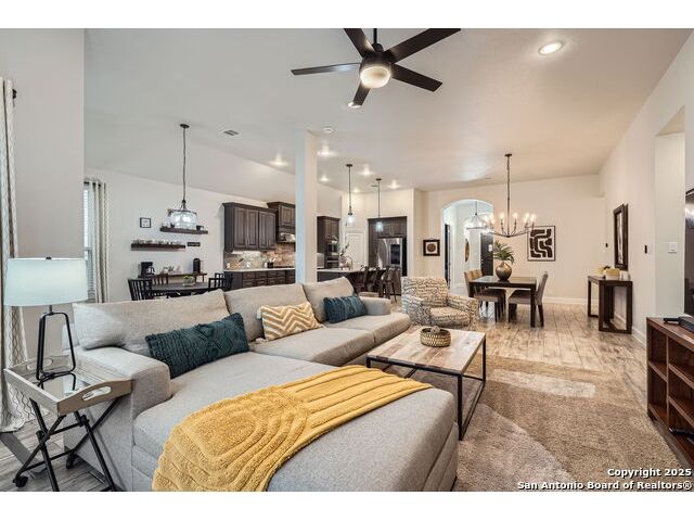 This move-in ready, meticulously maintained 3,033 SqFt single story Highland Homes design in Fronterra at Westpointe demonstrates the owner's commitment to both aesthetics and functionality. The freshly painted interior, including ceilings, creates a pristine canvas, while new light fixtures throughout add contemporary polish. The residence's open layout creates natural flow between the island kitchen, where a gas cooktop and stainless steel appliances await the home chef, and a welcoming family room anchored by a corner fireplace. Recent upgrades extend the ceramic tile from main living areas into the office and bedrooms, creating seamless visual continuity. The media room and primary bedroom closets feature new premium-grade carpet, adding comfort underfoot in these spaces. The primary suite stands out with its generous proportions and sophisticated bathroom featuring dual vanities connected by a seated makeup counter. 3M window tinting on the primary bath and rear-facing windows provides enhanced privacy and energy efficiency. A dedicated home office comes equipped with custom built-ins, perfect for today's flexible work arrangements. A new glass door system opens to the expansive covered patio, creating an effortless transition to outdoor living. As evening falls, custom LED soffit lighting illuminates the exterior, highlighting architectural details. The front landscape features distinctive masonry planters that add structural interest and low-maintenance curb appeal, complemented by newly installed privacy landscaping in the backyard. With four bedrooms and three and a half baths, this residence offers plenty of room for family life and guests, while its location within the respected Northside ISD ensures educational excellence is just minutes away. The home is within walking distance to the community pool, clubhouse, covered playground as well as Harmony School of Science and Brennan High School. Location highlights include just minutes to Lackland AFB and Seaworld/Aquatica Water Park, close proximity to shopping and entertainment, with easy access to 1604 and 151. The three car tandem garage provides ample space for vehicles and storage. This thoughtfully designed and thoroughly updated home creates an environment that adapts seamlessly to both quiet evenings at home and lively weekend entertaining. Seller concessions are available as well as a 4.75 interest rate VA assumable loan. Preferred lender is offering a 1% lender concession for the buyer to use towards closing costs and/or interest rate buydown.
