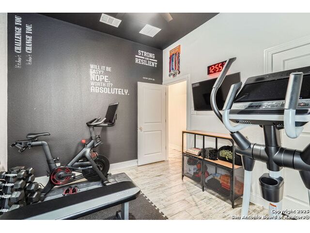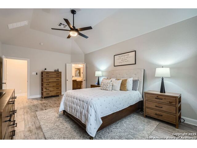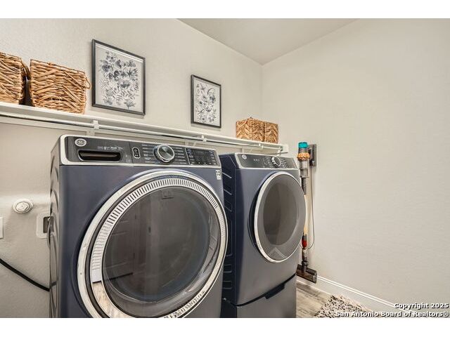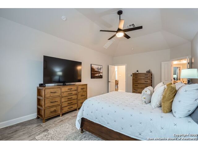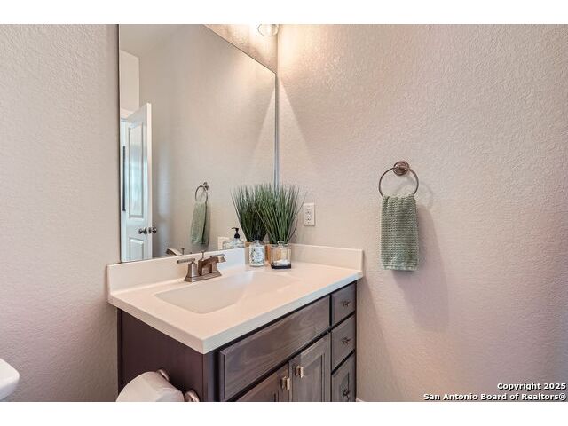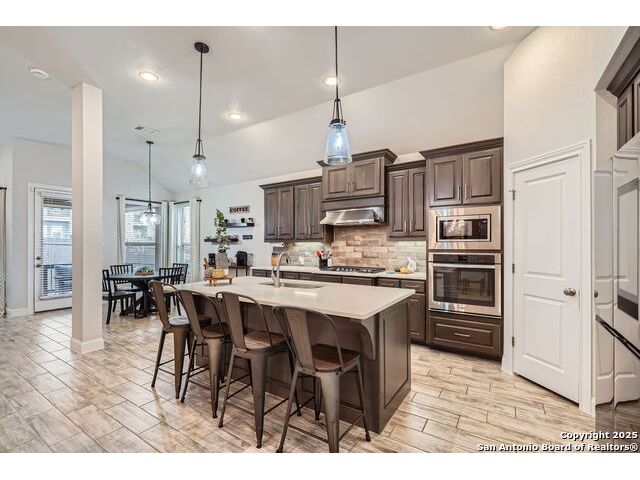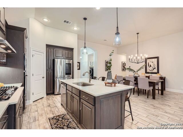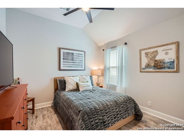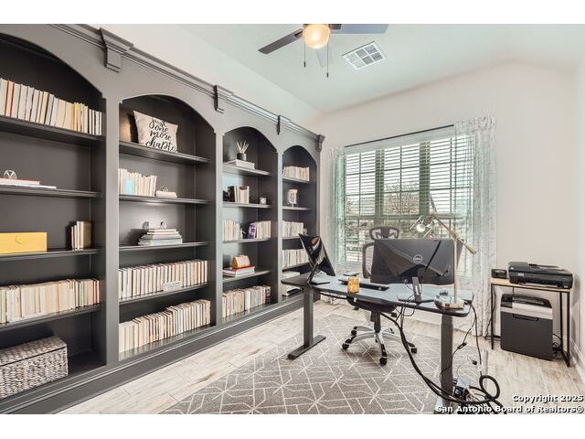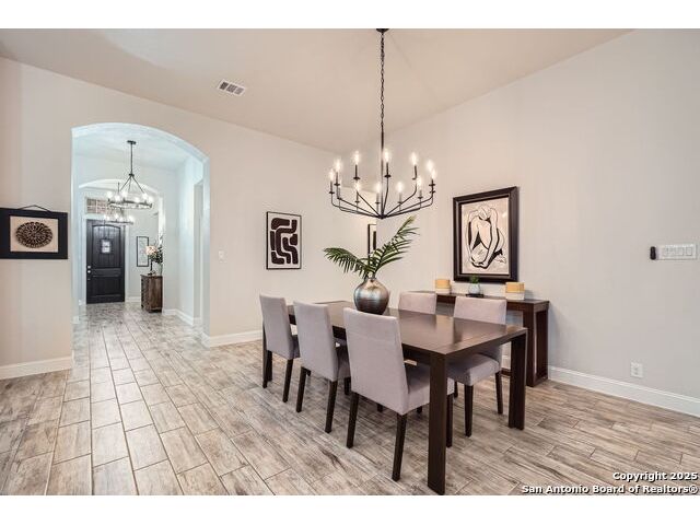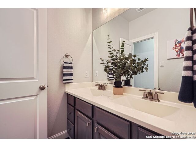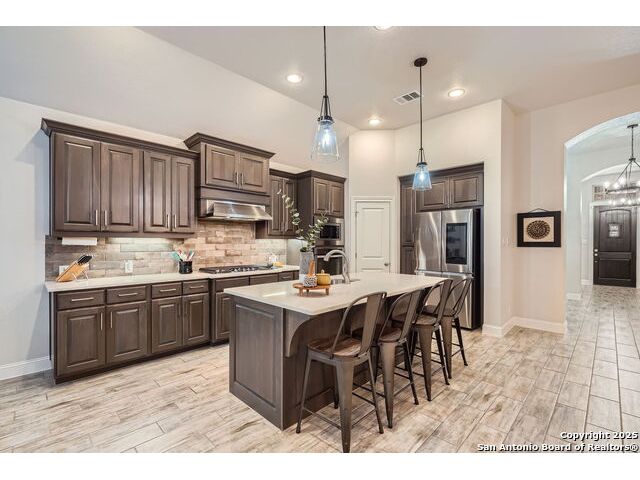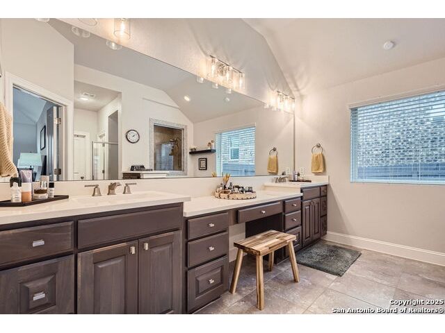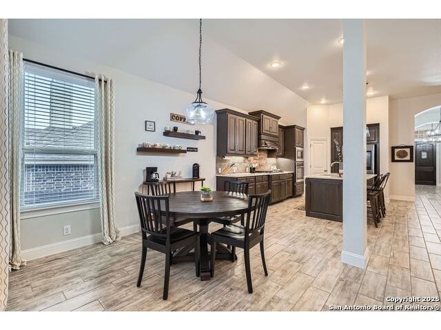 This move-in ready, meticulously maintained 3,033 SqFt single story Highland Homes design in Fronterra at Westpointe demonstrates the owner's commitment to both aesthetics and functionality. The freshly painted interior, including ceilings, creates a pristine canvas, while new light fixtures throughout add contemporary polish. The residence's open layout creates natural flow between the island kitchen, where a gas cooktop and stainless steel appliances await the home chef, and a welcoming family room anchored by a corner fireplace. Recent upgrades extend the ceramic tile from main living areas into the office and bedrooms, creating seamless visual continuity. The media room and primary bedroom closets feature new premium-grade carpet, adding comfort underfoot in these spaces. The primary suite stands out with its generous proportions and sophisticated bathroom featuring dual vanities connected by a seated makeup counter. 3M window tinting on the primary bath and rear-facing windows provides enhanced privacy and energy efficiency. A dedicated home office comes equipped with custom built-ins, perfect for today's flexible work arrangements. A new glass door system opens to the expansive covered patio, creating an effortless transition to outdoor living. As evening falls, custom LED soffit lighting illuminates the exterior, highlighting architectural details. The front landscape features distinctive masonry planters that add structural interest and low-maintenance curb appeal, complemented by newly installed privacy landscaping in the backyard. With four bedrooms and three and a half baths, this residence offers plenty of room for family life and guests, while its location within the respected Northside ISD ensures educational excellence is just minutes away. The home is within walking distance to the community pool, clubhouse, covered playground as well as Harmony School of Science and Brennan High School. Location highlights include just minutes to Lackland AFB and Seaworld/Aquatica Water Park, close proximity to shopping and entertainment, with easy access to 1604 and 151. The three car tandem garage provides ample space for vehicles and storage. This thoughtfully designed and thoroughly updated home creates an environment that adapts seamlessly to both quiet evenings at home and lively weekend entertaining. Seller concessions are available as well as a 4.75 interest rate VA assumable loan. Preferred lender is offering a 1% lender concession for the buyer to use towards closing costs and/or interest rate buydown.