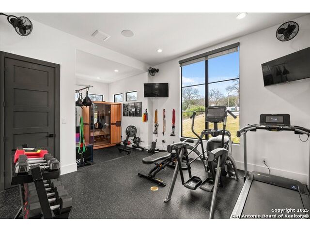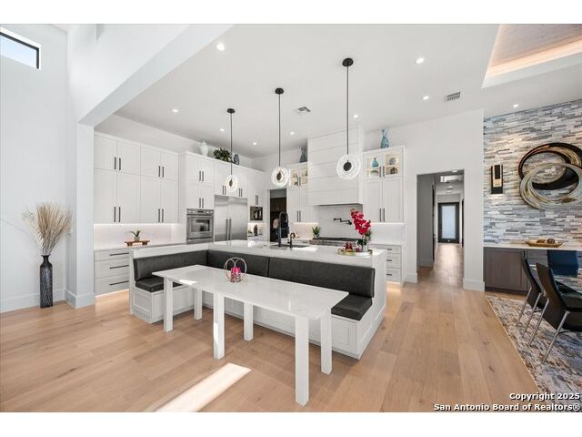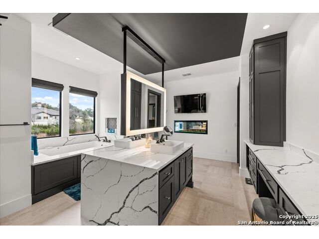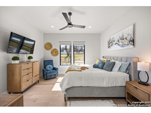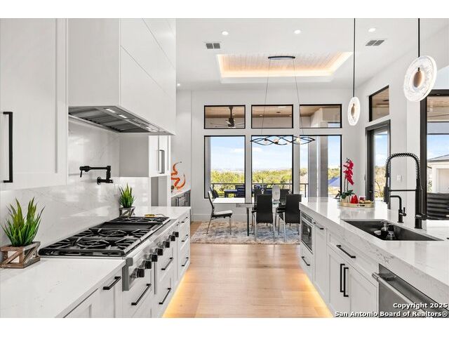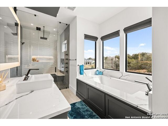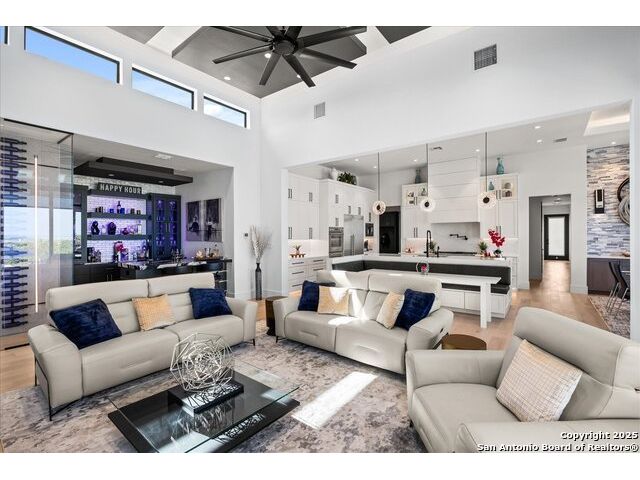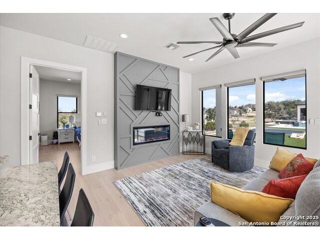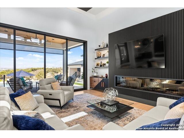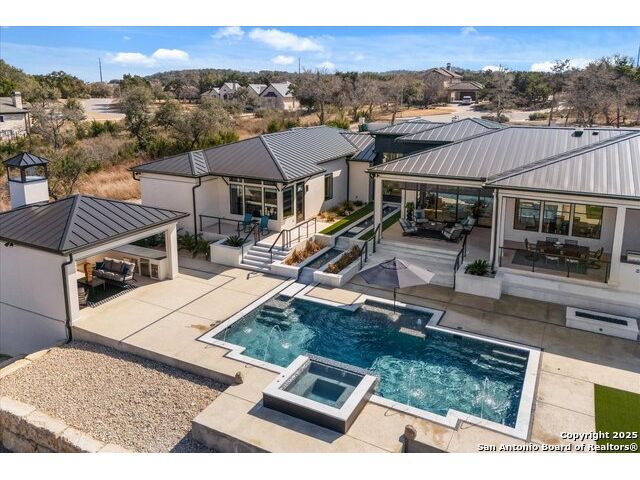 Stunning Mattern & FitzGerald Custom Home | Built 2024. Experience Hill Country luxury at its finest in this practically brand-new masterpiece, tucked behind a private gate within the exclusive gated enclave of Menger Springs. Sitting at the end of a quiet cul-de-sac, this home offers unmatched privacy and tranquility-all while delivering high-end features and breathtaking views. Property Highlights: Expansive Living Space: 5,581 total sq. ft. of unparalleled craftsmanship. Main Residence: 4,680 sq. ft. single-story layout with 4 bedrooms, 4.5 baths, a media room, fitness room, glass wine room enclosure, and private home office. Incredible kitchen that has everything you need, to include a one-of-a-kind coffee maker. Amazing master bath with master Jacuzzi bathtub. Two of the secondary bedrooms have lofts for additional space. Sliding glass doors that open up the living room to the patio to make an indoor/outdoor living experience. Guest House: A fully equipped 901 sqft ADA compliant retreat with full kitchen, washer/dryer, & its own private garage-perfect for guests, extended family, or an upscale workspace. HUGE100 inch fireplace in main living area with additional Fireplaces in the master bathroom, guest house and cabana, making 4 in total. Prime Location: Situated at the end of a cul-de-sac, ensuring maximum privacy and minimal traffic. Garage Space for Every Need: 5-car capacity with a 4-car main garage (one bay with a car-lift to fit 2 cars stacked with an oversized door) + separate single-car garage for the guest house. Outdoor Paradise: Resort-style pool & hot tub, fire-pit with bench seating for entire family, poolside cabana, built-in surround system throughout the entire house, guest house & pool area, waterfall & water features artificial turf, and a custom in-ground trampoline seamlessly integrated into the landscape-all designed for unforgettable entertaining. Unmatched Hill Country Views: Long-range, unobstructed panoramas that are rare and breathtaking, with panoramic views in three bedrooms. An Opportunity Like No Other. This home is an absolute must-see-where luxury meets lifestyle in a setting that feels like a private retreat. Words don't do it justice. Check out the Virtual Tour, then come experience it in person. Prepare to be blown away!