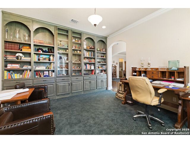 Introducing 436 Hidden Springs Dr., an exquisite custom-built estate nestled within the ever-coveted Crossings at Spring Creek. Set on a 1.02-acre lot fully fenced -with a personal powered gate-the property is embraced by mature trees, offering a serene retreat in an enviable location. This Texas hill country residence with a three car garage has been meticulously maintained and offers quality throughout. Upon a main entrance grand pillars and arched transitions direct you towards the formal living area, accentuated by octagon coffered ceilings and a back porch view. The primary bedroom and bathroom are privately positioned in their own quarter of the property. A walk-in shower, dual vanities, and a walk-in closet check all the boxes! Moving along to the star of the show, a gourmet kitchen with arched stone masonry and a grandiose granite island is the perfect setup for the chef of the family! This home has no shortage of square footage or practical use. A front office with custom built-in shelving and natural lighting, formal dining, Jack and Jill bedrooms, laundry/utility room, and an extra mixed-use room with adjacent half-bath encompass the remainder of the useful areas. Don't wait to view the gorgeous private estate! Located just minutes from schools, shopping/entertainment, and main roads for quick travel. The Crossings at Spring Creek community pool and pavilion with multiple athletic courts and trails are just a quick walk away. Upgrades: Roof 2017, HVAC 2019, Water heaters 2023, leaf guards installed on gutters, and more. (4th bedroom conversion is doable, closet and bathroom adjacent already in place) Please inquire for full list of upgrades with home.