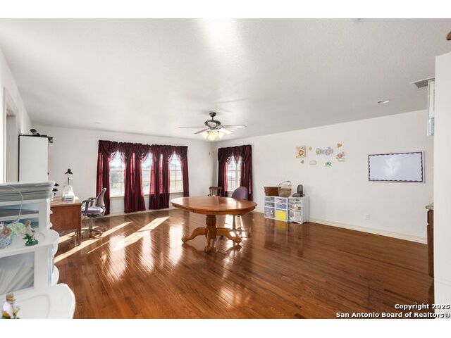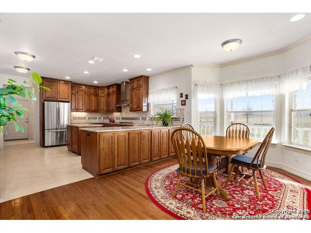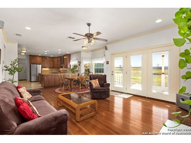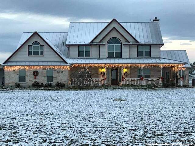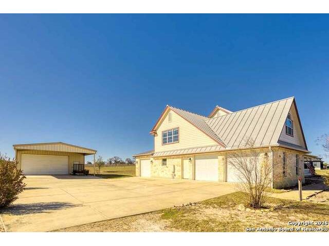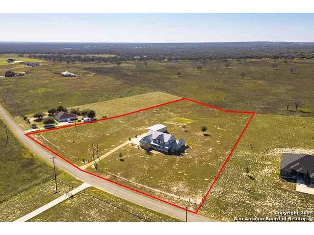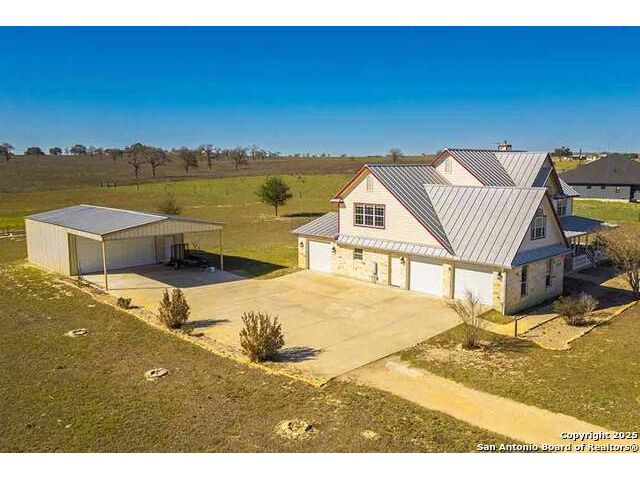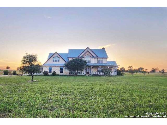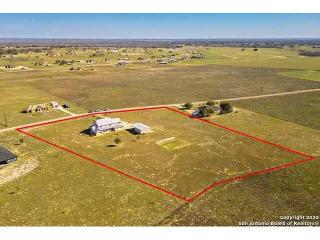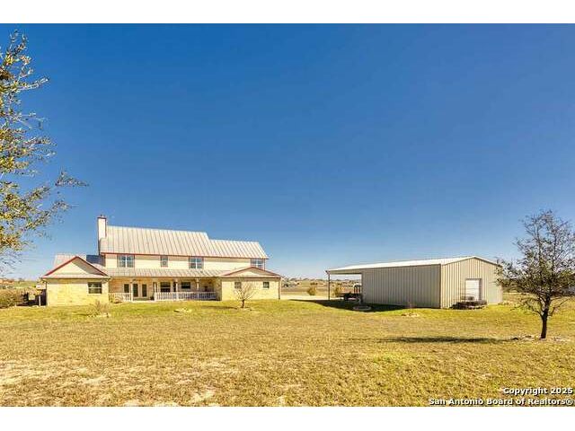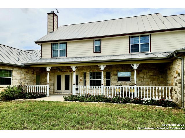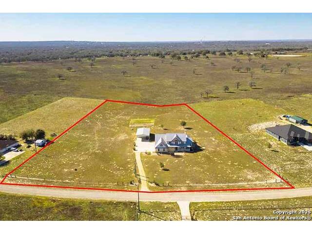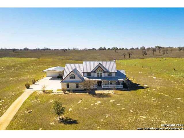 DRAMATIC PRICE REDUCTION! Exceptional Estate boasting 4.7 Acres of La Vernia Countryside, Stately Residence of nearly 3,500 Square Feet with Victorian Farmhouse Charm, Oversized 3 Car Attached Garage + Detached Garage/Workshop! LAND: Fully fenced 4.7 Acres, elevated w/views, private water well for irrigation (public water to house), flowering trees, garden plot. WORKSHOP: 30'x30' shop fully insulated, dedicated electric meter, double overhead door + passage door at front, single overhead door at back, ample lighting & numerous electrical outlets, attached 30'x20' carport, expansive concrete driveway/parking. HOME: Delightful Throughout, and perfectly situated to enjoy breathtaking Texas sunrises & sunsets! Custom built by acclaimed local builder D&D Custom Homes, and beautifully maintained by the original owners. Pleasant wrap-around front porch beckons you to experience refined country living. As you enter, the Study/Office is privately located off the foyer - Fiber Optic Internet makes remote work a breeze. The Formal Dining Room showcases elegant wood French doors opening to the Island Kitchen ... featuring KitchenAid double ovens, Bosch dishwasher & gas cooktop, abundant cabinetry w/pull out storage! Also downstairs, discover the Master Retreat w/direct access to the side porch & back patio. The Main Living Room showcases a rock fireplace w/highly-efficient wood stove insert. Dream Laundry Room w/sink & plentiful cabinets! Journey up the classic staircase to the generous 2nd level ... expansive windows bring in natural light to the Spacious Loft! The 3 upstairs bedrooms are roomy, and feature custom closet built-ins. Incredible family / media / hobby / school room (possible 5th bedroom) features built-in bar w/cabinetry & sink! Don't miss the amazing storage room! Beautiful Real Wood + Tile flooring throughout (no carpet). The Attached Garage is over 1,100 square feet: 3 car bays + workshop space! Two 50-gallon propane Water Heaters for added efficiency. Standing seam Metal Roof & gutters. Water Well feeds 4 high-volume faucets. Propane drop on patio for grill. Excellent location convenient to the amenities of La Vernia & Floresville, and approx. 40 minutes to the heart of San Antonio!