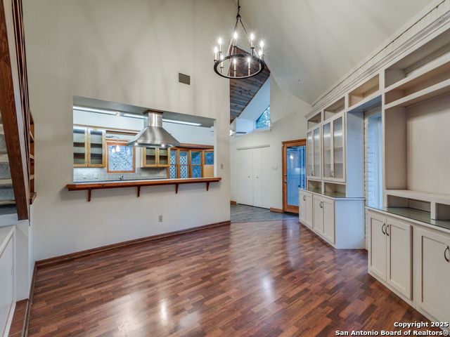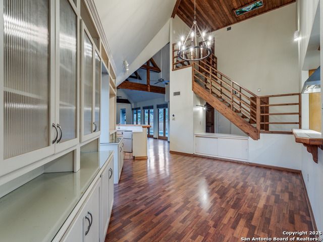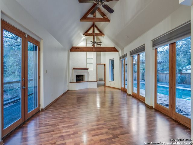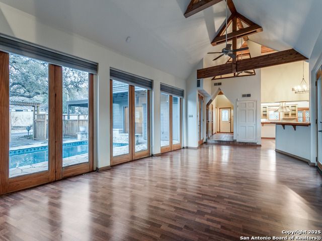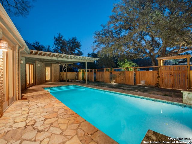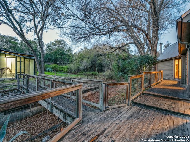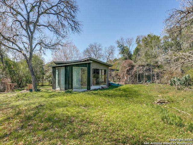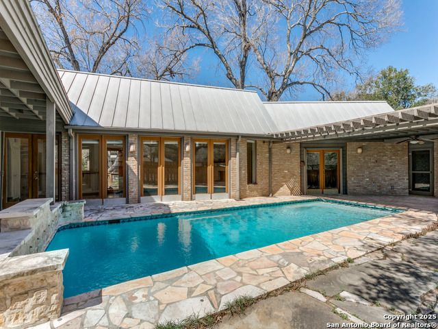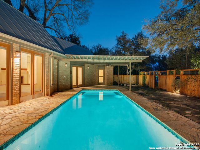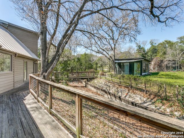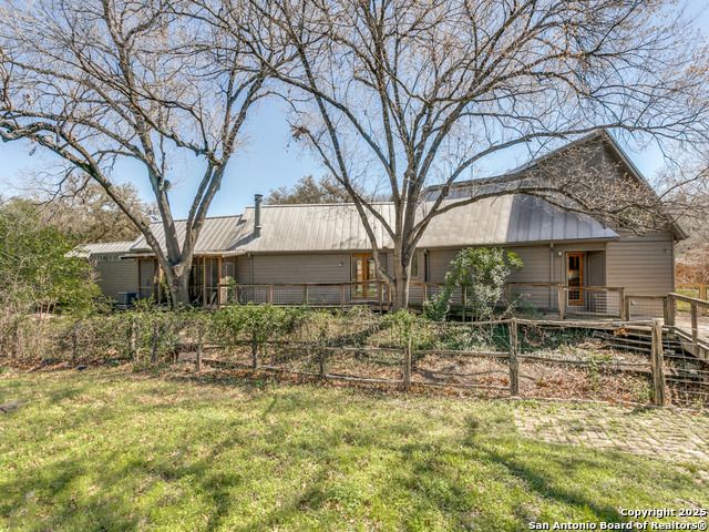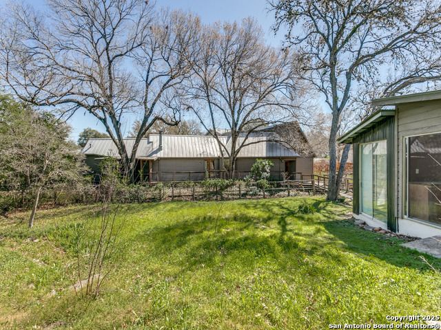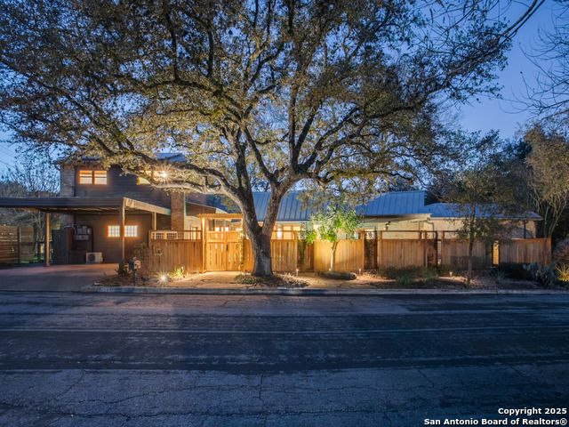 This stunning mid-century modern home blends O'Neil Ford-inspired architecture with modern sustainability. A metal roof and solar panels enhance efficiency, while vaulted ceilings with exposed wood beams and walls of windows create a bright, open feel. The private, gated front courtyard features a sparkling pool and surrounding patios. Inside, the open living and dining areas center around a open wet bar, perfect for entertaining. The galley kitchen includes a built-in breakfast bench. With four bedrooms-two downstairs with en suite baths, including the primary-plus two more upstairs, the layout offers flexibility and privacy. The Hill Country-style backyard boasts a sprawling deck, screened-in porch, and a bridge crossing a dry creek bed an expansive back yard with a garden shed / greenhouse. A rare retreat in AHISD-don't miss this opportunity!