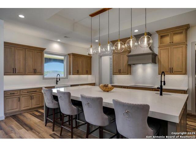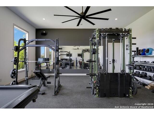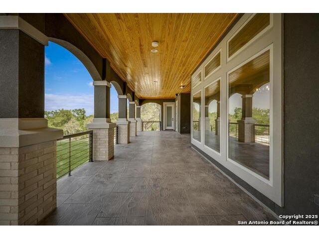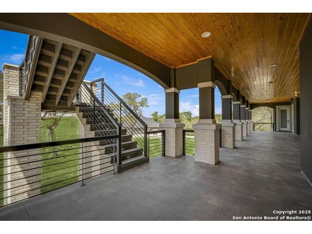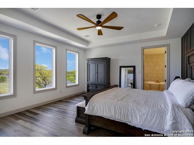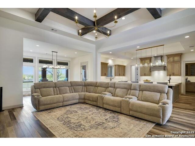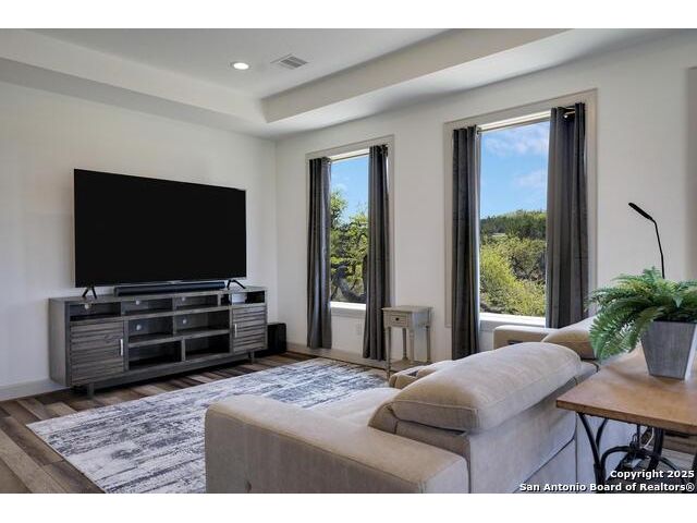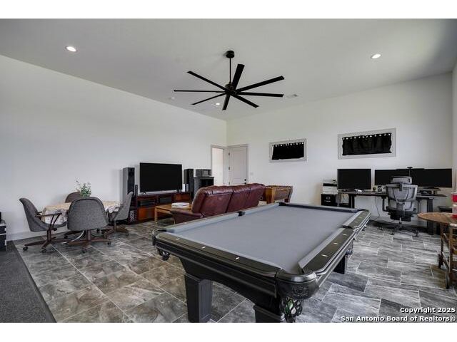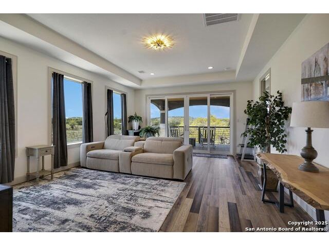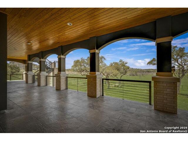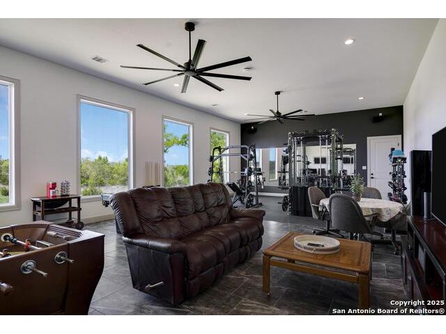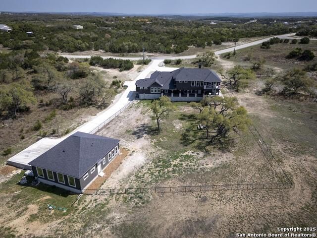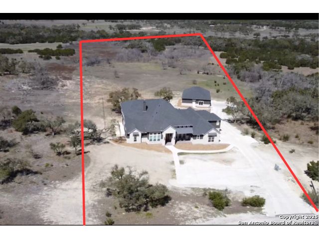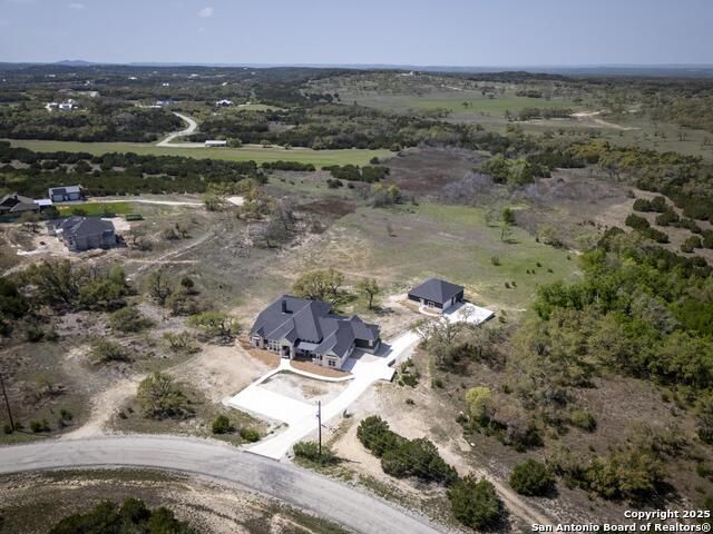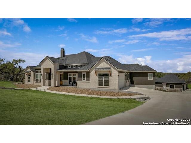 Situated on nearly 5 private acres in the prestigious Mystic Shores at Canyon Lake, this custom estate was completed in September 2024 and offers 6 bedrooms, 5.5 bathrooms, and 5,173 sq ft of thoughtfully designed living space. With two primary suites-one on each level-the home is ideal for multigenerational living or entertaining. High ceilings, natural light, and refined finishes create a warm Hill Country retreat. The kitchen showcases a dramatic quartz island, KitchenAid appliances, cast-iron apron sink, walk-in pantry, and a butler's pantry with custom storage, all flowing into open living and dining areas. The oversized detached garage includes a climate-controlled gym, workshop, additional living space, and half bath. Modern conveniences include ADA-compliant ramps, upgraded 400-amp service with EV outlets, and a fully fenced yard with security system. Forever-unobstructed views of the adjacent nature preserve add privacy, while community amenities include pools, pickleball and tennis courts, trails, clubhouse, and direct lake access. Here, mornings start with kids in the living room while you prepare breakfast, afternoons are for BBQs and outdoor play, and evenings bring movie nights or stargazing from the patio.