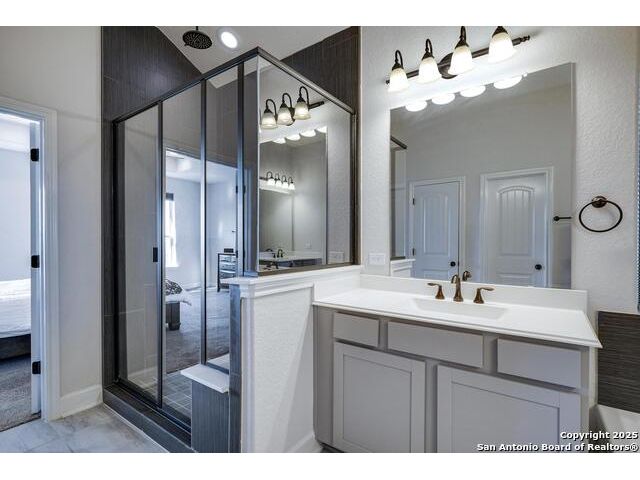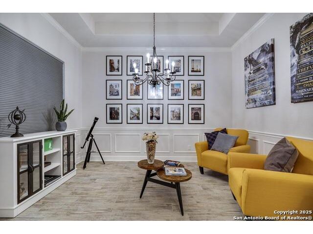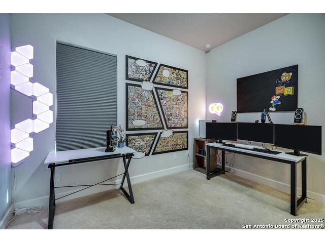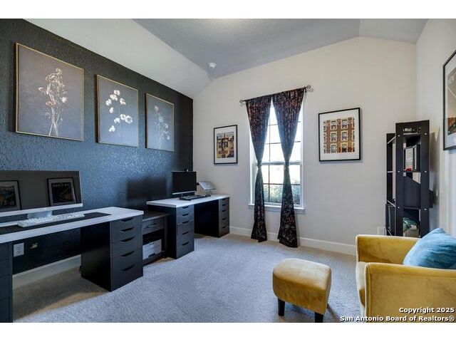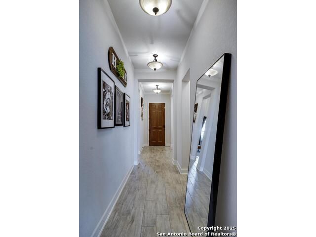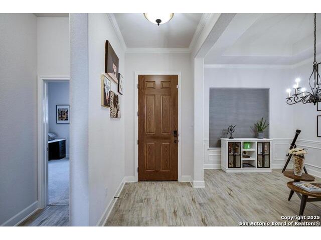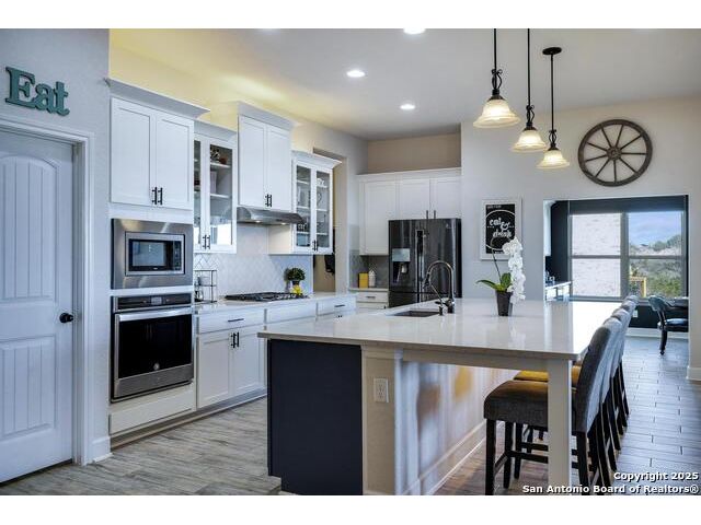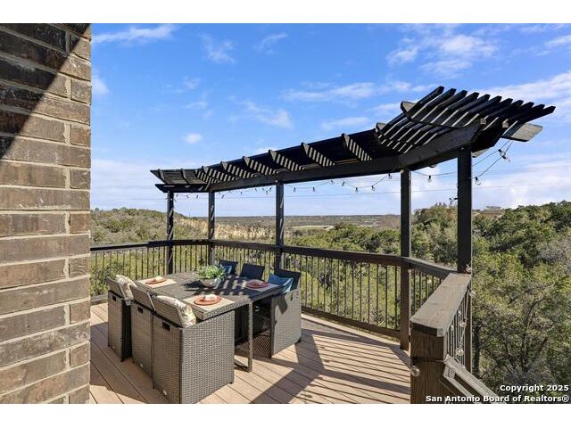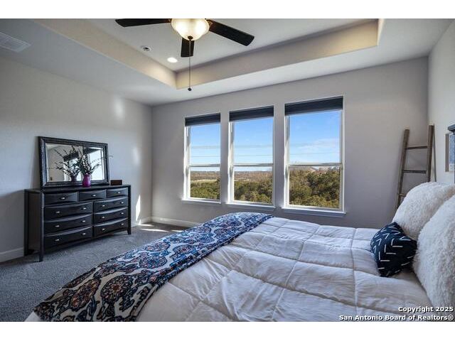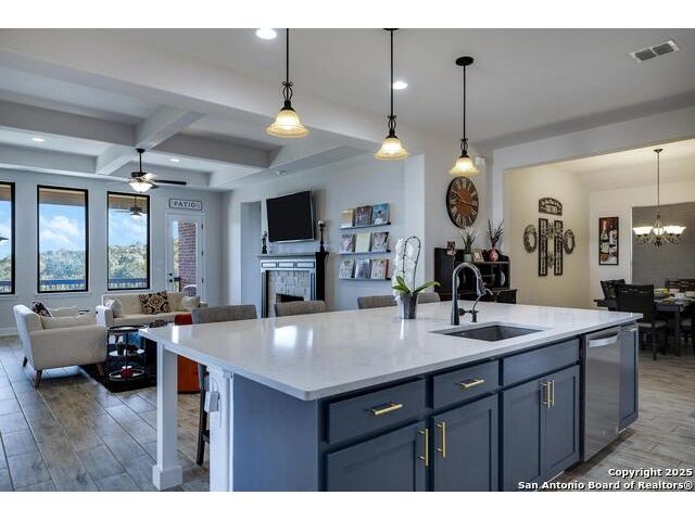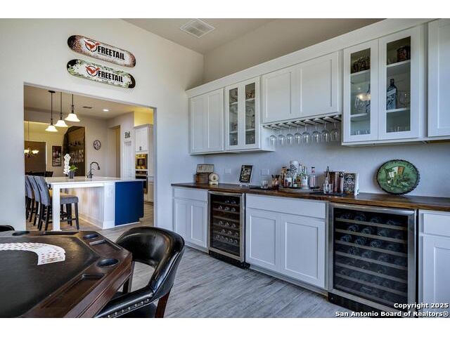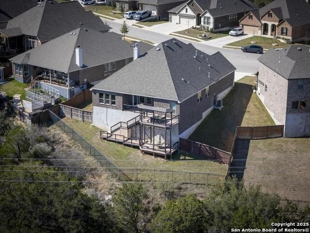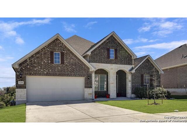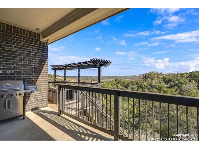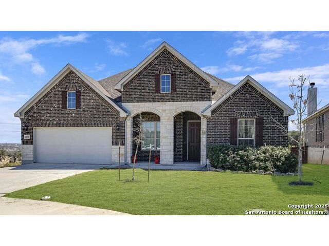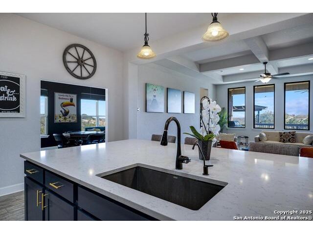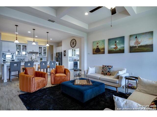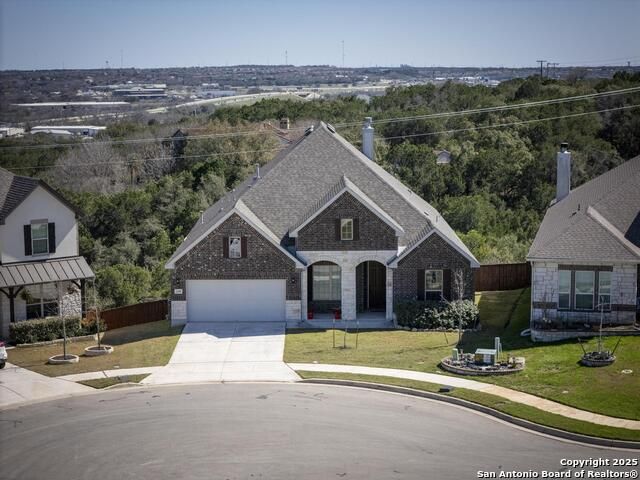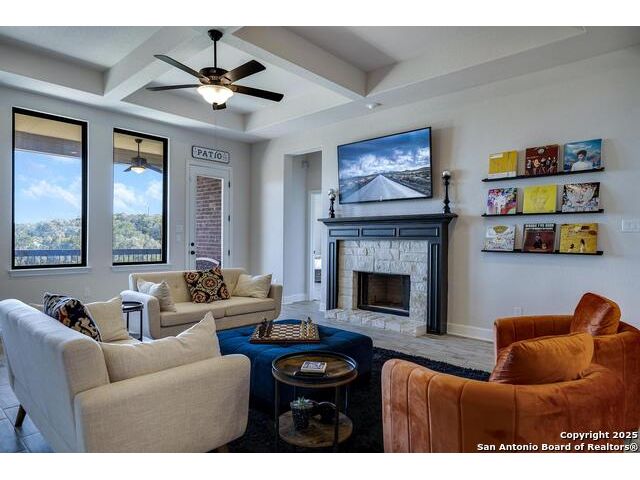 Welcome to your dream home in the prestigious Estates at Stone Crossing! This stunning one-story residence offers an open floor plan with four spacious bedrooms and a versatile flex space at the front-perfect as a formal living room or home office. **The View!** Enjoy breathtaking scenery from the primary bedroom, kitchen, game room, and, of course, the extended outdoor deck. Whether you're sipping your morning coffee or hosting an evening gathering, the serene greenbelt backdrop creates an unmatched sense of tranquility. Designed for effortless entertaining, this home features a dedicated game/media room, complete with an extended bar space, mini fridges, and plenty of room for guests. At the heart of the home, the chef-inspired kitchen boasts elegant quartz countertops, stainless steel appliances, and gas cooking-ideal for everything from casual breakfasts to gourmet meals. The adjoining living and dining areas, accented with rich tile plank floors and a cozy fireplace, provide a warm and inviting ambiance. The thoughtful layout includes bathrooms near each bedroom, plus a convenient powder room for visitors. Step outside to your extended back deck, the perfect retreat for relaxing or entertaining, all while soaking in the stunning views. With its impeccable design, breathtaking views, and entertainer's dream layout, this home is truly a rare find. Don't miss your chance to make it yours!