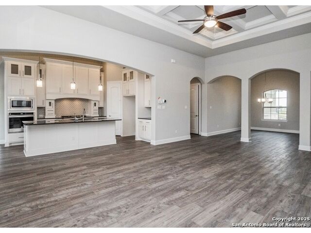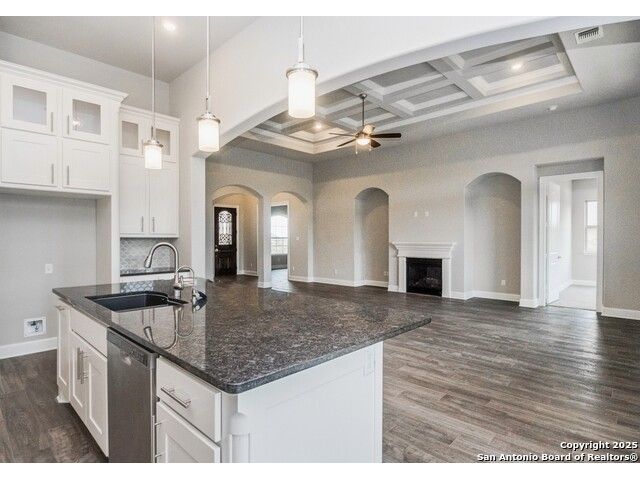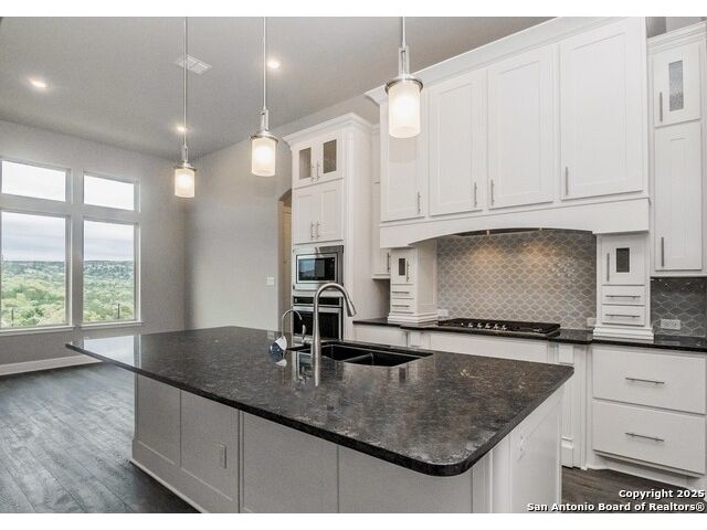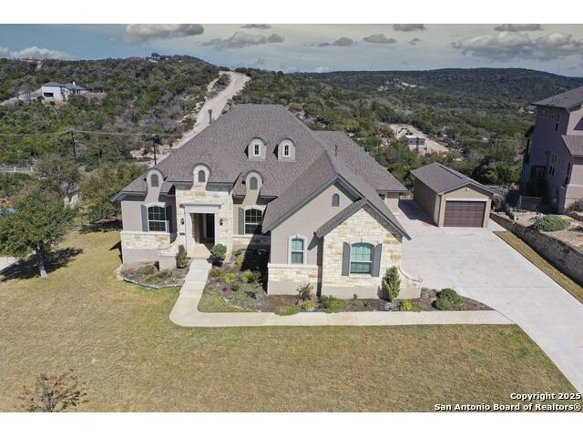 Discover this exquisite Hill Country home, perfectly situated with breathtaking views. Offering a seamless blend of luxury and comfort, this home boasts an open-concept floor plan with soaring ceilings that create a warm and inviting atmosphere. Upon entering, you'll find versatile space just off the entryway, ideal for working from home, a study/office, or a playroom. The gourmet kitchen is a chef's dream, featuring custom upgraded cabinetry, a large pantry, a bar nook, and a perfect breakfast area -perfect for hosting family and friends. The coffered ceiling adds character to the cozy seating area, making it an ideal space for gathering. This home offers three generously sized bedrooms and provides the flexibility for every lifestyle. The luxurious primary suite is a true retreat, with oversized windows allow plenty of natural light to enter the room for the ultimate relaxation room! The spa-like primary bath features dual sinks, a huge glass-enclosed shower, and a spa tub, offering the perfect place to unwind. Step outside to your private backyard oasis, where a meticulously maintained and landscape ensures effortless beauty and easy upkeep. Take a dip in the sparkling pool, perfect for cooling off on warm Texas days or hosting outdoor gatherings. The property also features a versatile four-car garage - providing ample space for vehicles, storage, or a customized she-shed or gym-tailored to suit your lifestyle needs. Located in highly desirable Helotes, Texas, this home is just minutes from shopping, dining, and entertainment at La Cantera, The Rim, and Old Town Helotes. Plus, it's a short 30-minute drive to downtown San Antonio, the iconic River Walk, and The Alamo. Enjoy serene Hill Country living with the added luxury of a pool and low-maintenance landscaping-schedule your tour today!