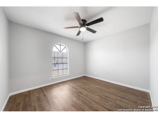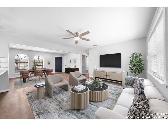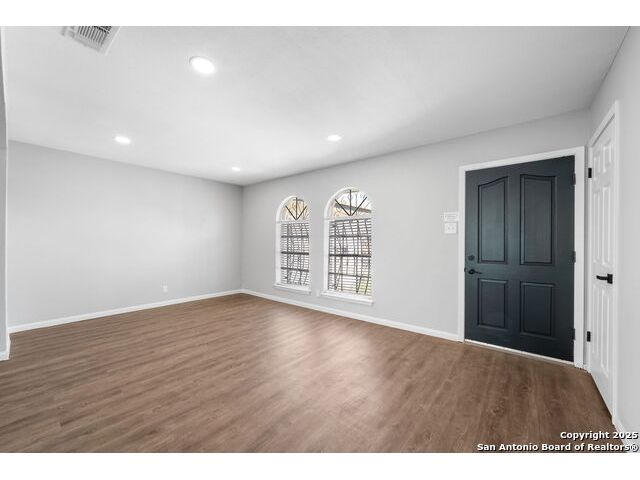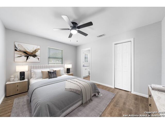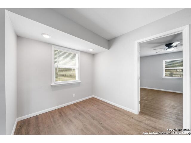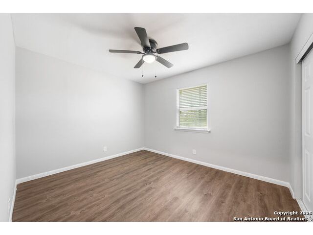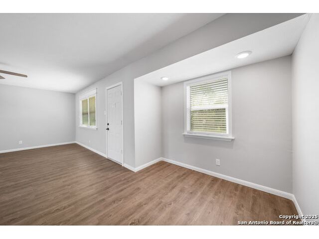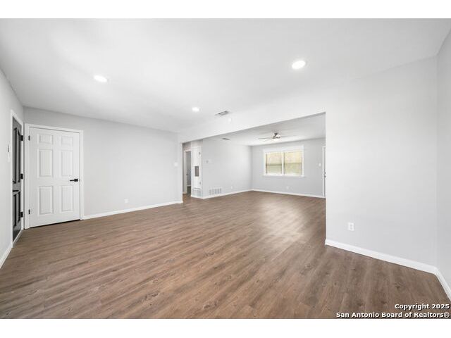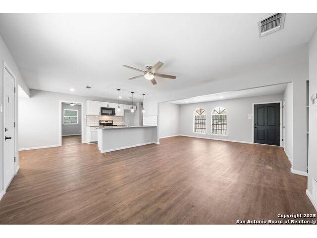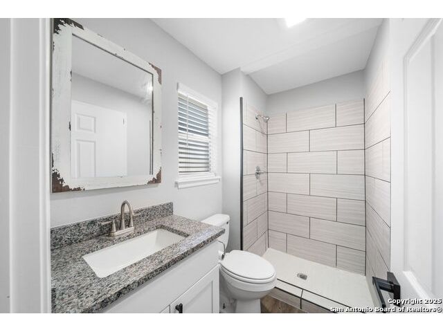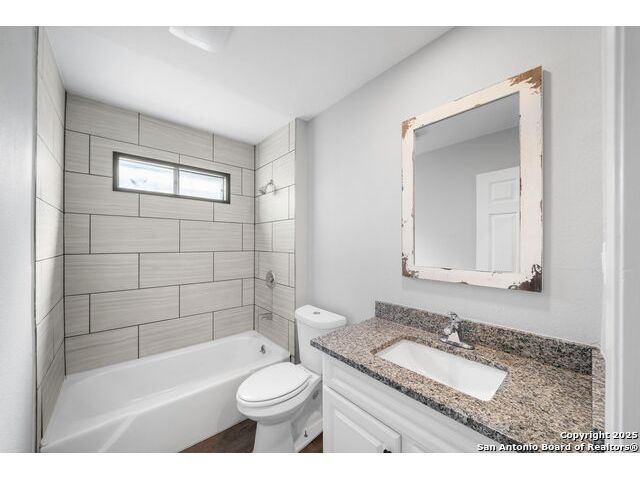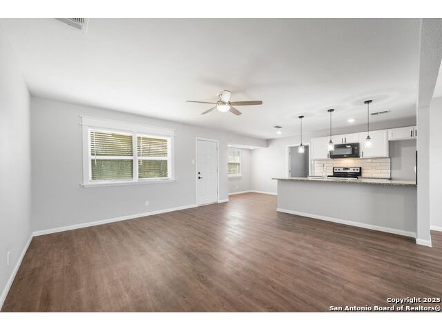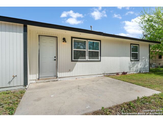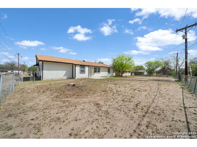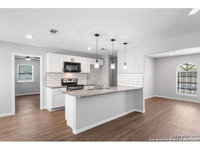 This completely renovated home is conveniently located near downtown San Antonio. The charming property boasts three-bedrooms, two-full-bathroom and a 2 car garage in nearly 1,400 square feet of living space. Step inside to find freshly painted walls, wood vinyl flooring and all lever door handles for a modern touch. This home features zero carpeting throughout. The kitchen includes granite countertops, an undermount sink, new cabinets and a subway tile backsplash. Enjoy the convenience of a laundry room with full-size connections and plenty of storage space. Recessed lighting and pendant lighting add a touch of elegance, while a nest thermostat keeps your environment comfortable. The hall bathroom features Delta fixtures, a tub-shower combo with tile surround, and natural light. All bedrooms offer ceiling fans and ample closet space, with the primary bedroom providing a private retreat with an en-suite with a stand-up shower featuring Delta fixtures and tile surround. Outside, you'll find a large lot with no rear neighbor, offering privacy and space to relax. The fenced yard includes a patio, perfect for outdoor entertaining. There's also a slab for a shed, side yard access, and a two-car garage with a garage door opener. Don't miss out on this completely renovated home that offers privacy, convenience, and comfort at an affordable price.