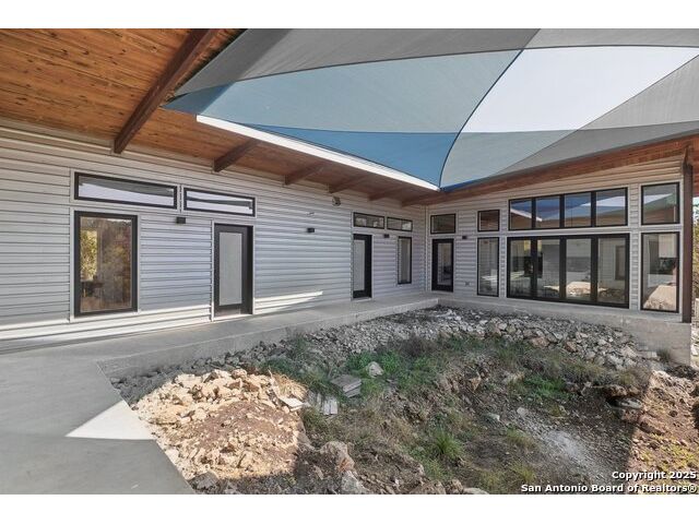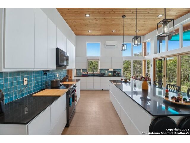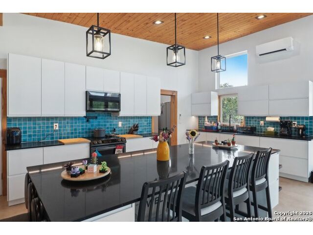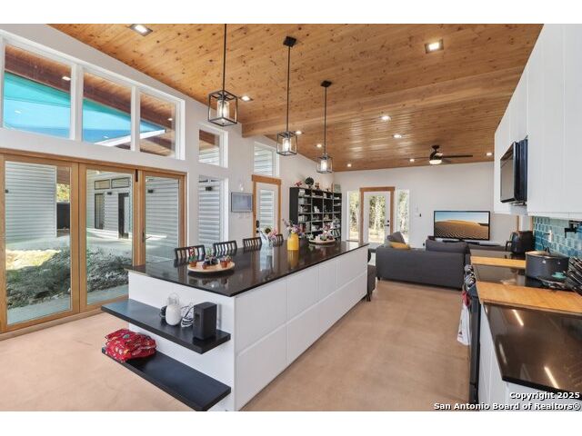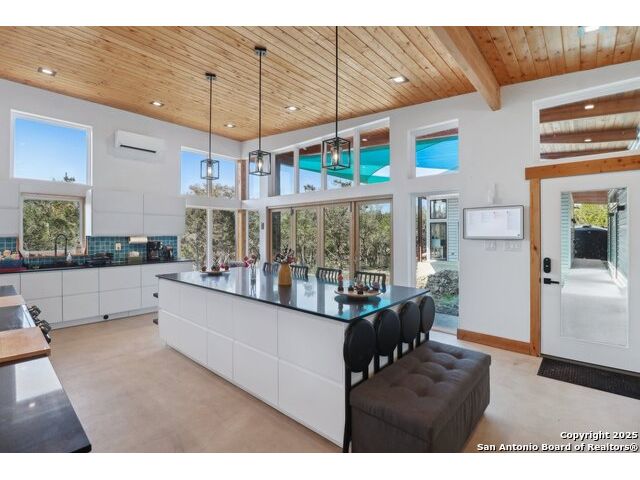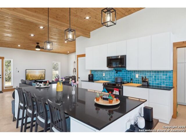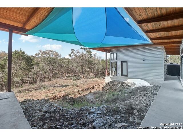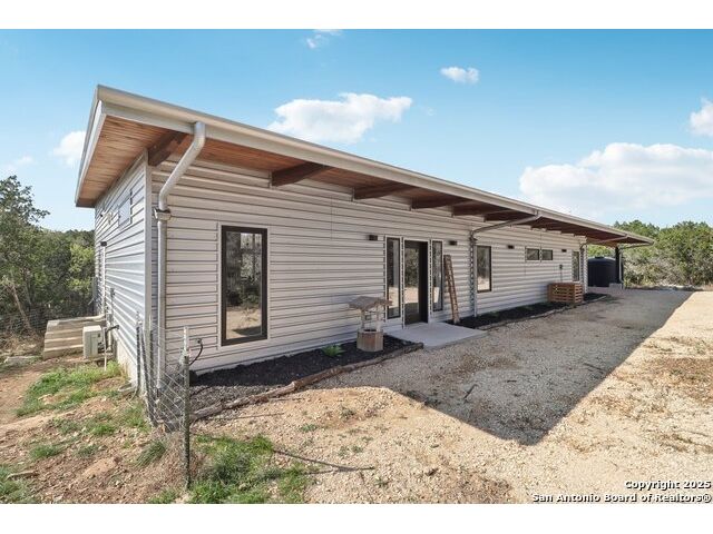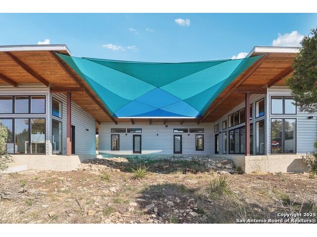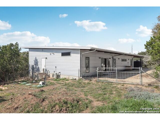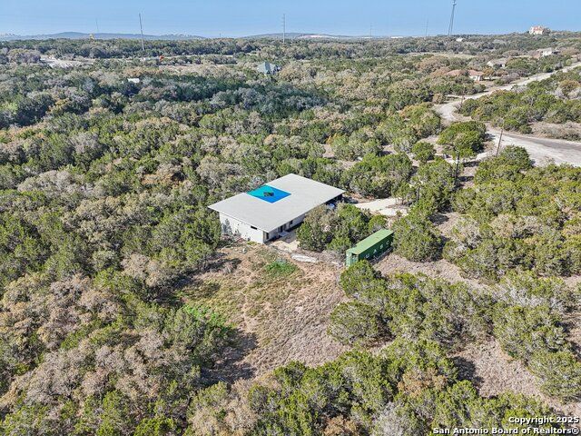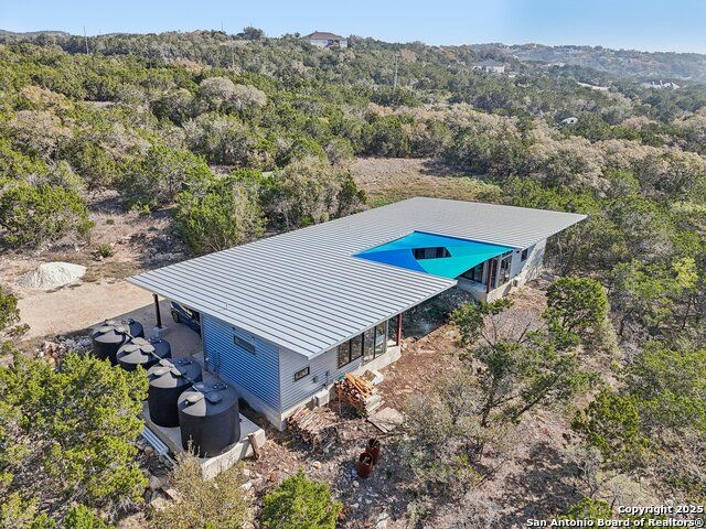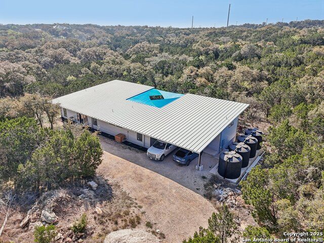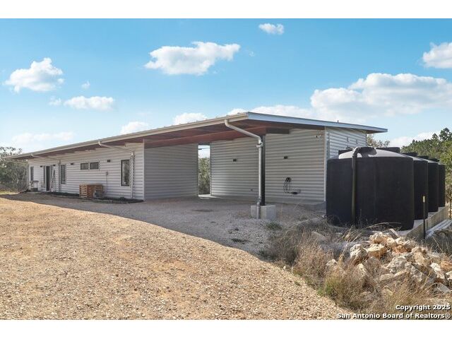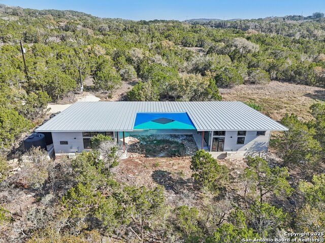 Modern Hill Country retreat * 5.05 acres in Bear Springs Ranch * Sustainable design with rainwater system & Hydroloop water recycling * Potential short sale opportunity Experience elevated Hill Country living in this contemporary 3-bedroom, 2.5-bath home set on 5.05 acres with panoramic views and no HOA. Designed for comfort and sustainability, the open floor plan showcases vaulted wood ceilings, expansive windows that frame the natural landscape, and a gourmet kitchen featuring white cabinetry, bold blue backsplash, black quartz counters, stainless steel appliances, and a large center island perfect for gathering. The private primary suite includes a spa-style bath with dual vanities, soaking tub, and separate shower, while two secondary bedrooms and a guest bath complete the interior. Eco-conscious systems include a Hydroloop water recycling setup, a 10,000-gallon rainwater catchment tank, and a 40-ft shipping container ideal for storage, workshop, or creative studio use. Outdoor living abounds with a covered patio designed for sunset views, open acreage for exploring, and breathtaking stargazing under the wide Texas sky. Located in Bear Springs Ranch, just minutes from Medina Lake, Mico, and Castroville, with easy access to Loop 1604 and Highway 90, this property combines luxury, sustainability, and Hill Country serenity. A unique opportunity for buyers seeking a modern, eco-friendly retreat with incredible value and potential.