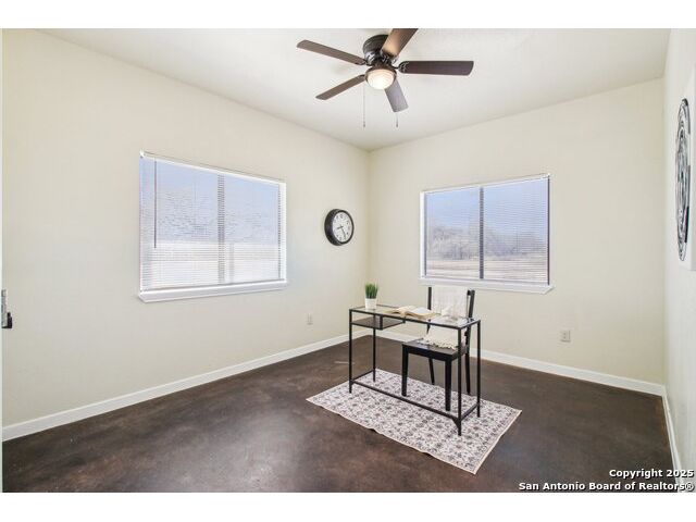 This exquisite ranch-style home, nestled on 3 unrestricted acres near the city of Devine, boasts a charming covered front porch perfect for relaxing and taking in breathtaking sunset views. Upon entering from the porch, a visitor is greeted by stunning stained concrete floors that flow seamlessly throughout the space. The expansive living room features soaring vaulted ceilings, while the open-concept design effortlessly connects the dining room and kitchen, allowing natural light to pour in from every angle. The kitchen is a true showstopper, offering ample cabinet space, elegant dark butcher block countertops, and a spacious pantry. The primary bedroom is a private retreat with a generous walk-in closet and an en-suite bathroom with a sleek glass-fronted standing shower and double vanity sinks. The expansive detached garage, paired with a fully insulated and air-conditioned warehouse, offers endless possibilities-whether you need extra storage, a spacious workshop, or even additional living quarters. The space and amenities make this property perfect for many lifestyles, not least the home-based business. This stunning property combines the tranquility of ranch living with the convenience of being just a short distance from the city, offering the perfect balance of rural charm and modern accessibility. Experience the best of both worlds in this exceptional home!