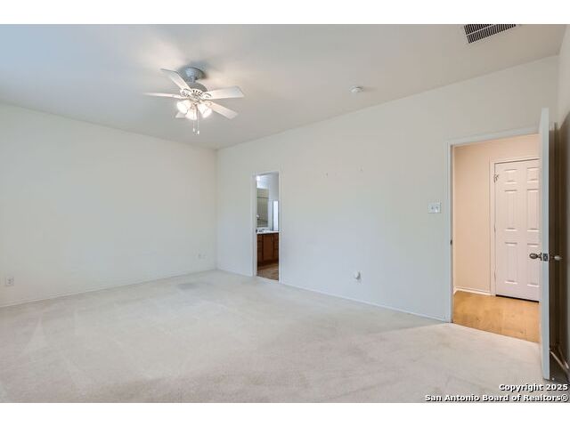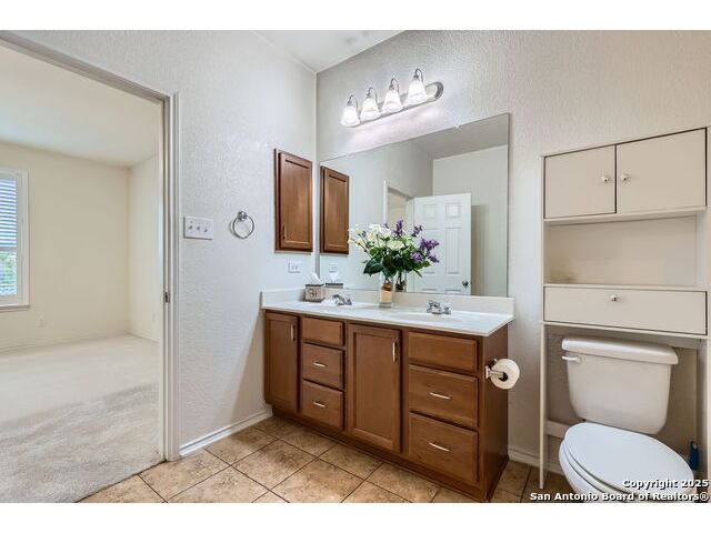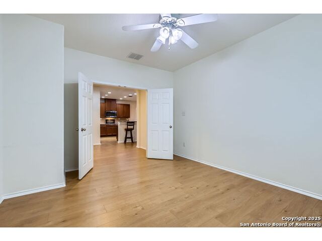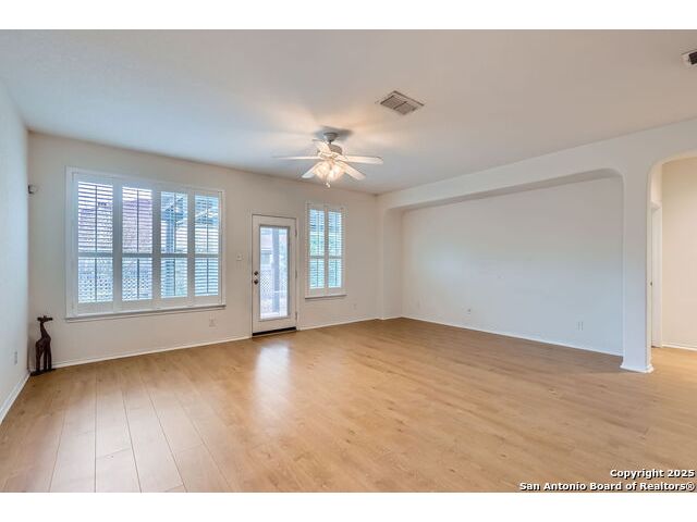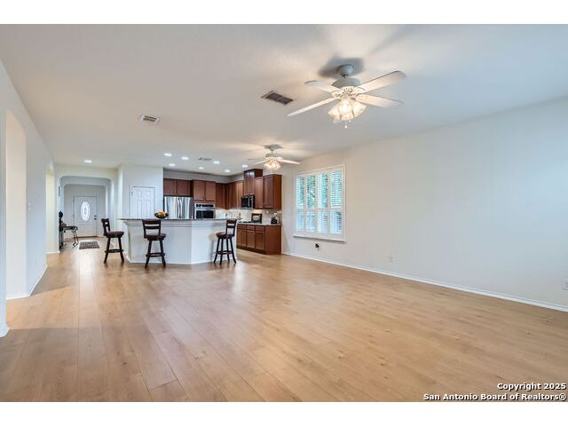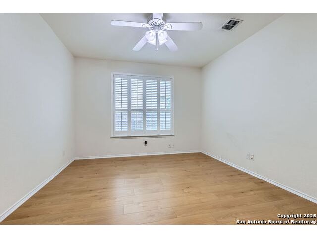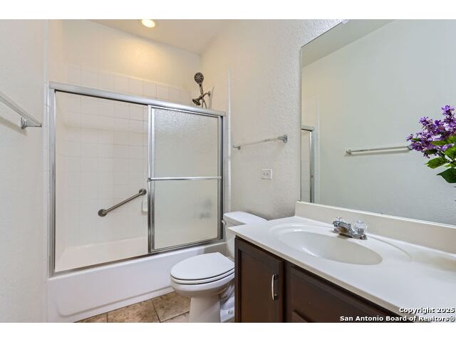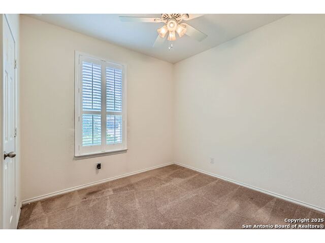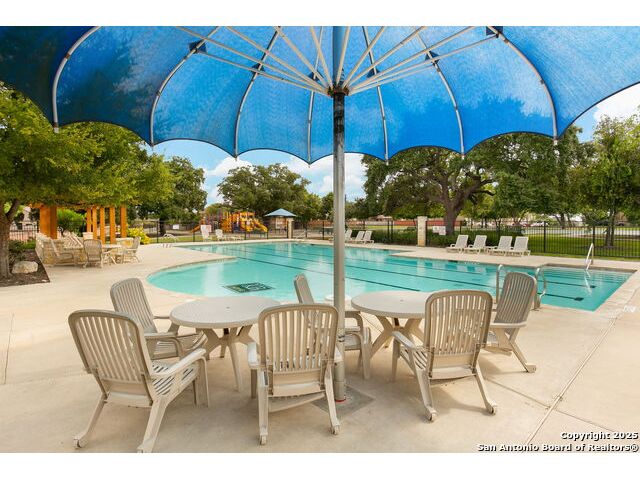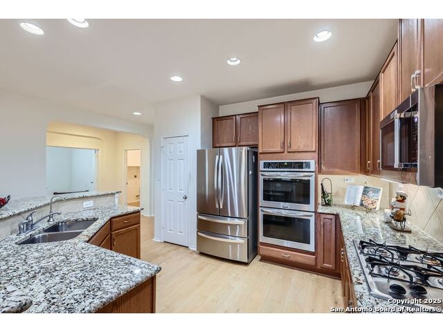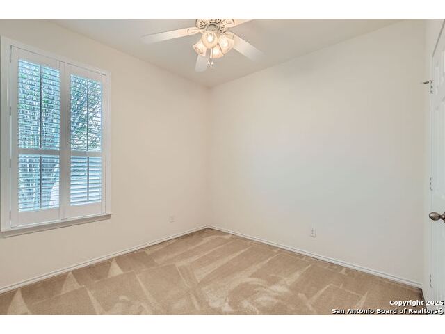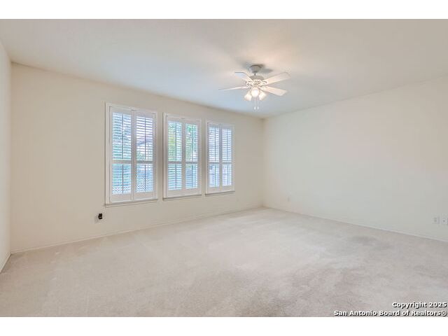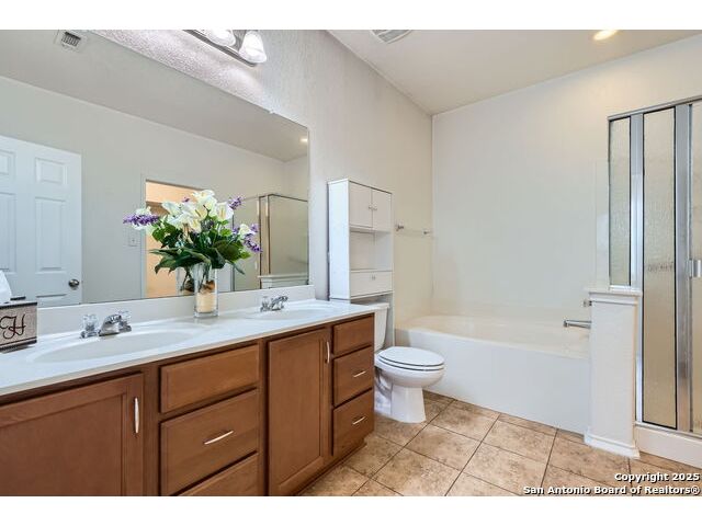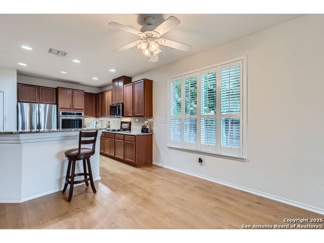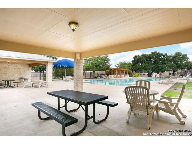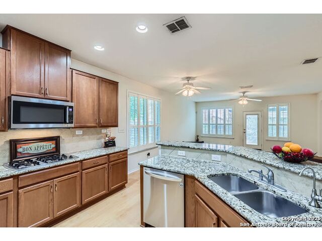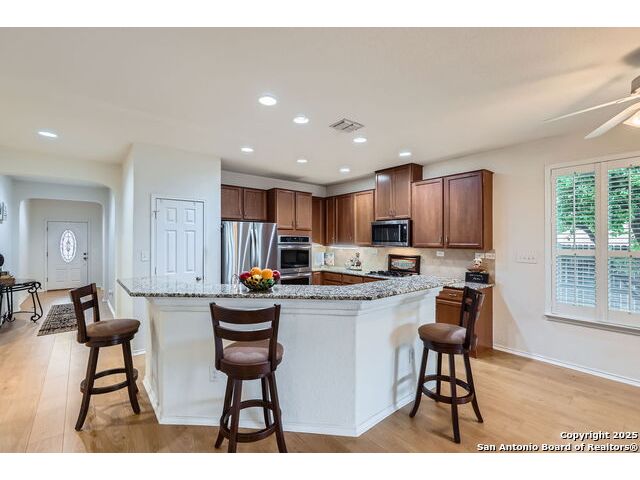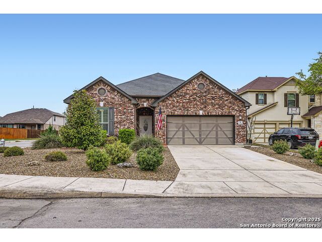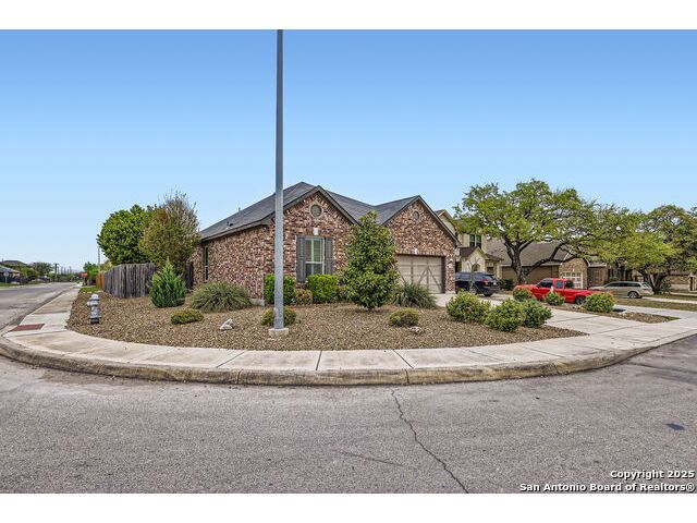 Welcome to your dream home in the heart of San Antonio's vibrant northwest side! Nestled within the prestigious gated community of Cobblestone, this stunning single-story home offers the perfect blend of elegance, comfort, and convenience. A Home Designed for Effortless Living. Sitting gracefully on a corner lot, this 3-bedroom, 2.5-bathroom gem is surrounded by low-maintenance xeriscape landscaping, front and back, so you can spend more time enjoying your home and less time worrying about yard work. Plantation shutters throughout the home add both curb appeal and exceptional privacy, while allowing natural light to flow effortlessly when open. Step inside and experience an inviting open floor plan with soaring 9-foot ceilings that create an airy, spacious feel. Whether you're hosting a lively gathering or enjoying a quiet evening, this home is designed for seamless entertaining and relaxation. The heart of the home is a chef's delight! Outfitted with granite counter tops, double sinks with Reverse Osmosis System, top tier stainless steel appliances including a LG refrigerator and dishwasher, a KitchenAid Microwave, and a Frigidaire Gallery double oven. This kitchen is READY for big holiday feasts, weekend brunches, and everything in between. With 42-inch maple wood cabinets, a breakfast bar, and ample recessed lighting, this space is both functional and beautiful. Need a home office? A formal dining area? A playroom? French doors open to reveal a versatile bonus room, ready to adapt to your needs. The expansive homeowner's suite is a true sanctuary, featuring an ensuite bathroom with a separate shower, garden tub, dual vanities, and a spacious walk-in closet. The secondary bedrooms are traditional in size, each with ceiling fans to keep you comfortable year-round. Living in Cobblestone means more than just owning a home, it's about embracing a lifestyle. Enjoy amenities including a swimming pool, playground, basketball court, BBQ area, and pond. Unbeatable Location, just minutes from SeaWorld, Six Flags Fiesta Texas, The Shops at La Cantera, Lackland AFB, and great schools, this home offers the perfect balance of tranquility and accessibility. Why just dream about the perfect home when you can make it a reality? Reach out to me or your favorite licensed realtor today and take the first step toward your next adventure!