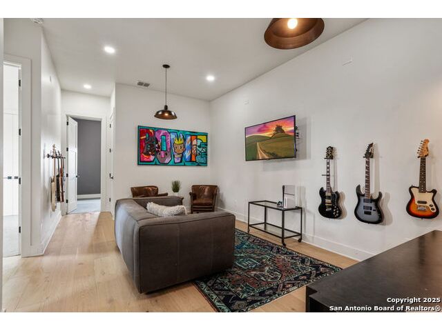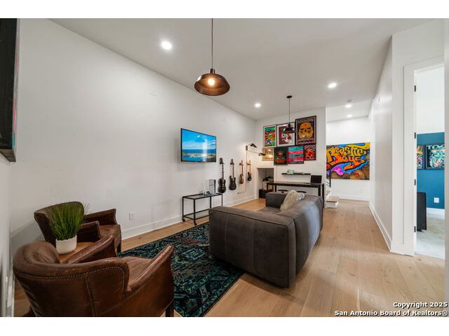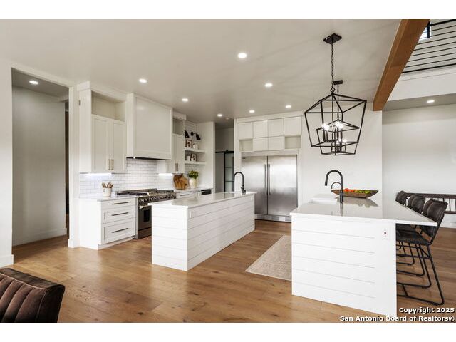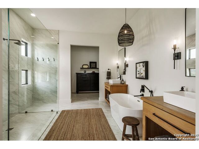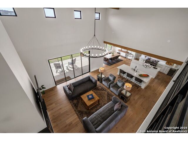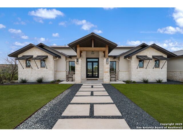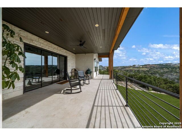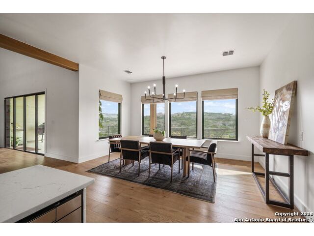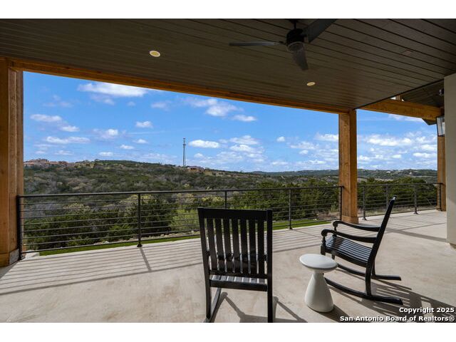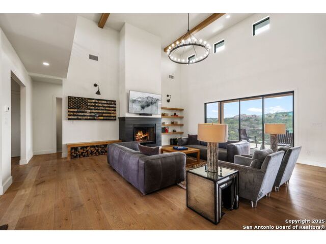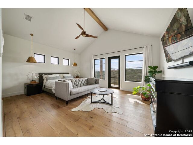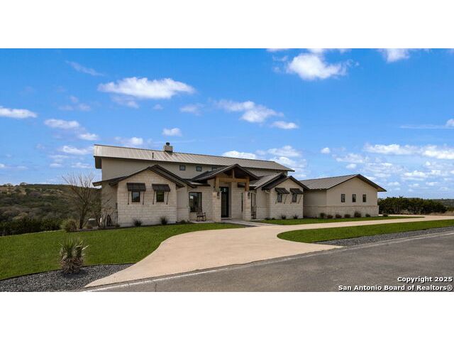 Set on 3.69 acres in the picturesque Texas Hill Country, this exceptional home boasts sweeping, panoramic views and is located within the exclusive gated community of Diamond Ridge in Boerne. This 5-bedroom, 4 full and 2 half-bath residence combines luxury and comfort in a beautifully designed open-concept layout, perfect for entertaining. With a spacious living area featuring soaring ceilings, a grand wood-burning fireplace, White Oak ceiling beams, custom built-ins, and elegant French Oak hardwood floors throughout. Custom and designer wallpaper in office and jack and Jill bathroom. Sliding glass doors lead to a large covered patio, creating seamless indoor-outdoor living ideal for hosting gatherings or simply enjoying the peaceful surroundings and breathtaking sunsets. The large kitchen features a six-burner gas cooktop, farmhouse sink, large dual islands with room for seating, and custom soft-close wood cabinetry. A large dining area surrounded by picture windows frames the spectacular views. The primary suite is a serene retreat with room for a cozy sitting area and direct access to the back patio. The ensuite bathroom features a walk-in shower with dual shower heads, a freestanding tub, dual White Oak vanities, and a spacious walk-in closet with built in shelving. A bonus space can be used as a second living area, home gym, or craft room. Upstairs, a generous game/theater room with wet bar and half bath offers the perfect space for movie night or entertaining friends. Diamond Ridge residents enjoy exclusive access to a private lake with a fishing dock, pavilion, and basketball and tennis courts. Zoned in top-rated Boerne ISD and just a short drive from historic downtown Boerne, this home offers a resort-style lifestyle in a private, tranquil setting.