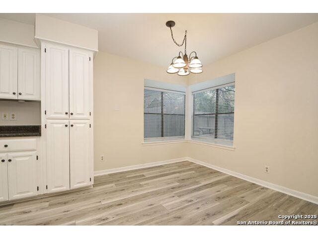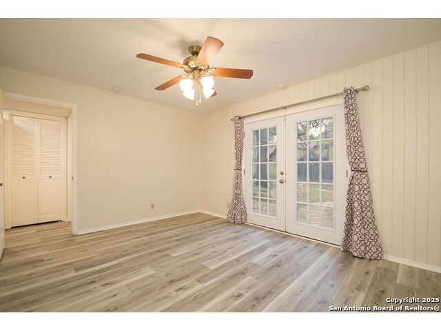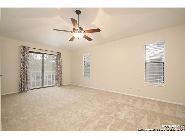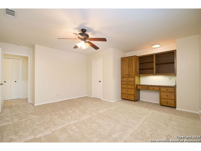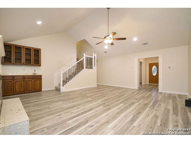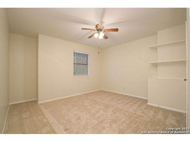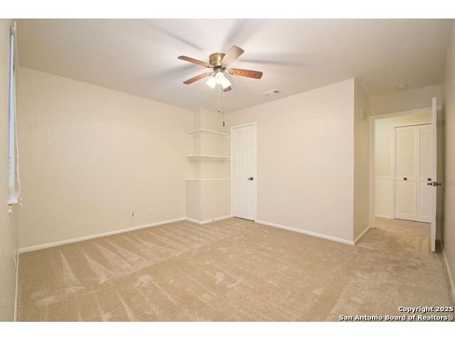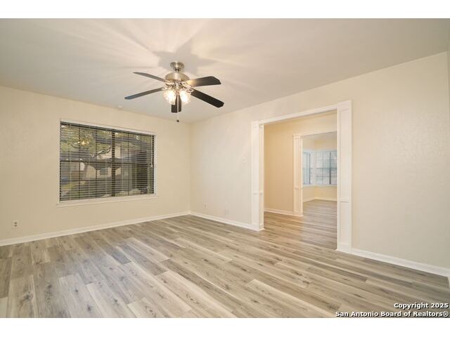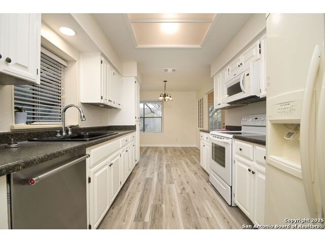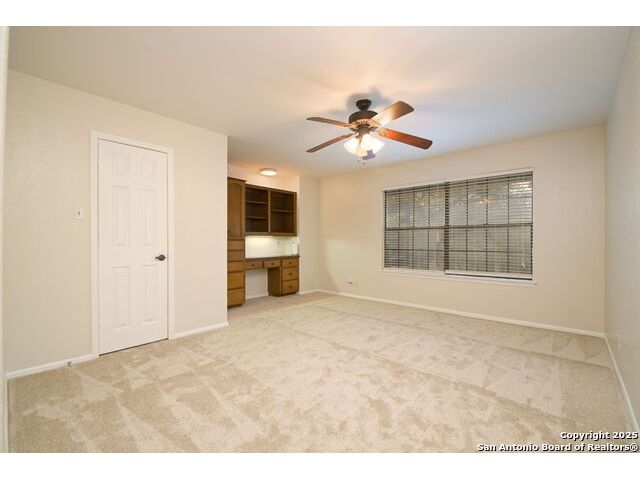 Do not miss the chance to view this home in the highly desirable Hunters Creek neighborhood! Walk into this lovely, newly updated home with 4 bedrooms and a front office! Updates include new flooring, new carpet, bathroom lighting, new paint, retexture and paint of ceiling, new water heater(with existing heat pump), new banister, and insulation from 2023. Upon walking in you will be greeted by a charming living room, a kitchen with cabinet space and appliances ready to use, plus a view of the spacious backyard. Entertain guests with the dining room or wet bar. Downstairs bedroom enjoys backyard access, full bathroom, and proximity to washer/dryer plus 2 car garage. Master bedroom enjoys a walk in closet, large bathroom with double vanity, access to a balcony, and room for relaxing. Neighborhood offers a greenbelt, pool, clubhouse, and tennis courts. Nearby access to 410, 1604, I-10, and Wurzbach parkway. Nearby access to parks and trails include Hardberger Park and Salado Creek Greenway. Nearby shopping/entertainment includes Huebner Oaks, Rim/La Cantera, The Alon ;HEB and Neighborhood Walmart both 5 or less minutes away from neighborhood. Large employers in the area include HEB, USAA, and Camp Bullis. In addition to all updates, the fridge, washer, and dryer will be staying! Ring video cameras will stay as added security for the buyer (front door, driveway, back patio, master room balcony). Voluntary HOA!