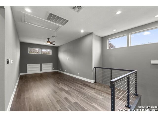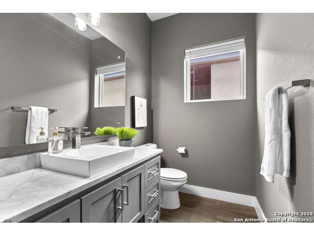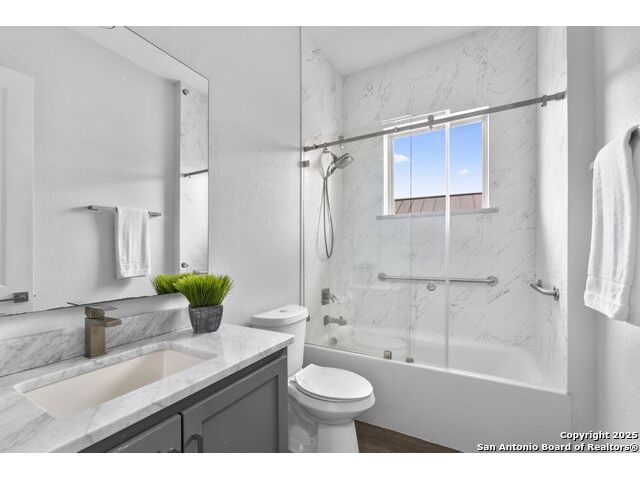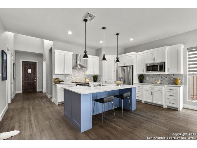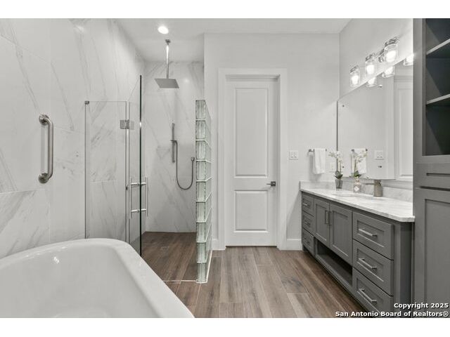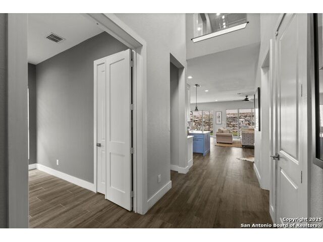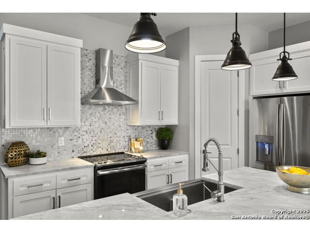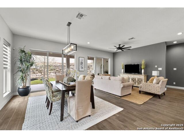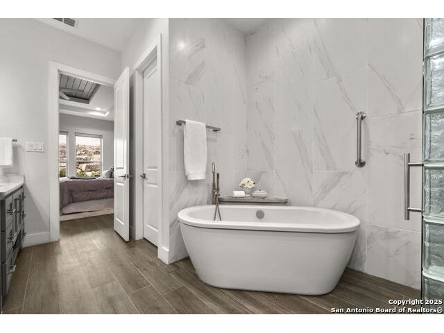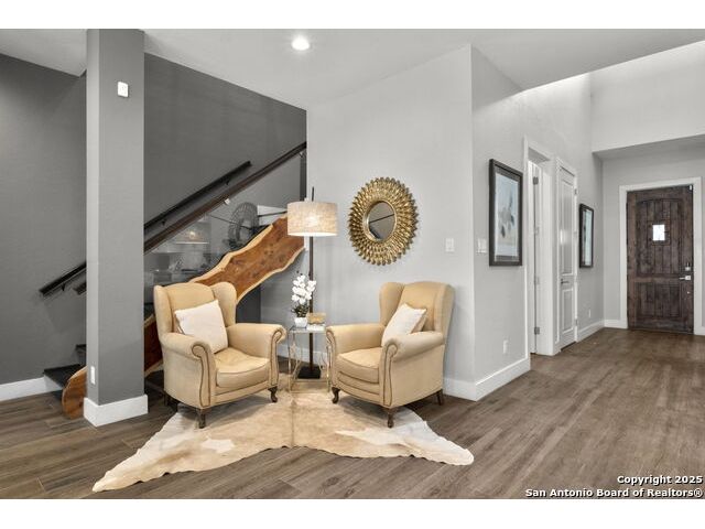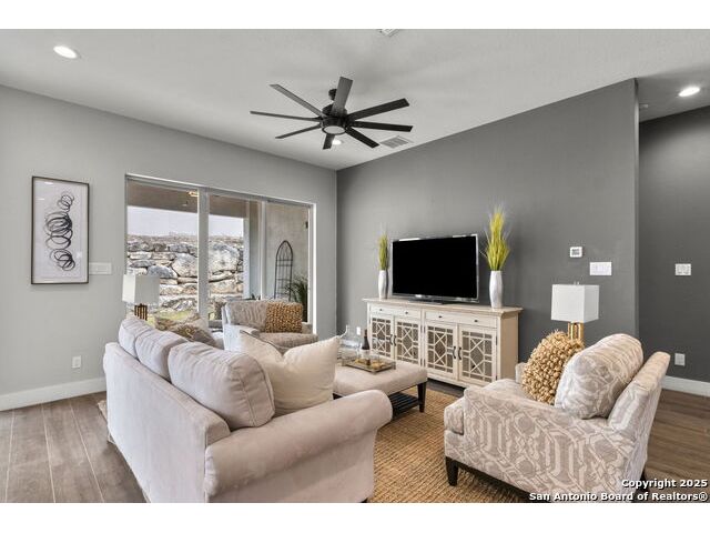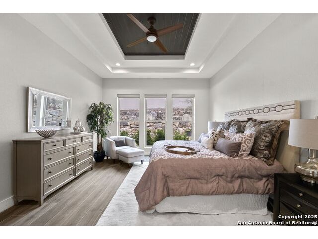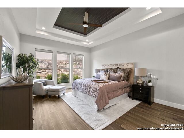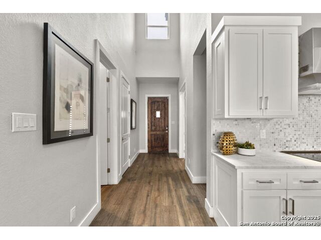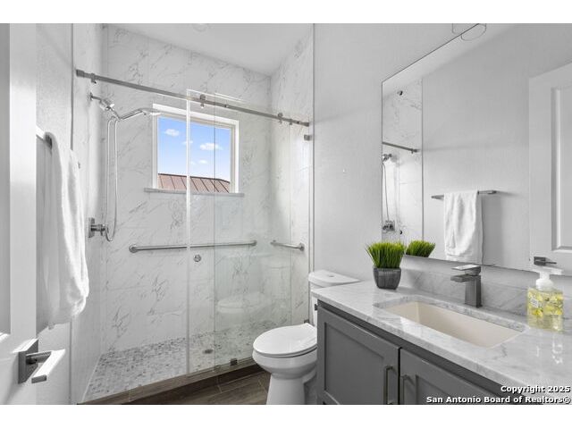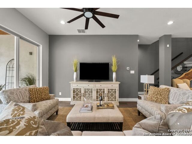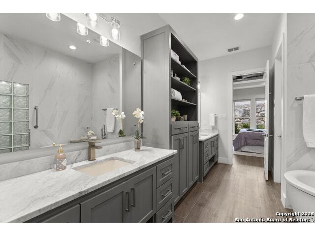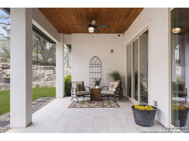 Stunning Luxury Home in the prestigious Dominion Golf and Country Club Community. Experience this stunning home located in the highly coveted Dominion neighborhood. Thoughtfully designed with 13-foot ceilings, rich hardwood floors, and hand-built cabinetry, this residence offers a perfect blend of sophistication and comfort. The primary bedroom is conveniently located on the main floor, providing a peaceful retreat. An additional office or fourth bedroom off the entry adds flexibility for work or guests. Upstairs, a spacious game room with two generously sized bedrooms, each with its private bathroom, ensure privacy and convenience. The heart of the home is the open-concept living and dining area, seamlessly flowing into a gourmet kitchen with custom cabinetry, gorgeous white marble countertops, and plenty of storage. A large covered patio extends your living space outdoors, perfect for entertaining or unwinding while enjoying the serenity of the gated Dominion community. Additional features include a metal and tile roof, water softener, high-speed internet, a large laundry room, and an epoxy-coated garage floor, all designed for modern luxury living. Located near world-class shopping, dining, golf courses, and top-rated schools, this home is a rare opportunity to own a piece of Dominion's finest living in San Antonio. House is ready to show. See showing instructions.