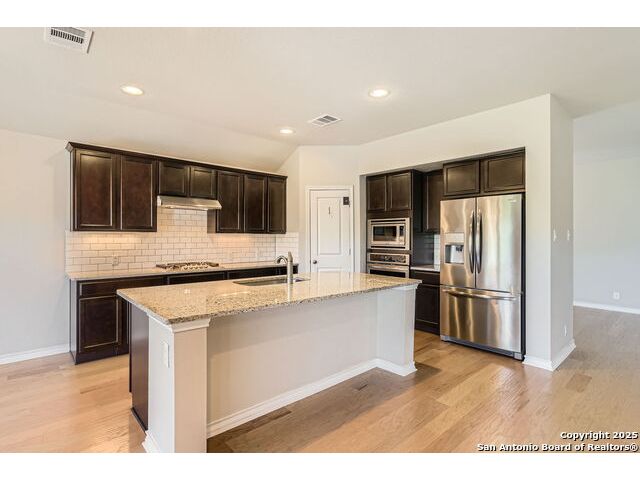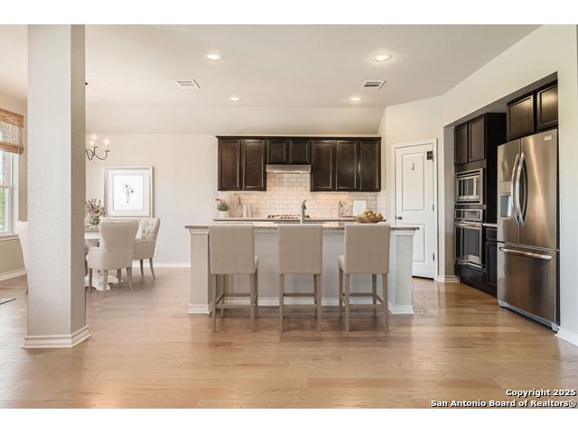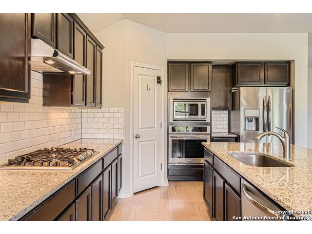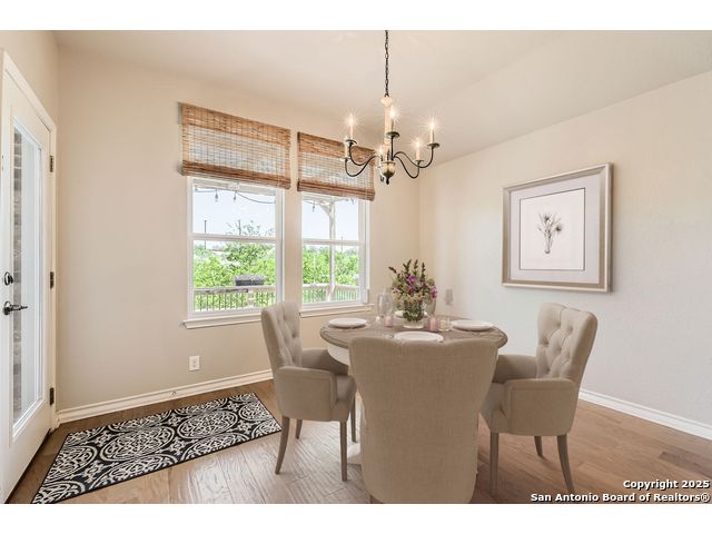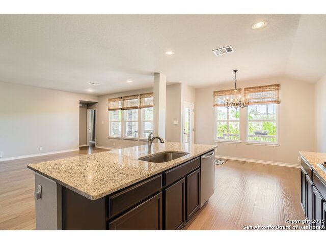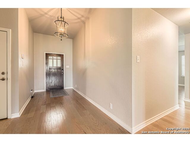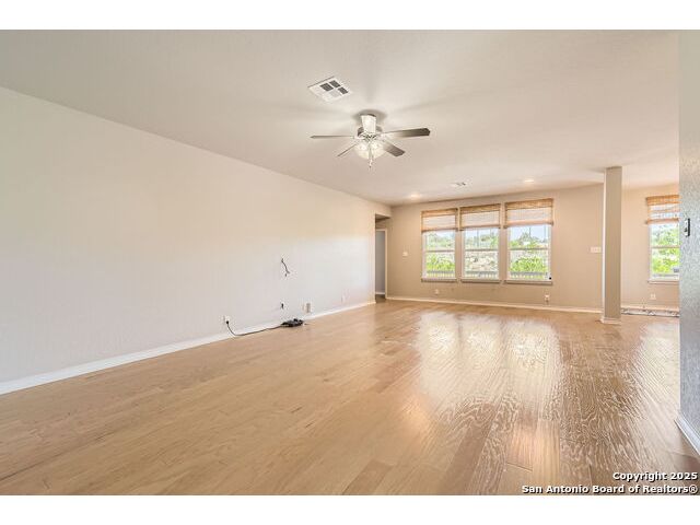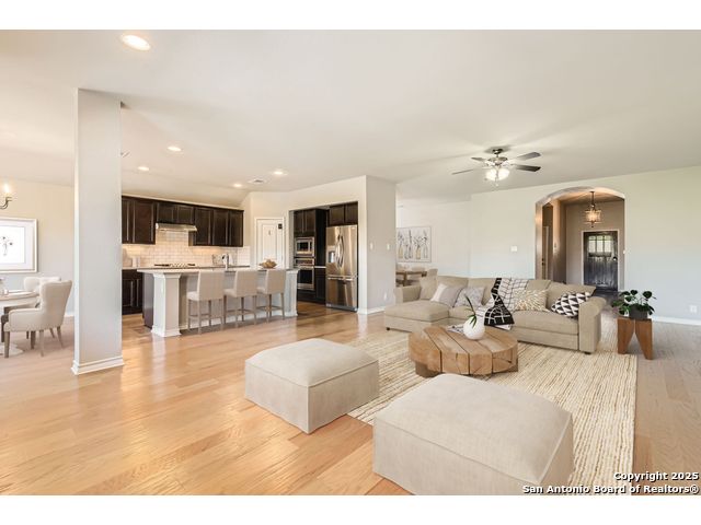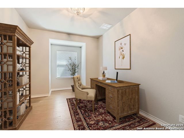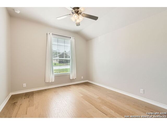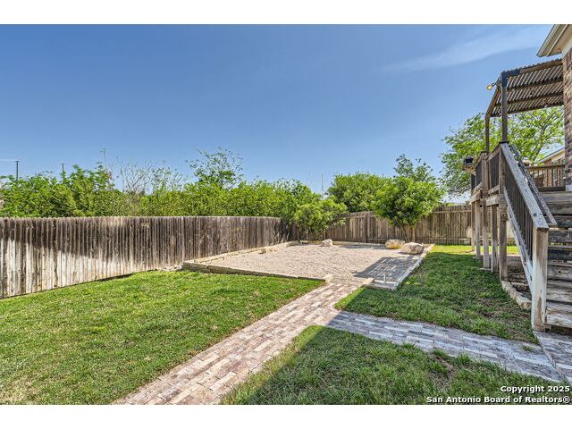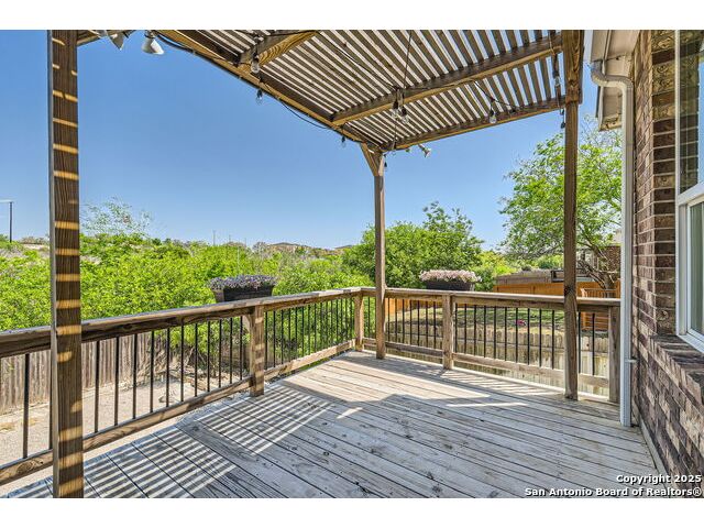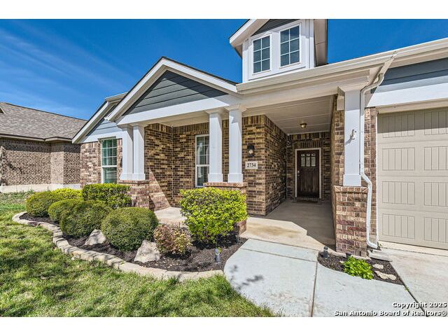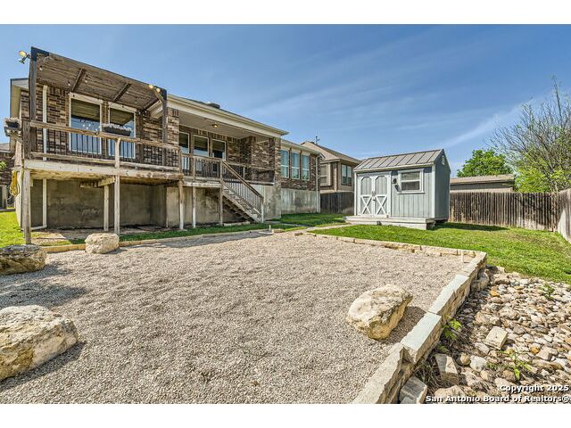Sunlight streams across warm wood floors in this thoughtfully designed Highland Homes residence. The open floor plan creates natural flow between the large dining room, kitchen, and breakfast area, where a granite-topped island with undermount farm sink serves as both workspace and gathering spot. The kitchen features abundant storage including a walk-in pantry, with the refrigerator conveying with the home. The primary bedroom occupies its own wing, separated from the secondary bedrooms for privacy. Between those secondary bedrooms lies a versatile retreat/gameroom, perfect for playtime or movie night. The dedicated study could easily convert to a fifth bedroom if needed, complementing the existing four bedroom, two bath configuration. Technology integration remains seamless with Cat5 and cable connections in all rooms, while upgraded lighting fixtures throughout add distinctive character. Window treatments throughout the home will remain, saving you immediate decorating expenses. Outdoor living receives equal attention with a covered patio extended by a custom-built deck. Above the deck, a pergola creates dappled shade during summer months. The backyard faces a dedicated greenbelt space, ensuring permanent natural views and privacy. A workshop with electricity and plenty of storage provides ample space for projects and seasonal storage. The oversized 2.5-car garage offers abundant space for vehicles plus storage or a hobby area. This single-story design eliminates stairs while maximizing livable space and functionality for today's lifestyle. Preferred lender is offering a 1% lender concession for the buyer to use towards closing costs and/or interest rate buydown. Combine with 2% seller concessions to use for temporary/permanent rate buydown or closing costs.