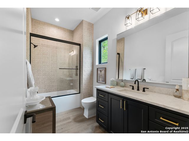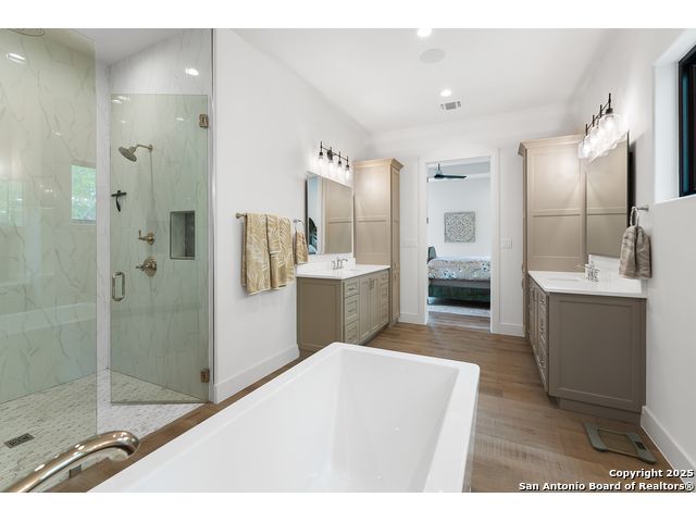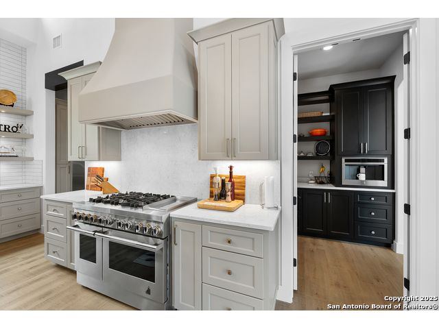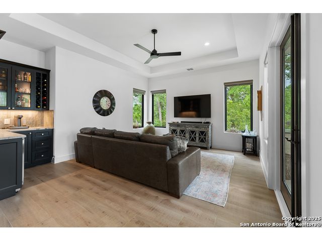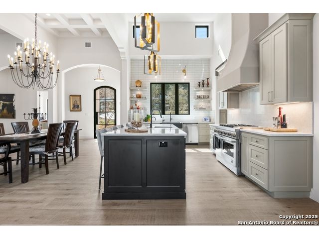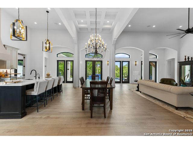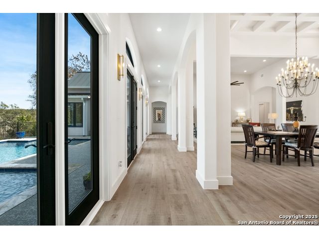 Welcome to 11207 Paraisio Bluff, a true custom home nestled in the exclusive, guard-gated community of Anaqua Springs Ranch. Thoughtfully designed in collaboration with a professional interior designer, this 4-bedroom, 3.5-bathroom home sits on a serene 1.13-acre lot and offers over 3,600 square feet of sophisticated living space infused with style, comfort, and functionality. From the moment you enter, you're greeted by breathtaking architectural details- arched entryways, custom wall treatments, and soaring ceilings with intricate design elements that create a truly curated feel throughout the home. The open-concept floor plan features a chef's kitchen with high-end appliances, custom cabinetry, and an oversized island that flows seamlessly into the elegant living and dining areas- perfect for both everyday living and entertaining. The primary suite is a serene retreat with a spa-inspired bathroom, complete with a soaking tub, walk-in shower, and dual vanities. Secondary bedrooms are generously sized with custom touches throughout. Step outside to your private oasis- an expansive covered patio overlooks a custom-designed pool surrounded by mature trees and Hill Country views. The oversized garage includes a built-in dog spa for your furry companions and ample storage space. Surrounded by natural beauty, this home offers the ultimate blend of luxury, design, and elegance that is not only seen, but felt.