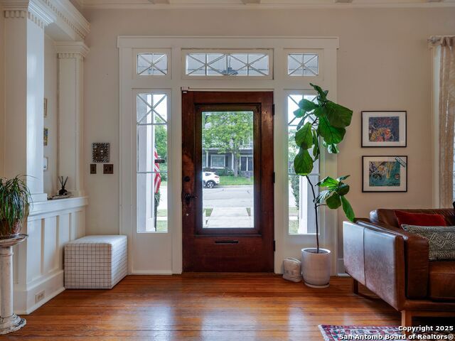 Open House Sunday November 16th 3pm-5pm. UrbanLiving Inside410 - Historic Greek Revival home in Monte Vista, originally built in 1890 by A.G. Dugger and moved to its current location from East Mulberry in 1910. Known as the Sam Napel home, this two-story residence offers 4 bedrooms, 2 baths, and a rare basement, blending timeless architecture with everyday comfort. A grand covered front porch with stately columns and a screened upper porch add to the home's classic appeal. Inside, the formal living room features beamed 10-foot ceilings, hardwood floors, an imposing fireplace, and custom-built-in shelving. Transom and sidelight windows fill the home with natural light. The formal dining room includes pocket doors, chair railing, and picture molding. The kitchen boasts a sink beneath large windows, glass-front cabinets, gas cooking, a walk-in pantry, a butler's pantry, and a roomy breakfast room. A built-in storage bench beneath the staircase offers a welcoming spot to pause before heading upstairs. The primary bedroom is on the main floor with an adjoining bath featuring a tub/shower combo. Upstairs, a spacious landing with a curved railing provides the perfect nook for reading, art, or study. Three additional bedrooms and one full bath complete the second floor, including an 18x15 bedroom with excellent potential to convert into a second primary suite. Located just minutes from the Pearl, Zoo, museums, downtown, and within walking distance to restaurants, shops, and several private schools, this home is a rare opportunity to customize in historic Monte Vista. Seller replaced both HVAC units between June and Aug. of 2025!