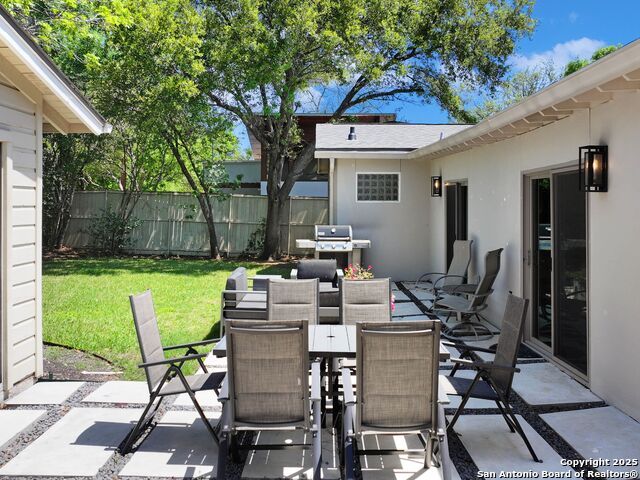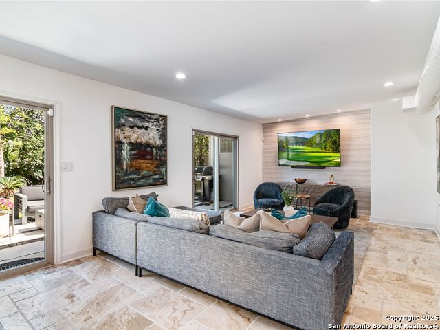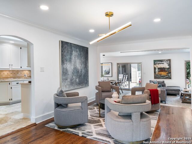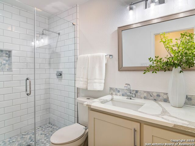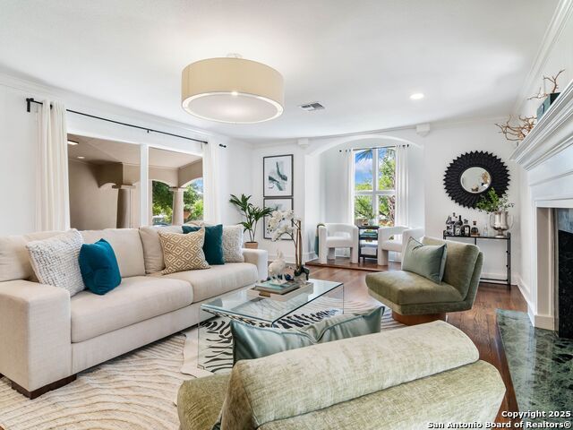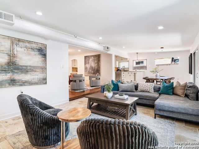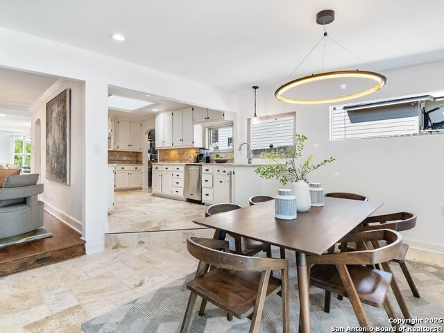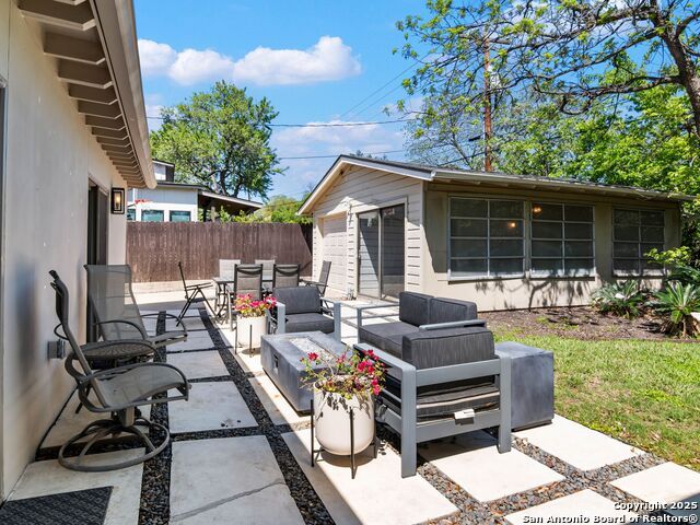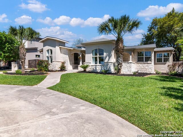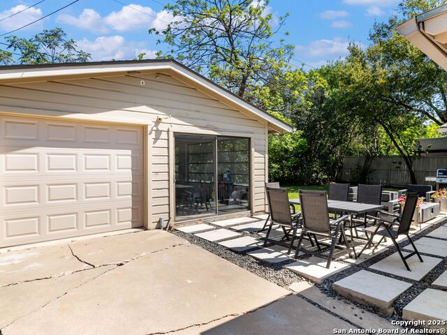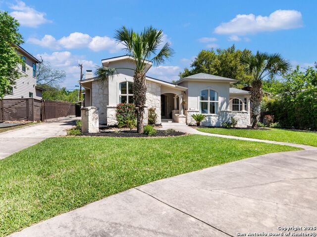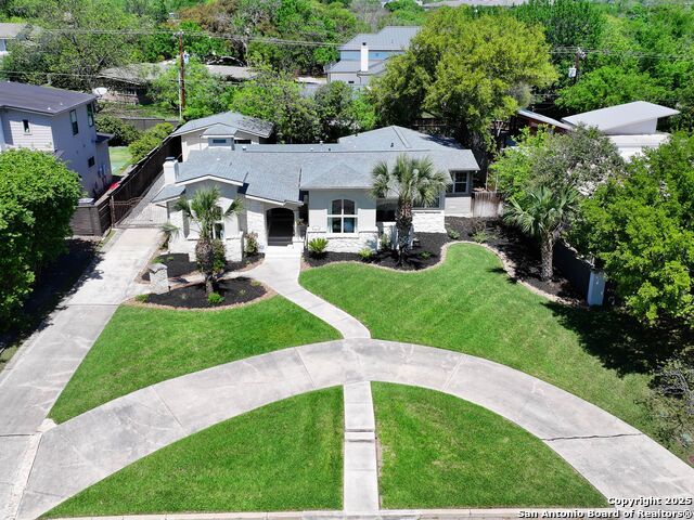Pristine and updated one story home in Terrell Hills. Approaching from the circular drive, the thoughtful architectural details are evident enhancing this homes character and create an inviting ambiance; which is highlighted by the ample windows, recently installed custom wrought iron door, crown molding, true hardwood floors, and arch detailing, and travertine flooring. Light and bright floor plan with offers space for all with multiple living areas. Sitting area connects the formal living and family room, perfect for entertaining and provides space for all. Kitchen opens to breakfast area with commercial grade gas range boasting 2 ovens, stunning countertops, and spacious walk in pantry. Spacious primary suite with fully remodeled bath and walk in closest. 3 Secondary bedrooms each with close proximity to 2 fully updated bathrooms. 4th bedroom could function as separate office space. Fully fenced backyard with vast modern paver patio provides the perfect outdoor lounge space and overlooks lush yard and landscape. Detached one car garage provides ample storage with an attached flex room that would make a great storage room, secondary office space, game room, etc. Conveniently located near exquisite restaurants, shopping, downtown, San Antonio Airport, and within the desirable Alamo Heights ISD. See features list for full list of upgrades to include HVAC 2021, Water Heater 2021, interior painting, refinished hardwood floors, and more! Per appraiser sketch 2906 main house and 449 square foot detached building / total square footage 3,355 / BCAD SQFT 3188