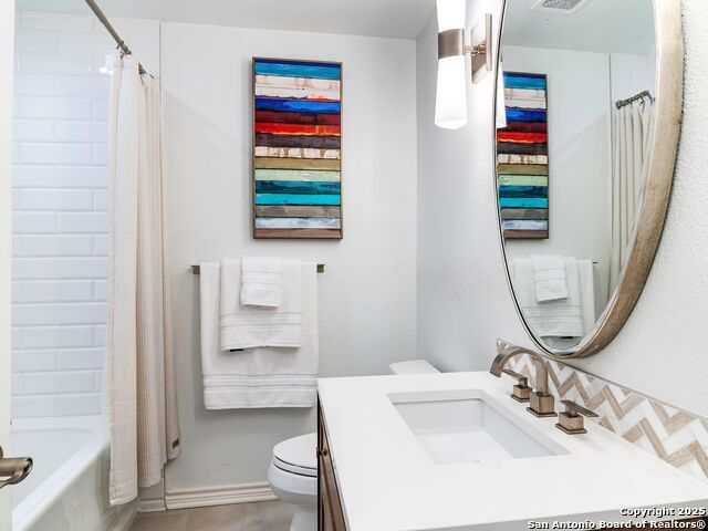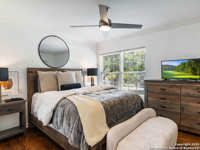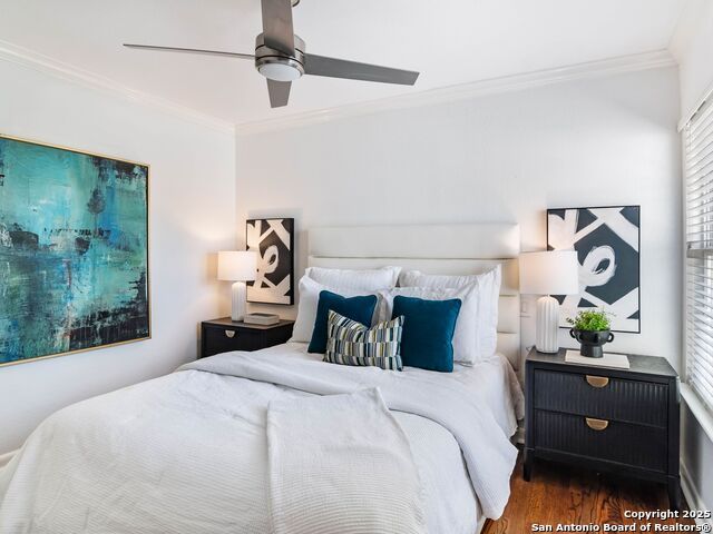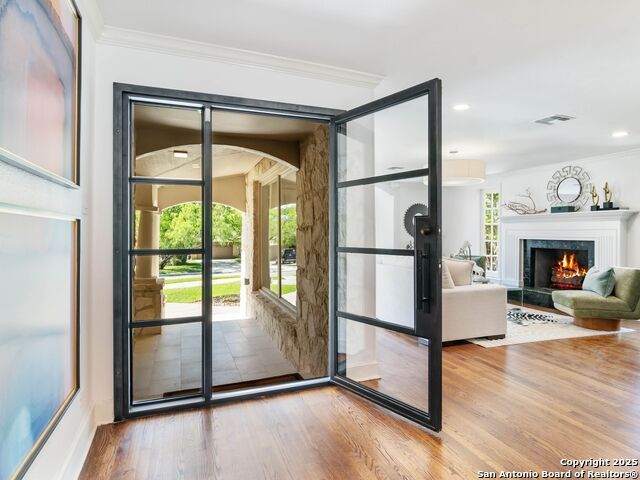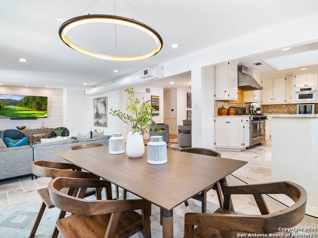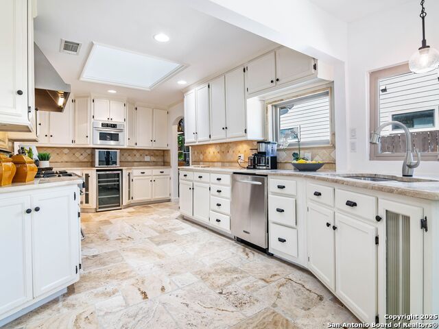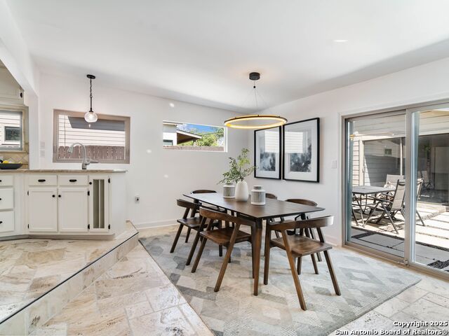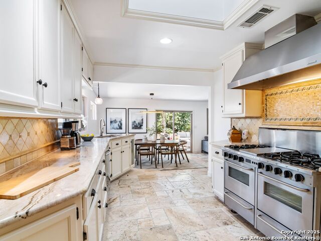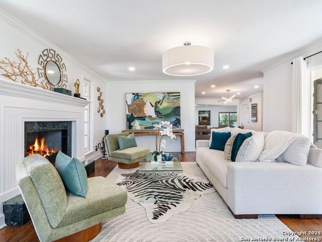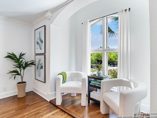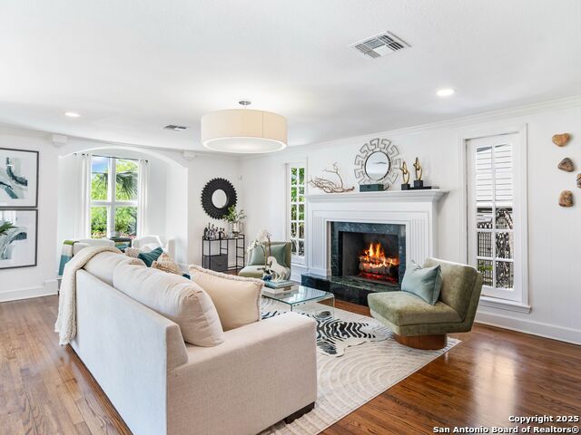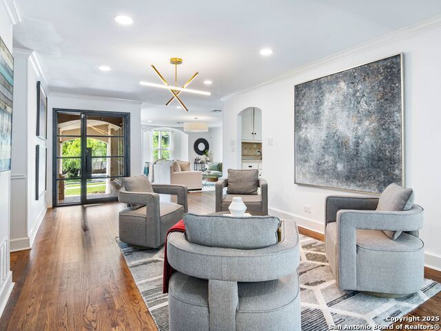 Pristine and updated one story home in Terrell Hills. Approaching from the circular drive, the thoughtful architectural details are evident enhancing this homes character and create an inviting ambiance; which is highlighted by the ample windows, recently installed custom wrought iron door, crown molding, true hardwood floors, and arch detailing, and travertine flooring. Light and bright floor plan with offers space for all with multiple living areas. Sitting area connects the formal living and family room, perfect for entertaining and provides space for all. Kitchen opens to breakfast area with commercial grade gas range boasting 2 ovens, stunning countertops, and spacious walk in pantry. Spacious primary suite with fully remodeled bath and walk in closest. 3 Secondary bedrooms each with close proximity to 2 fully updated bathrooms. 4th bedroom could function as separate office space. Fully fenced backyard with vast modern paver patio provides the perfect outdoor lounge space and overlooks lush yard and landscape. Detached one car garage provides ample storage with an attached flex room that would make a great storage room, secondary office space, game room, etc. Conveniently located near exquisite restaurants, shopping, downtown, San Antonio Airport, and within the desirable Alamo Heights ISD. See features list for full list of upgrades to include HVAC 2021, Water Heater 2021, interior painting, refinished hardwood floors, and more! Per appraiser sketch 2906 main house and 449 square foot detached building / total square footage 3,355 / BCAD SQFT 3188