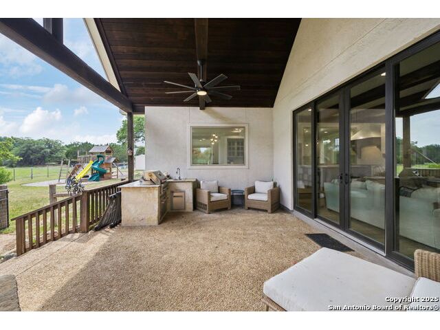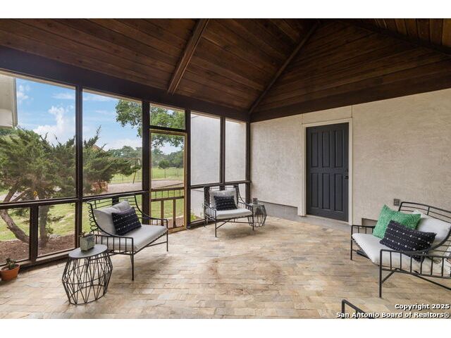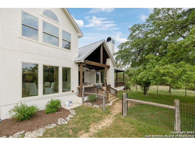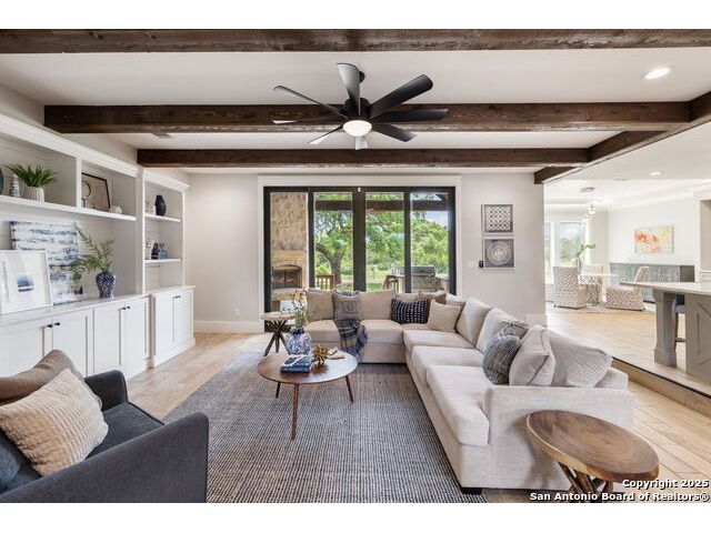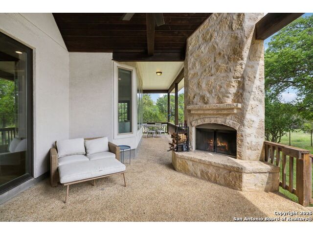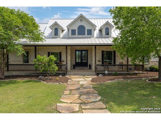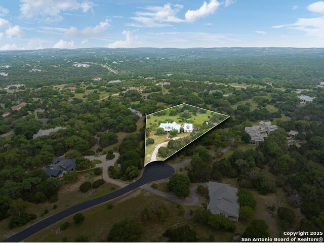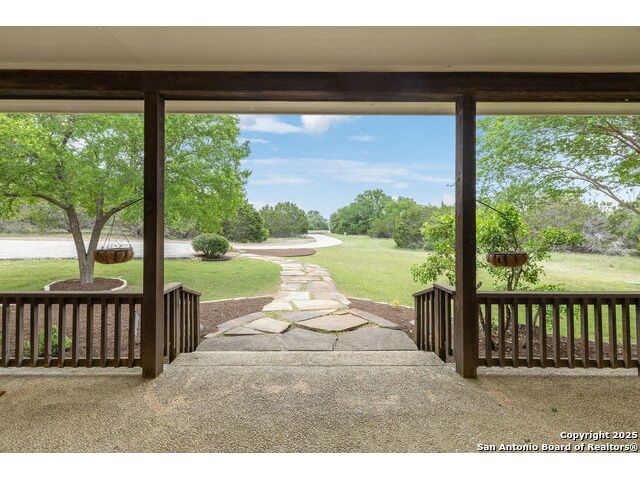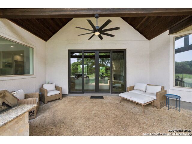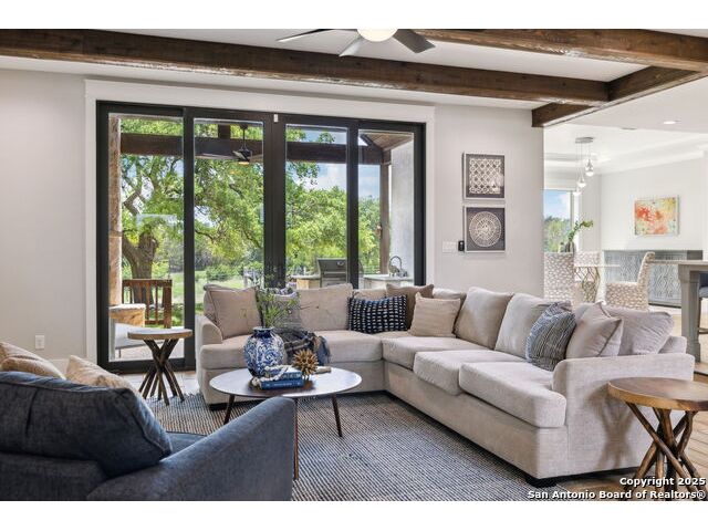 Sited on 3.75 acres in Cordillera Ranch, this ranch-style residence offers a blend of privacy, generous scale, and refined Hill Country living. Surrounded by mature trees and thoughtfully arranged outdoor spaces, the property features a wide front porch, a full outdoor kitchen, and a wraparound deck-each element designed to foster both quiet retreat and effortless entertaining. Inside, the spacious layout and traditional materials define the home's character. The foyer leads to a generous living area with soaring ceilings, oversized windows, and statement wood beams that underscore the refined interiors. A private study with built-ins and a formal dining room offer elegant spaces for work and gathering. The kitchen, crafted for both function and ease, is outfitted with a Viking oven beneath a custom wood vent hood and range, KitchenAid refrigerator and microwave, Ice-O-Matic ice maker, and a large center island. The expansive main-floor primary suite includes a custom closet system and a private bath, while three additional bedrooms-each with walk-in closets and en-suite baths-offer ample comfort for family or guests. Additional interior highlights include a game room, media room, oversized utility areas, and a spacious screened-in porch. A detached three-car garage with a full apartment above provides flexible use as a guest suite or studio. Community amenities include access to Cordillera Ranch's private Guadalupe River Park, Jack Nicklaus Signature Golf Course, and club facilities. This property blends traditional aesthetics with enduring livability in one of Boerne's most established gated communities. Please note: this property does not include a Master Golf Membership.