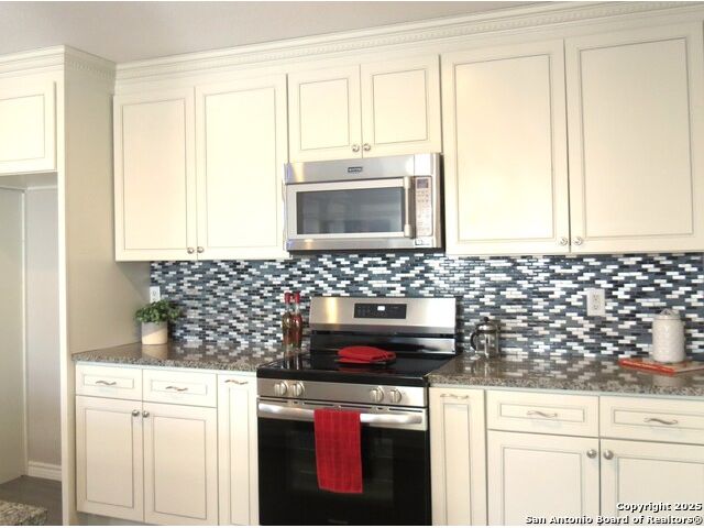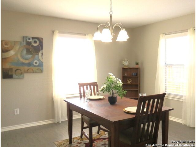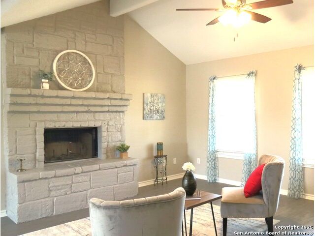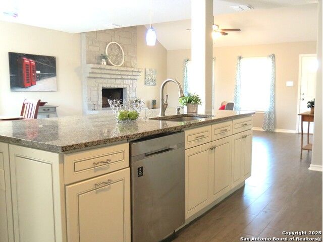 Completely updated and beautiful. Island kitchen with stainless appliances, granite counters, tile backsplash, and a breakfast bar. Open floor plan. All faux wood flooring, no carpet for easy cleaning. Fresh paint inside and out. Inviting fireplace. New 2 inch blinds and window treatments are included. Covered front porch. New energy efficient heat pump AC and heat system 2025.