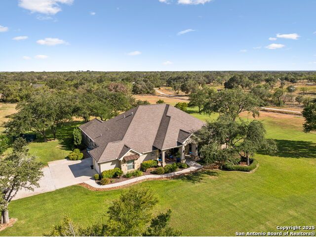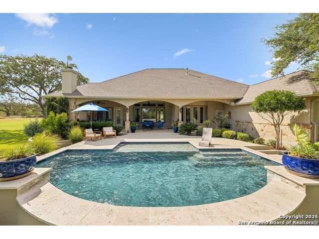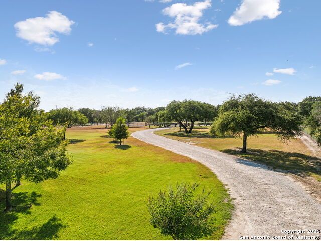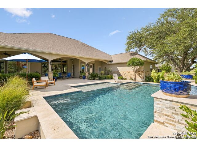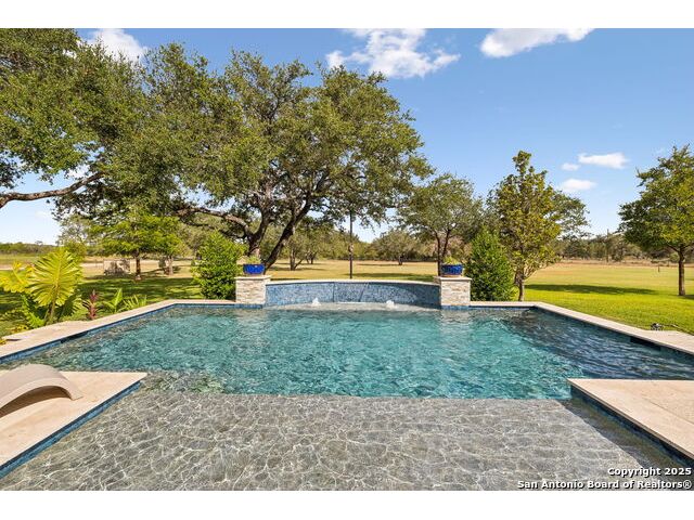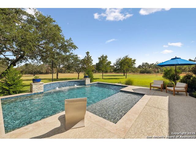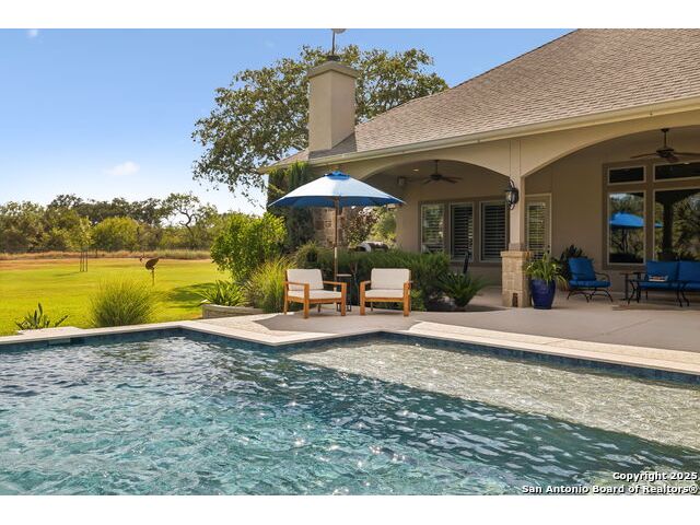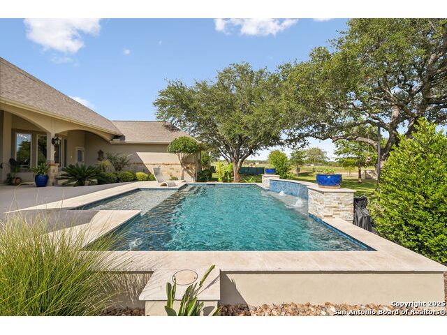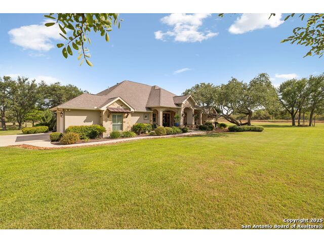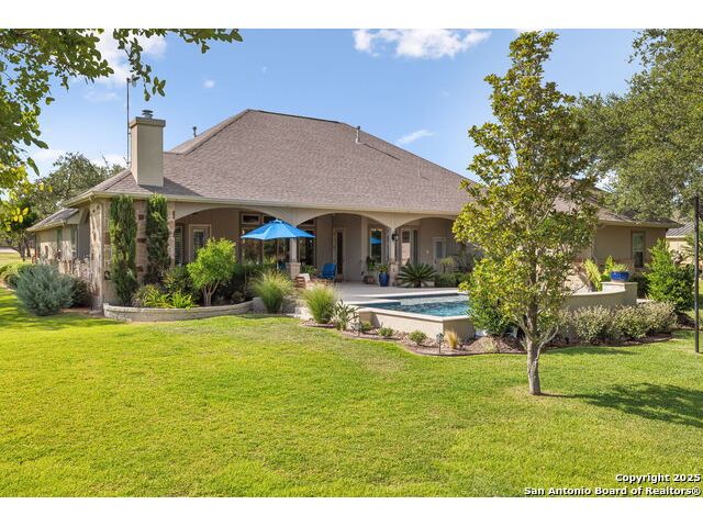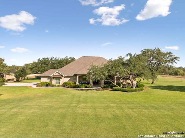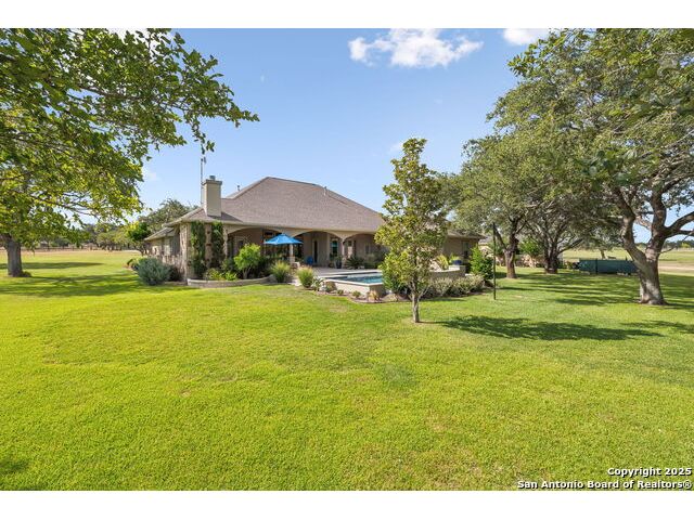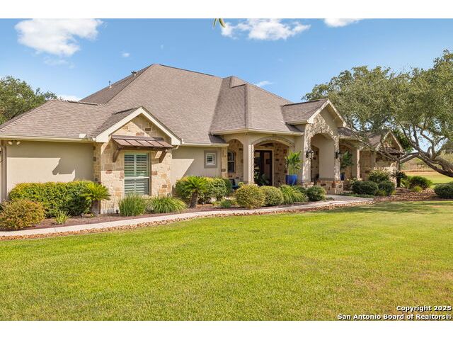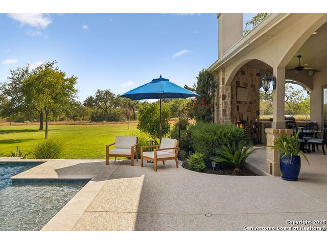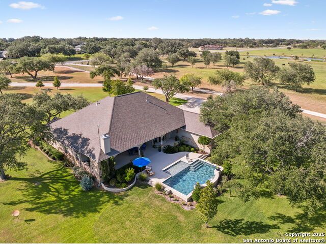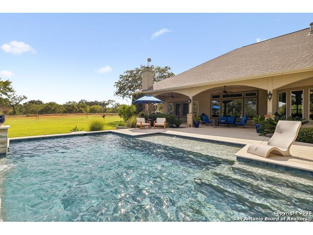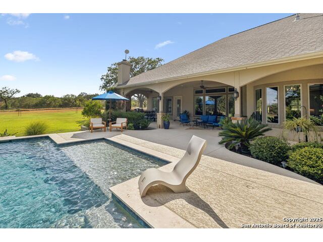 Luxury properties like this one don't become available very often, especially less than half an hour from downtown San Antonio. Welcome to your dream home nestled on 5 acres! This meticulously maintained paradise offers a single-story transitional custom home and a custom built workshop. The home features 3 bedrooms, 2 full bathrooms and 1 half bath, which has outdoor access to the sparkling pool and patio. Upon entry, you are greeted by a bright and open design with views of the pool through the seamless wall of windows. To the right is the home office/flex space with glass & wood French doors and views of the lushly landscaped front yard. As you enter into the living room, you are greeted with a wall of televisions for the ultimate entertainment experience, including surround sound speakers that extend to the primary bedroom and bath as well as the front and back patios: all controlled from the designated media closet. The fabulous open floorplan is perfect for entertaining family and friends. The gourmet island kitchen is a chef's dream, complete with state-of-the-art JennAir appliances: 6 burner gas cook top, under counter microwave drawer, plus double wall ovens, dishwasher, and refrigerator in the open concept butler's kitchen and a walk-in pantry. The breakfast area offers plenty of space for casual dining or adding a more formal touch with the coffee/wine bar and mini wine refrigerator. The peaceful primary suite enjoys outside access to the patio and pool and features a stunning bath with his and her walk-in closets, dual vanities, oversized walk-in shower that includes a rain shower system with body jets, walk-in linen closet, and custom drawers with leather granite counters (this space is plumbed for a garden tub). The separate guest wing offers two additional bedrooms and a magnificent bathroom with oversized dual vanity space. The laundry room has a farm sink, separate utility closet and plenty of space for an additional refrigerator. The garage entry space welcomes you with a catch-all custom cabinetry, wall of hooks and a bench. The residence also features a generous oversized two-car garage with separate bays and additional storage space. The custom workshop is approximately 1,200 square feet, fully insulated and plumbed for bathroom, with single car garage door, attached carport: can equip two cars, RV, boat, or lawn equipment. The resort-style backyard is a serene oasis complete with gorgeous pool (built in late 2023), wood burning fireplace, and outdoor kitchen: Bull gas grill, sink and mini refrigerator. It's perfect for hosting and enjoying the evenings under the big Texas starlit sky. The property is professionally landscaped, including a sprinkler system that extends approximately 1 1/2 acres and drip irrigation for all the flower beds, filled with a variety of oak trees and highlighted by professional lighting. The property has its own water well, in addition to access to the co-op water supply system. It is secured by an automatic custom iron gate, surrounded by five-row barbwire fencing and overlayed with ranch fencing. With the convenience of being just a few minutes from both IH-37 and US Hwy 281 and less than 30 minutes to downtown San Antonio, this is your opportunity to make this exceptional property your home!