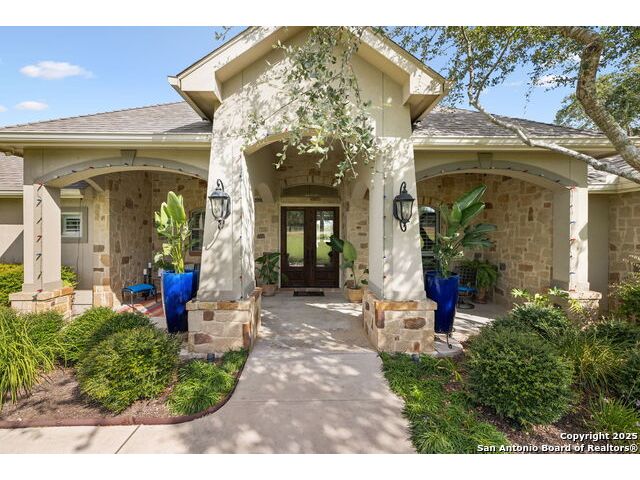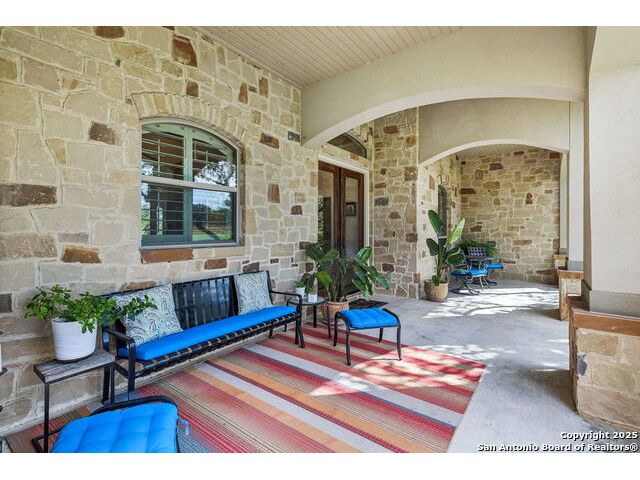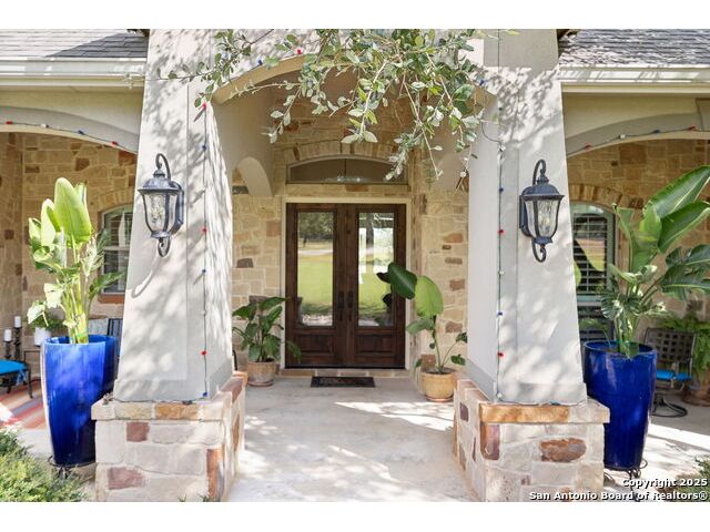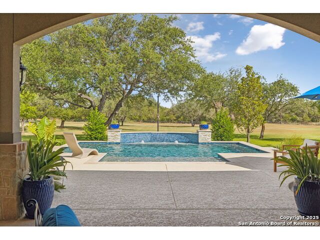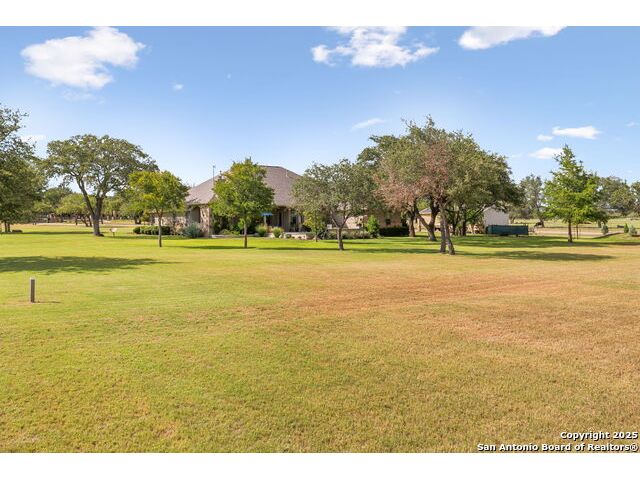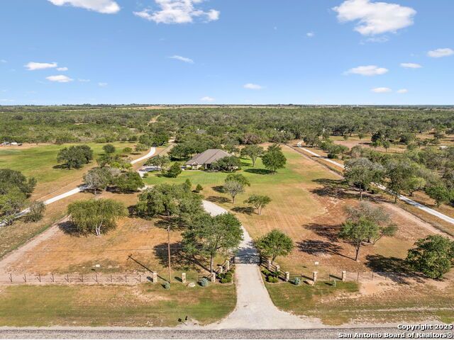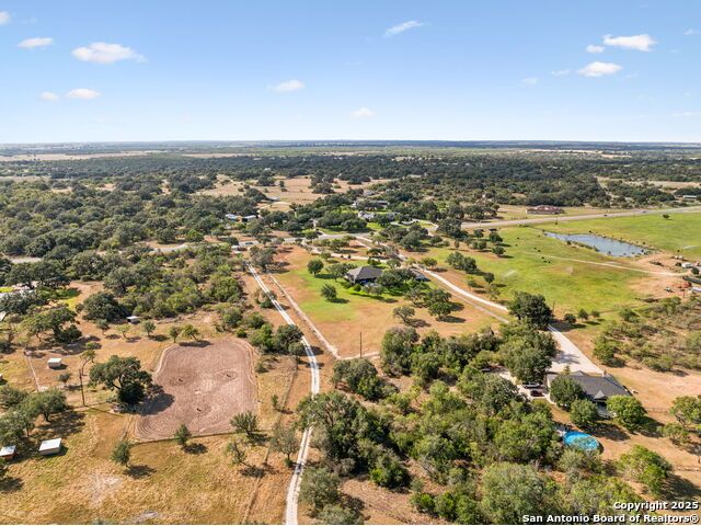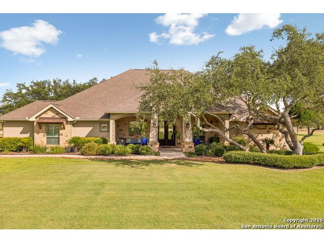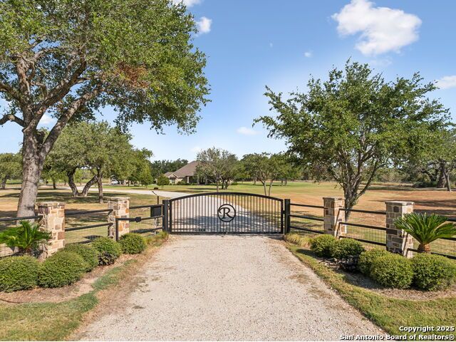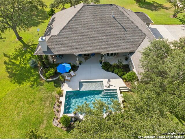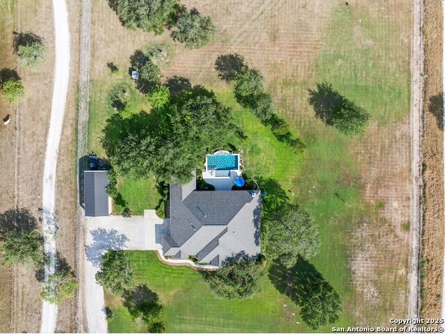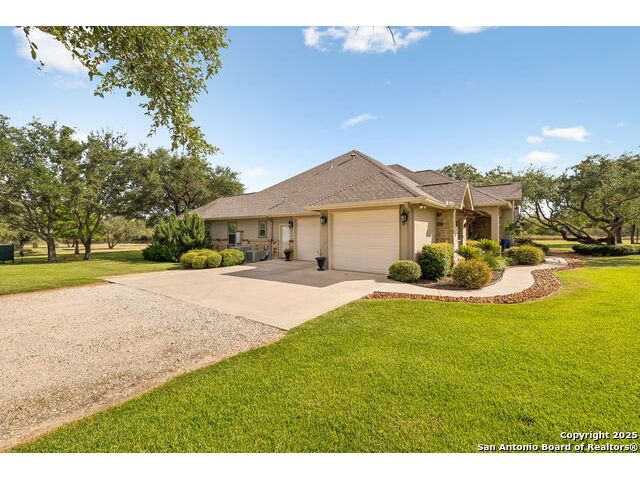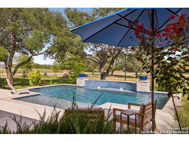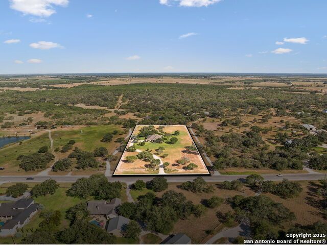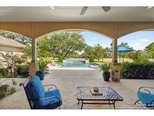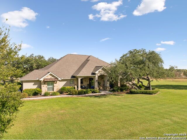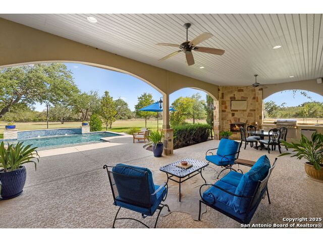 Luxury properties like this one don't become available very often, especially less than half an hour from downtown San Antonio. Welcome to your dream home nestled on 5 acres! This meticulously maintained paradise offers a single-story transitional custom home and a custom built workshop. The home features 3 bedrooms, 2 full bathrooms and 1 half bath, which has outdoor access to the sparkling pool and patio. Upon entry, you are greeted by a bright and open design with views of the pool through the seamless wall of windows. To the right is the home office/flex space with glass & wood French doors and views of the lushly landscaped front yard. As you enter into the living room, you are greeted with a wall of televisions for the ultimate entertainment experience, including surround sound speakers that extend to the primary bedroom and bath as well as the front and back patios: all controlled from the designated media closet. The fabulous open floorplan is perfect for entertaining family and friends. The gourmet island kitchen is a chef's dream, complete with state-of-the-art JennAir appliances: 6 burner gas cook top, under counter microwave drawer, plus double wall ovens, dishwasher, and refrigerator in the open concept butler's kitchen and a walk-in pantry. The breakfast area offers plenty of space for casual dining or adding a more formal touch with the coffee/wine bar and mini wine refrigerator. The peaceful primary suite enjoys outside access to the patio and pool and features a stunning bath with his and her walk-in closets, dual vanities, oversized walk-in shower that includes a rain shower system with body jets, walk-in linen closet, and custom drawers with leather granite counters (this space is plumbed for a garden tub). The separate guest wing offers two additional bedrooms and a magnificent bathroom with oversized dual vanity space. The laundry room has a farm sink, separate utility closet and plenty of space for an additional refrigerator. The garage entry space welcomes you with a catch-all custom cabinetry, wall of hooks and a bench. The residence also features a generous oversized two-car garage with separate bays and additional storage space. The custom workshop is approximately 1,200 square feet, fully insulated and plumbed for bathroom, with single car garage door, attached carport: can equip two cars, RV, boat, or lawn equipment. The resort-style backyard is a serene oasis complete with gorgeous pool (built in late 2023), wood burning fireplace, and outdoor kitchen: Bull gas grill, sink and mini refrigerator. It's perfect for hosting and enjoying the evenings under the big Texas starlit sky. The property is professionally landscaped, including a sprinkler system that extends approximately 1 1/2 acres and drip irrigation for all the flower beds, filled with a variety of oak trees and highlighted by professional lighting. The property has its own water well, in addition to access to the co-op water supply system. It is secured by an automatic custom iron gate, surrounded by five-row barbwire fencing and overlayed with ranch fencing. With the convenience of being just a few minutes from both IH-37 and US Hwy 281 and less than 30 minutes to downtown San Antonio, this is your opportunity to make this exceptional property your home!