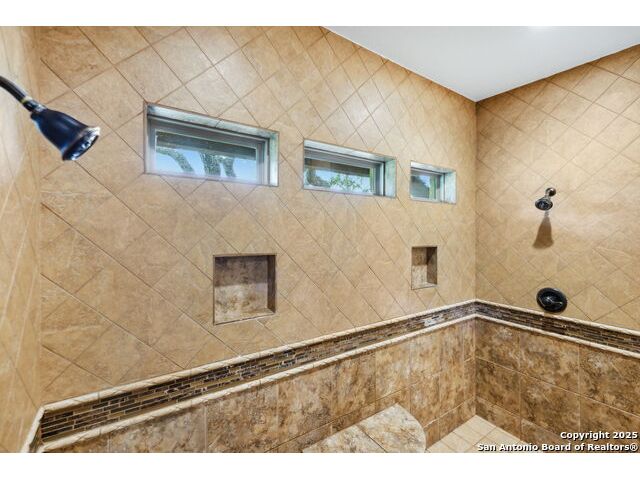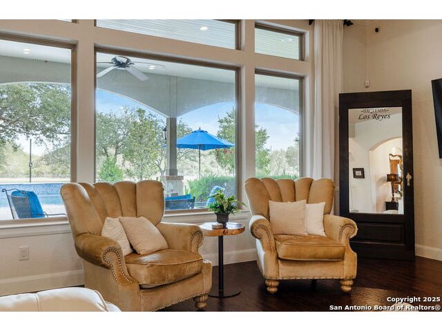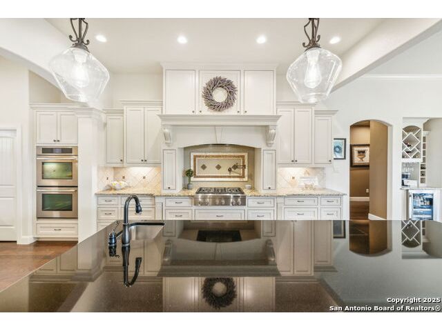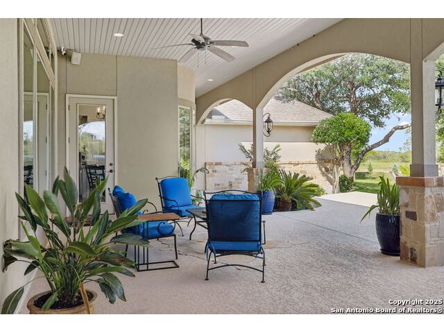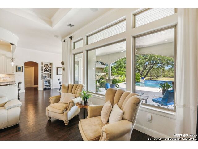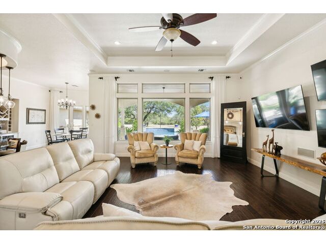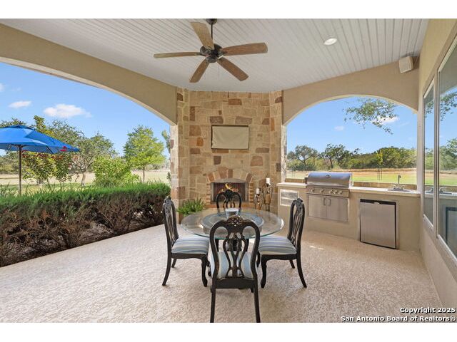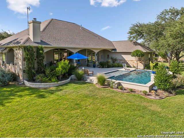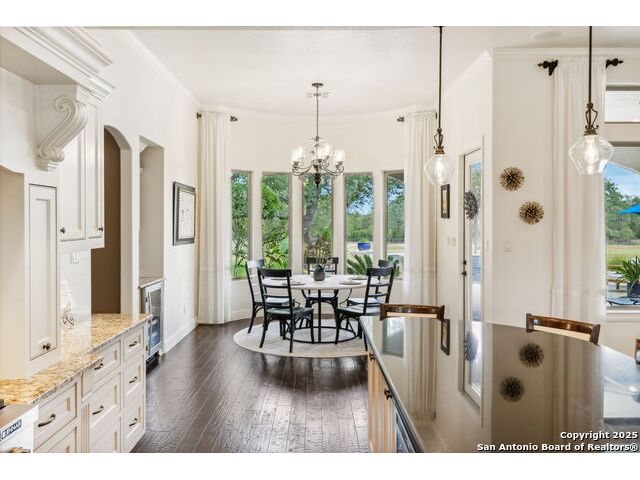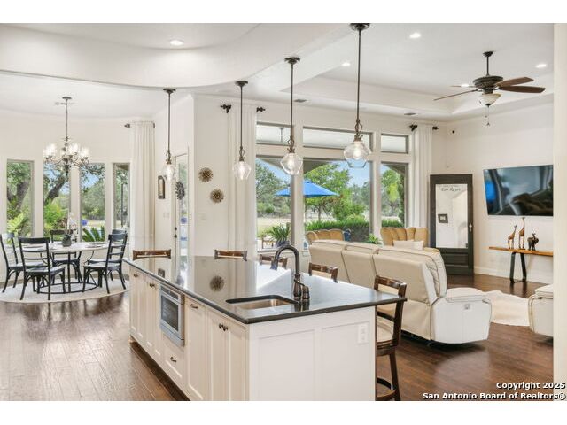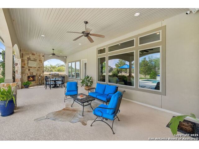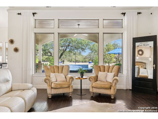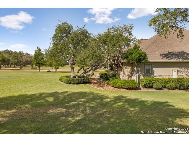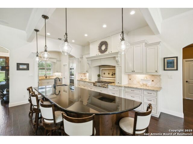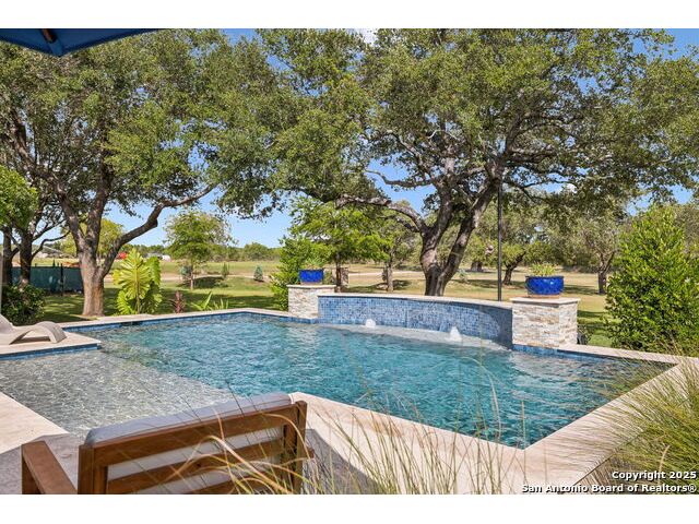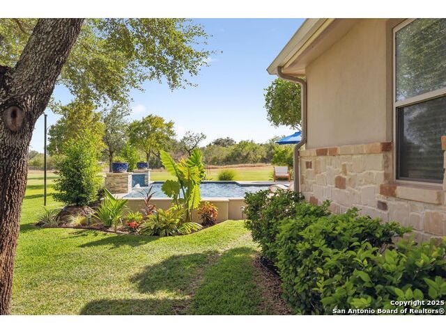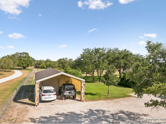 Luxury properties like this one don't become available very often, especially less than half an hour from downtown San Antonio. Welcome to your dream home nestled on 5 acres! This meticulously maintained paradise offers a single-story transitional custom home and a custom built workshop. The home features 3 bedrooms, 2 full bathrooms and 1 half bath, which has outdoor access to the sparkling pool and patio. Upon entry, you are greeted by a bright and open design with views of the pool through the seamless wall of windows. To the right is the home office/flex space with glass & wood French doors and views of the lushly landscaped front yard. As you enter into the living room, you are greeted with a wall of televisions for the ultimate entertainment experience, including surround sound speakers that extend to the primary bedroom and bath as well as the front and back patios: all controlled from the designated media closet. The fabulous open floorplan is perfect for entertaining family and friends. The gourmet island kitchen is a chef's dream, complete with state-of-the-art JennAir appliances: 6 burner gas cook top, under counter microwave drawer, plus double wall ovens, dishwasher, and refrigerator in the open concept butler's kitchen and a walk-in pantry. The breakfast area offers plenty of space for casual dining or adding a more formal touch with the coffee/wine bar and mini wine refrigerator. The peaceful primary suite enjoys outside access to the patio and pool and features a stunning bath with his and her walk-in closets, dual vanities, oversized walk-in shower that includes a rain shower system with body jets, walk-in linen closet, and custom drawers with leather granite counters (this space is plumbed for a garden tub). The separate guest wing offers two additional bedrooms and a magnificent bathroom with oversized dual vanity space. The laundry room has a farm sink, separate utility closet and plenty of space for an additional refrigerator. The garage entry space welcomes you with a catch-all custom cabinetry, wall of hooks and a bench. The residence also features a generous oversized two-car garage with separate bays and additional storage space. The custom workshop is approximately 1,200 square feet, fully insulated and plumbed for bathroom, with single car garage door, attached carport: can equip two cars, RV, boat, or lawn equipment. The resort-style backyard is a serene oasis complete with gorgeous pool (built in late 2023), wood burning fireplace, and outdoor kitchen: Bull gas grill, sink and mini refrigerator. It's perfect for hosting and enjoying the evenings under the big Texas starlit sky. The property is professionally landscaped, including a sprinkler system that extends approximately 1 1/2 acres and drip irrigation for all the flower beds, filled with a variety of oak trees and highlighted by professional lighting. The property has its own water well, in addition to access to the co-op water supply system. It is secured by an automatic custom iron gate, surrounded by five-row barbwire fencing and overlayed with ranch fencing. With the convenience of being just a few minutes from both IH-37 and US Hwy 281 and less than 30 minutes to downtown San Antonio, this is your opportunity to make this exceptional property your home!