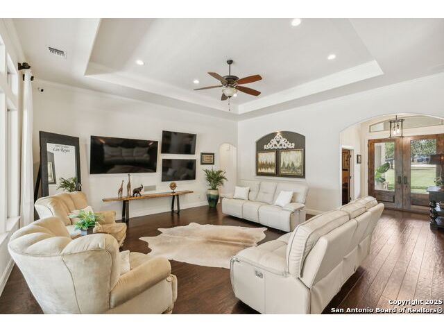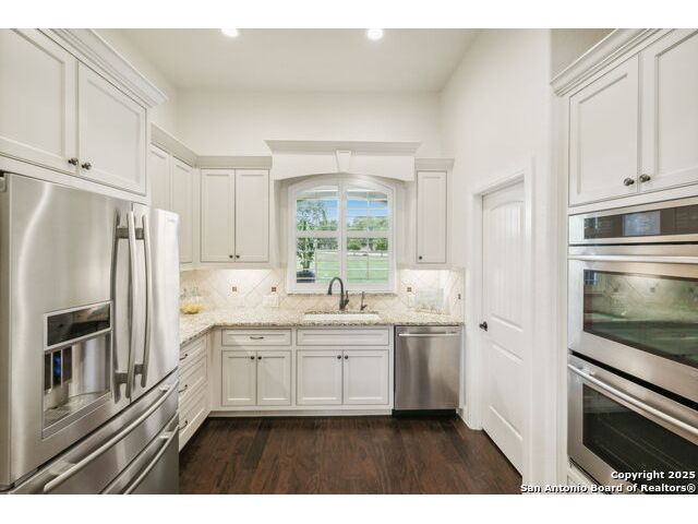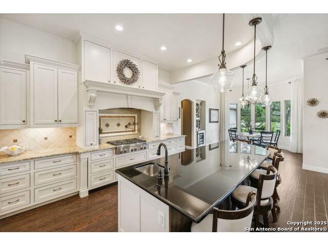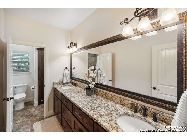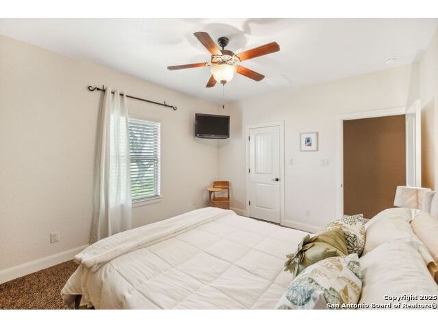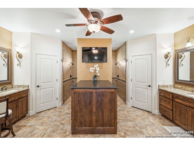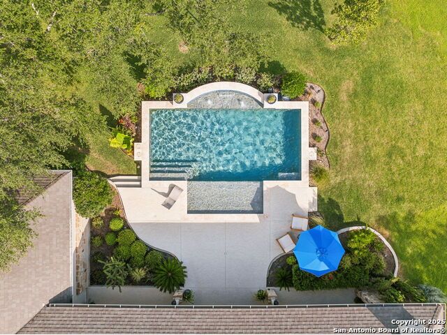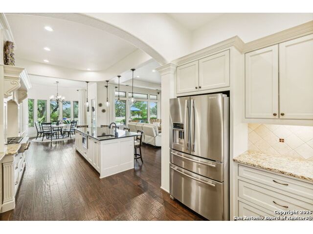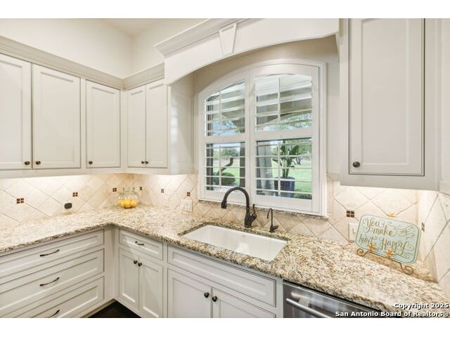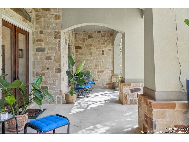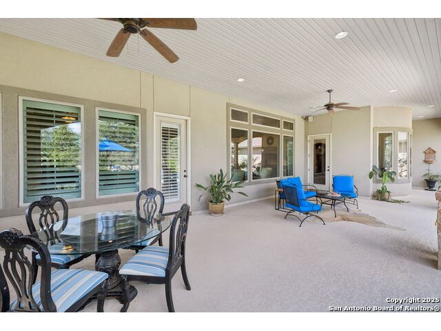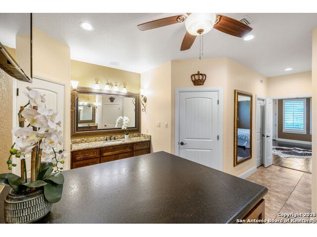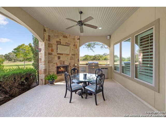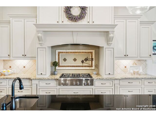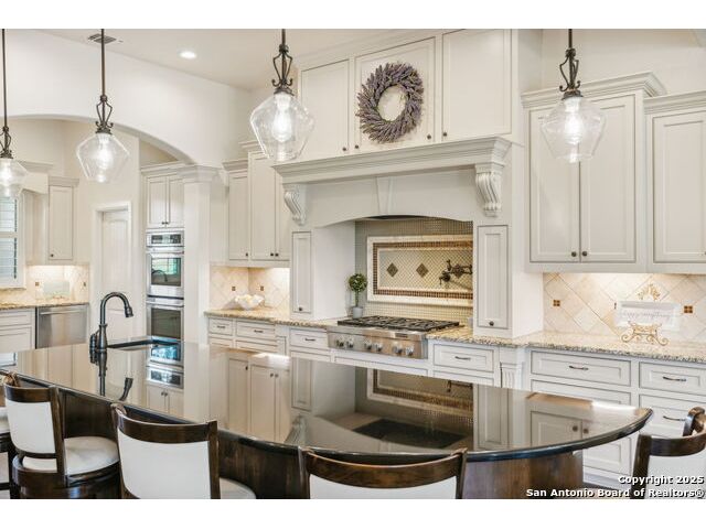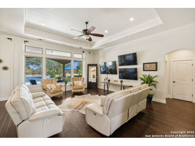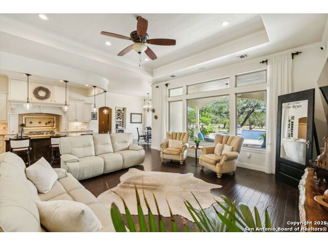 Luxury properties like this one don't become available very often, especially less than half an hour from downtown San Antonio. Welcome to your dream home nestled on 5 acres! This meticulously maintained paradise offers a single-story transitional custom home and a custom built workshop. The home features 3 bedrooms, 2 full bathrooms and 1 half bath, which has outdoor access to the sparkling pool and patio. Upon entry, you are greeted by a bright and open design with views of the pool through the seamless wall of windows. To the right is the home office/flex space with glass & wood French doors and views of the lushly landscaped front yard. As you enter into the living room, you are greeted with a wall of televisions for the ultimate entertainment experience, including surround sound speakers that extend to the primary bedroom and bath as well as the front and back patios: all controlled from the designated media closet. The fabulous open floorplan is perfect for entertaining family and friends. The gourmet island kitchen is a chef's dream, complete with state-of-the-art JennAir appliances: 6 burner gas cook top, under counter microwave drawer, plus double wall ovens, dishwasher, and refrigerator in the open concept butler's kitchen and a walk-in pantry. The breakfast area offers plenty of space for casual dining or adding a more formal touch with the coffee/wine bar and mini wine refrigerator. The peaceful primary suite enjoys outside access to the patio and pool and features a stunning bath with his and her walk-in closets, dual vanities, oversized walk-in shower that includes a rain shower system with body jets, walk-in linen closet, and custom drawers with leather granite counters (this space is plumbed for a garden tub). The separate guest wing offers two additional bedrooms and a magnificent bathroom with oversized dual vanity space. The laundry room has a farm sink, separate utility closet and plenty of space for an additional refrigerator. The garage entry space welcomes you with a catch-all custom cabinetry, wall of hooks and a bench. The residence also features a generous oversized two-car garage with separate bays and additional storage space. The custom workshop is approximately 1,200 square feet, fully insulated and plumbed for bathroom, with single car garage door, attached carport: can equip two cars, RV, boat, or lawn equipment. The resort-style backyard is a serene oasis complete with gorgeous pool (built in late 2023), wood burning fireplace, and outdoor kitchen: Bull gas grill, sink and mini refrigerator. It's perfect for hosting and enjoying the evenings under the big Texas starlit sky. The property is professionally landscaped, including a sprinkler system that extends approximately 1 1/2 acres and drip irrigation for all the flower beds, filled with a variety of oak trees and highlighted by professional lighting. The property has its own water well, in addition to access to the co-op water supply system. It is secured by an automatic custom iron gate, surrounded by five-row barbwire fencing and overlayed with ranch fencing. With the convenience of being just a few minutes from both IH-37 and US Hwy 281 and less than 30 minutes to downtown San Antonio, this is your opportunity to make this exceptional property your home!