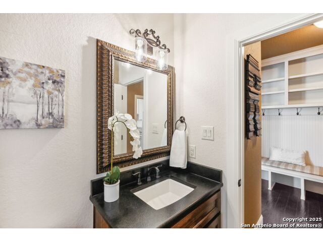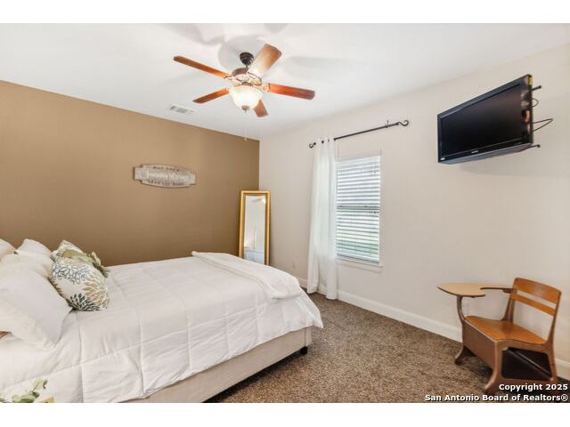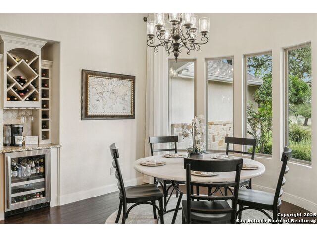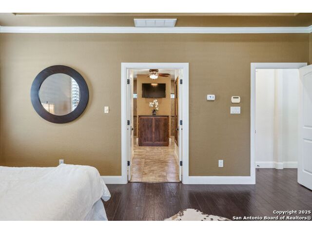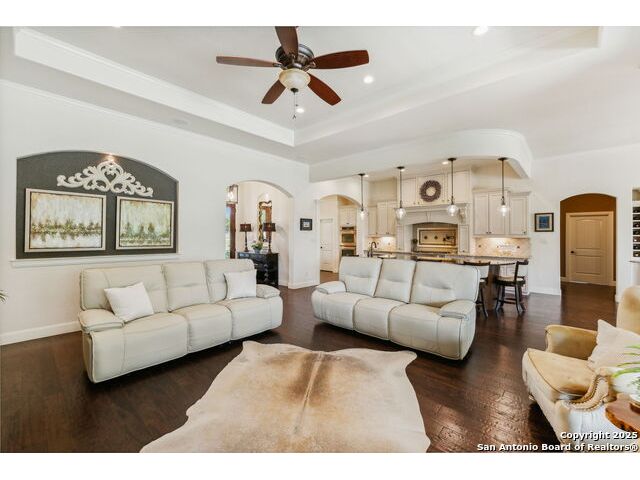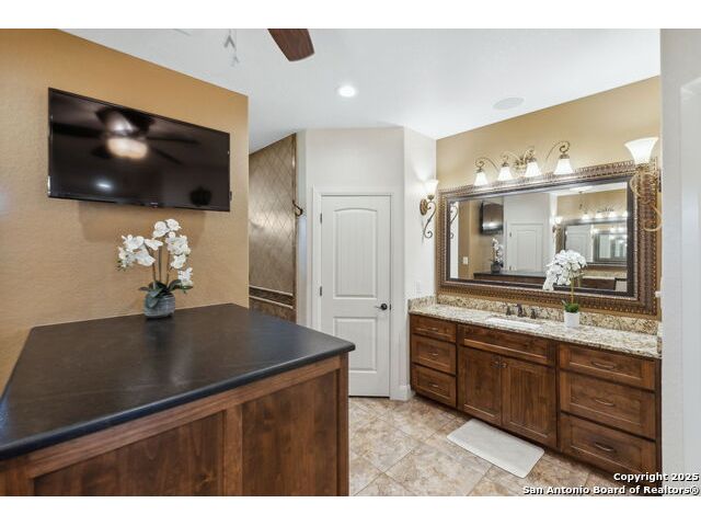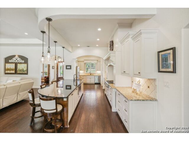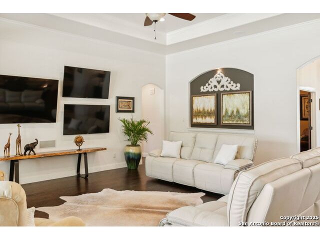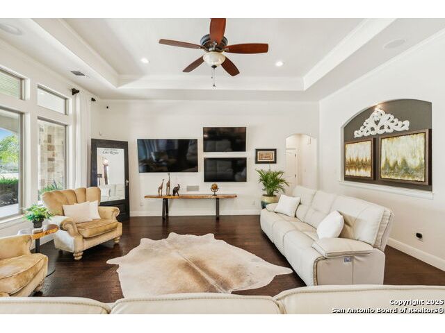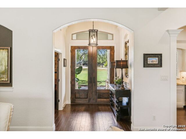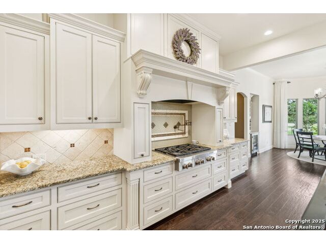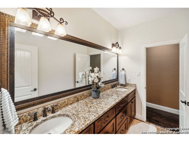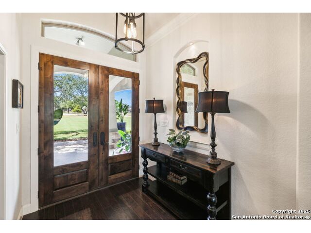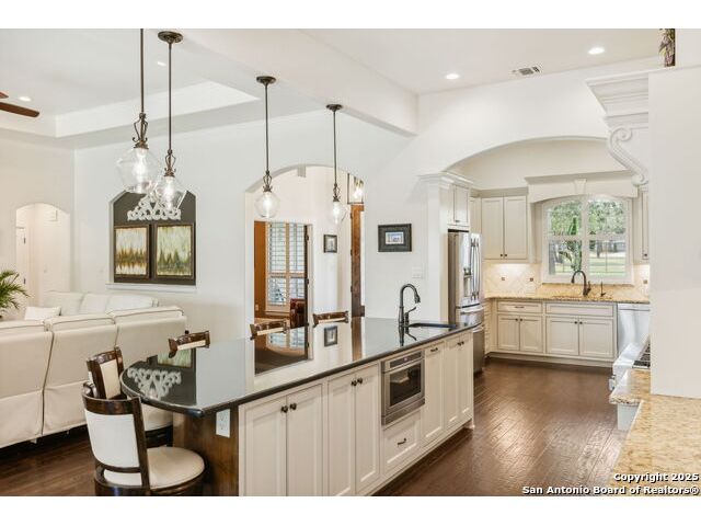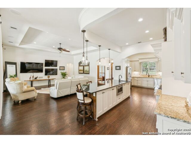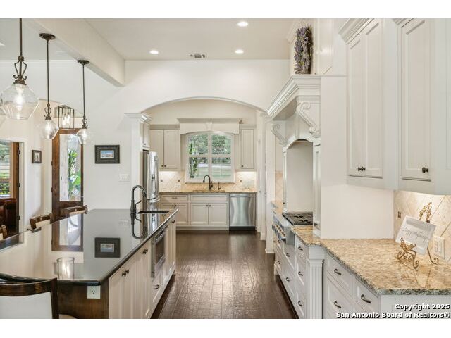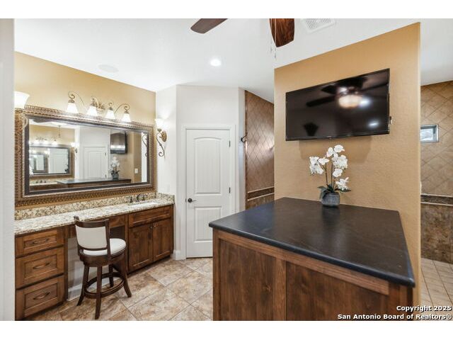 Luxury properties like this one don't become available very often, especially less than half an hour from downtown San Antonio. Welcome to your dream home nestled on 5 acres! This meticulously maintained paradise offers a single-story transitional custom home and a custom built workshop. The home features 3 bedrooms, 2 full bathrooms and 1 half bath, which has outdoor access to the sparkling pool and patio. Upon entry, you are greeted by a bright and open design with views of the pool through the seamless wall of windows. To the right is the home office/flex space with glass & wood French doors and views of the lushly landscaped front yard. As you enter into the living room, you are greeted with a wall of televisions for the ultimate entertainment experience, including surround sound speakers that extend to the primary bedroom and bath as well as the front and back patios: all controlled from the designated media closet. The fabulous open floorplan is perfect for entertaining family and friends. The gourmet island kitchen is a chef's dream, complete with state-of-the-art JennAir appliances: 6 burner gas cook top, under counter microwave drawer, plus double wall ovens, dishwasher, and refrigerator in the open concept butler's kitchen and a walk-in pantry. The breakfast area offers plenty of space for casual dining or adding a more formal touch with the coffee/wine bar and mini wine refrigerator. The peaceful primary suite enjoys outside access to the patio and pool and features a stunning bath with his and her walk-in closets, dual vanities, oversized walk-in shower that includes a rain shower system with body jets, walk-in linen closet, and custom drawers with leather granite counters (this space is plumbed for a garden tub). The separate guest wing offers two additional bedrooms and a magnificent bathroom with oversized dual vanity space. The laundry room has a farm sink, separate utility closet and plenty of space for an additional refrigerator. The garage entry space welcomes you with a catch-all custom cabinetry, wall of hooks and a bench. The residence also features a generous oversized two-car garage with separate bays and additional storage space. The custom workshop is approximately 1,200 square feet, fully insulated and plumbed for bathroom, with single car garage door, attached carport: can equip two cars, RV, boat, or lawn equipment. The resort-style backyard is a serene oasis complete with gorgeous pool (built in late 2023), wood burning fireplace, and outdoor kitchen: Bull gas grill, sink and mini refrigerator. It's perfect for hosting and enjoying the evenings under the big Texas starlit sky. The property is professionally landscaped, including a sprinkler system that extends approximately 1 1/2 acres and drip irrigation for all the flower beds, filled with a variety of oak trees and highlighted by professional lighting. The property has its own water well, in addition to access to the co-op water supply system. It is secured by an automatic custom iron gate, surrounded by five-row barbwire fencing and overlayed with ranch fencing. With the convenience of being just a few minutes from both IH-37 and US Hwy 281 and less than 30 minutes to downtown San Antonio, this is your opportunity to make this exceptional property your home!
