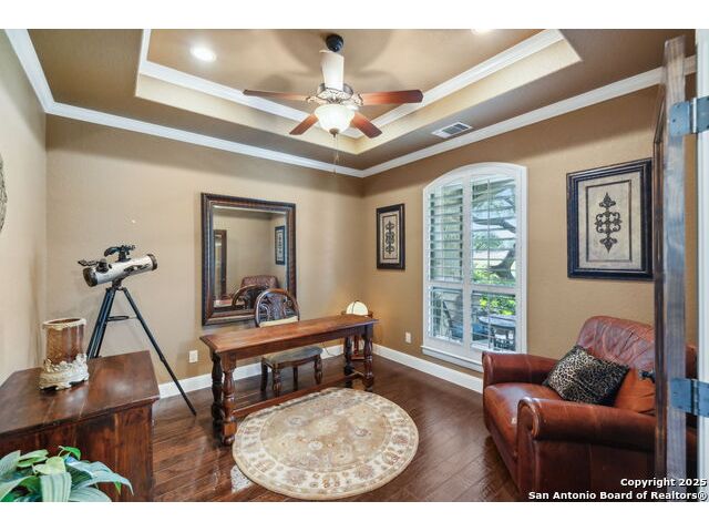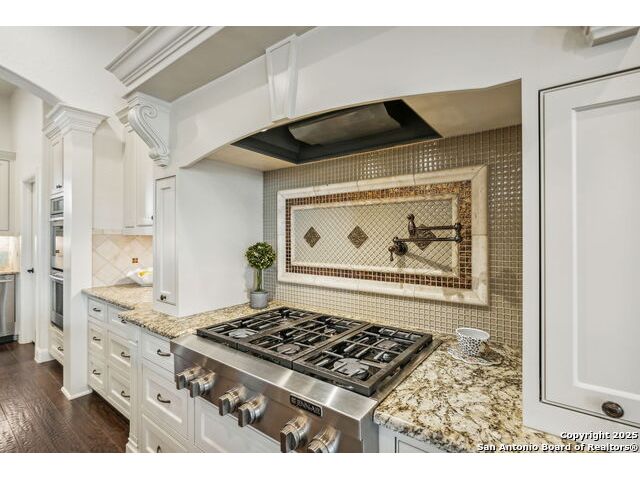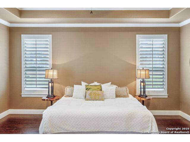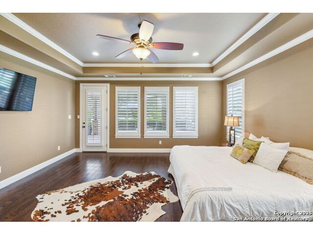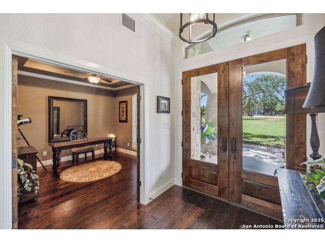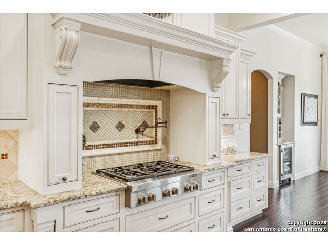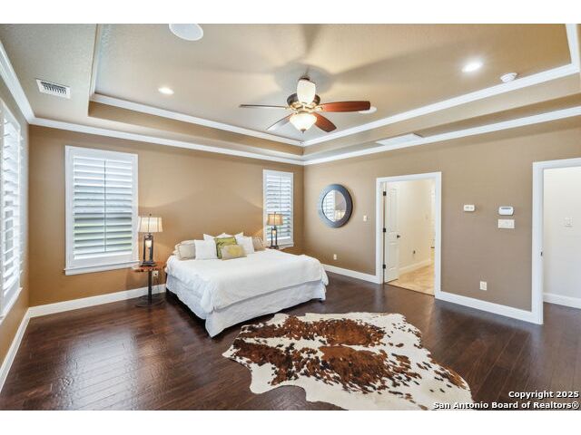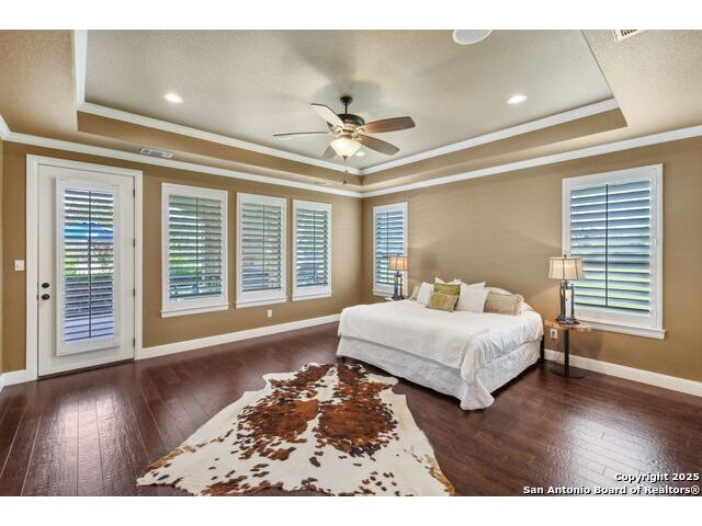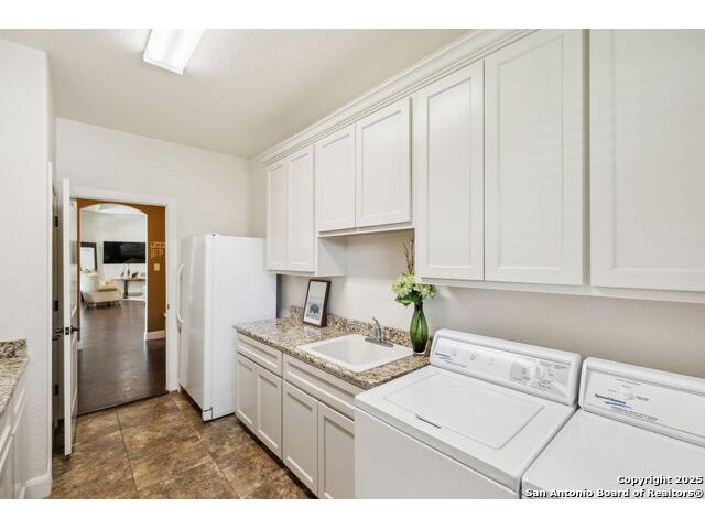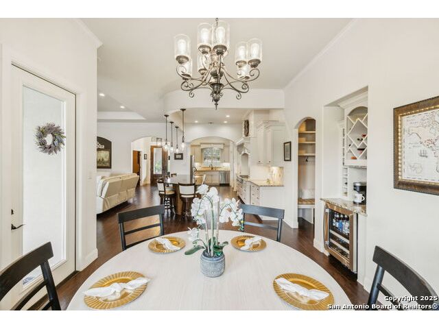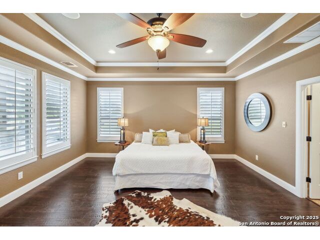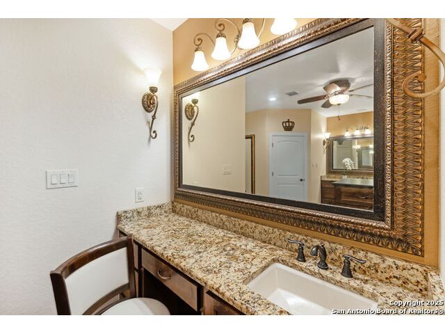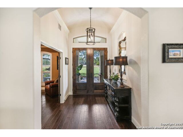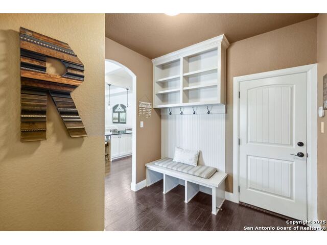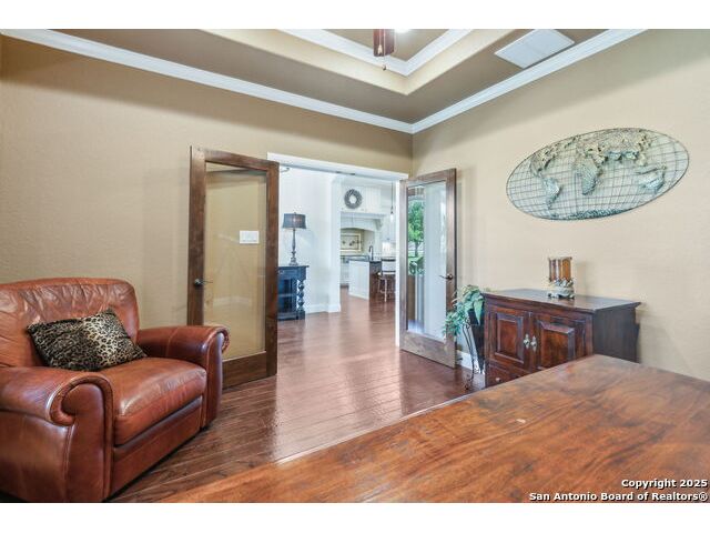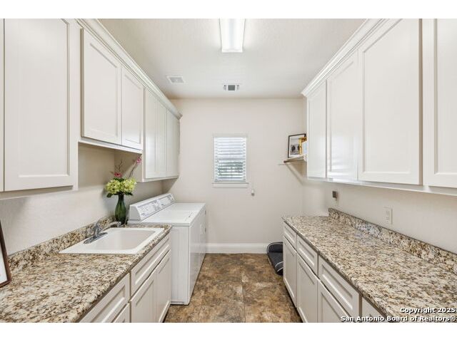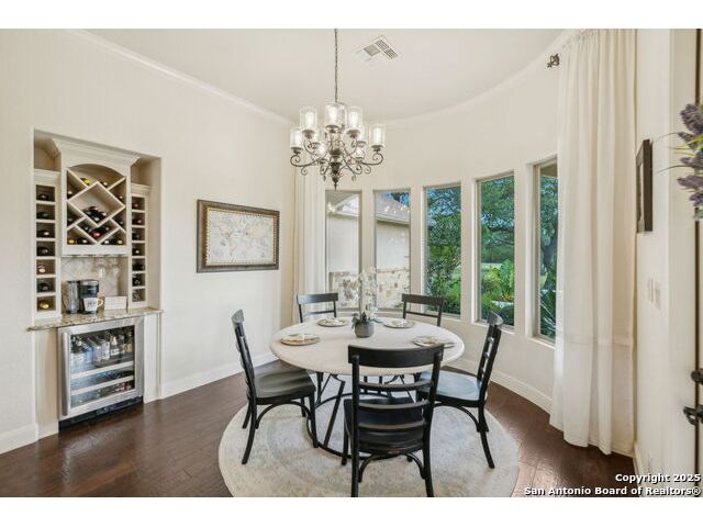Luxury properties like this one don't become available very often, especially less than half an hour from downtown San Antonio. Welcome to your dream home nestled on 5 acres! This meticulously maintained paradise offers a single-story transitional custom home and a custom built workshop. The home features 3 bedrooms, 2 full bathrooms and 1 half bath, which has outdoor access to the sparkling pool and patio. Upon entry, you are greeted by a bright and open design with views of the pool through the seamless wall of windows. To the right is the home office/flex space with glass & wood French doors and views of the lushly landscaped front yard. As you enter into the living room, you are greeted with a wall of televisions for the ultimate entertainment experience, including surround sound speakers that extend to the primary bedroom and bath as well as the front and back patios: all controlled from the designated media closet. The fabulous open floorplan is perfect for entertaining family and friends. The gourmet island kitchen is a chef's dream, complete with state-of-the-art JennAir appliances: 6 burner gas cook top, under counter microwave drawer, plus double wall ovens, dishwasher, and refrigerator in the open concept butler's kitchen and a walk-in pantry. The breakfast area offers plenty of space for casual dining or adding a more formal touch with the coffee/wine bar and mini wine refrigerator. The peaceful primary suite enjoys outside access to the patio and pool and features a stunning bath with his and her walk-in closets, dual vanities, oversized walk-in shower that includes a rain shower system with body jets, walk-in linen closet, and custom drawers with leather granite counters (this space is plumbed for a garden tub). The separate guest wing offers two additional bedrooms and a magnificent bathroom with oversized dual vanity space. The laundry room has a farm sink, separate utility closet and plenty of space for an additional refrigerator. The garage entry space welcomes you with a catch-all custom cabinetry, wall of hooks and a bench. The residence also features a generous oversized two-car garage with separate bays and additional storage space. The custom workshop is approximately 1,200 square feet, fully insulated and plumbed for bathroom, with single car garage door, attached carport: can equip two cars, RV, boat, or lawn equipment. The resort-style backyard is a serene oasis complete with gorgeous pool (built in late 2023), wood burning fireplace, and outdoor kitchen: Bull gas grill, sink and mini refrigerator. It's perfect for hosting and enjoying the evenings under the big Texas starlit sky. The property is professionally landscaped, including a sprinkler system that extends approximately 1 1/2 acres and drip irrigation for all the flower beds, filled with a variety of oak trees and highlighted by professional lighting. The property has its own water well, in addition to access to the co-op water supply system. It is secured by an automatic custom iron gate, surrounded by five-row barbwire fencing and overlayed with ranch fencing. With the convenience of being just a few minutes from both IH-37 and US Hwy 281 and less than 30 minutes to downtown San Antonio, this is your opportunity to make this exceptional property your home!