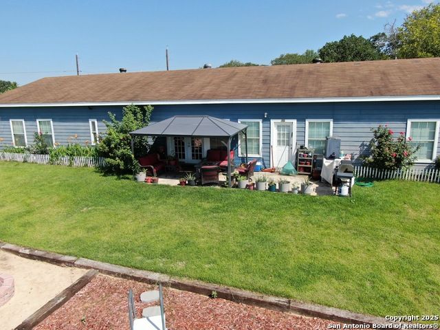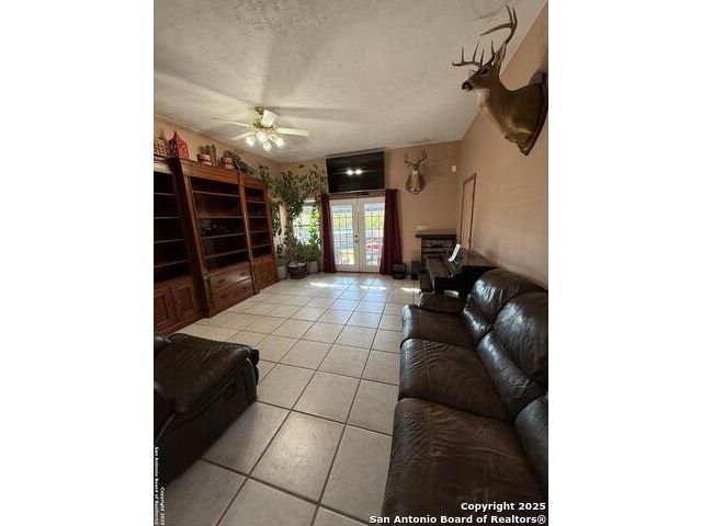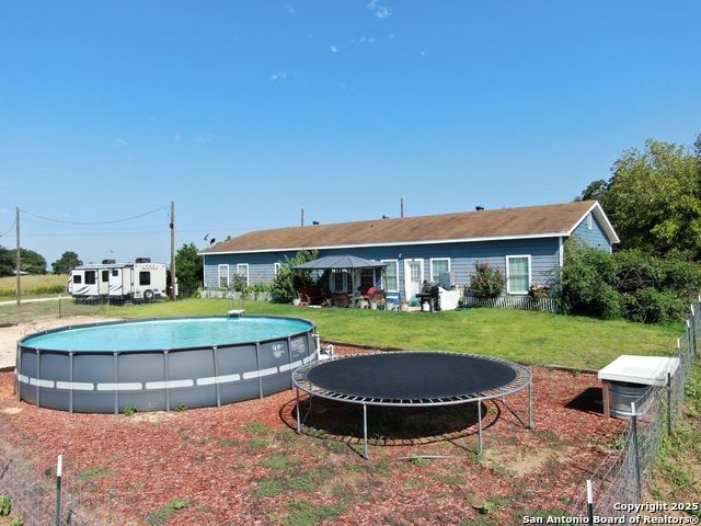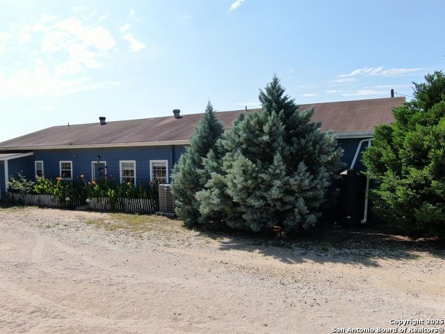 Come see this Sutherland Springs ranch-style home built on a concrete foundation. It's nestled in the backend of 5.85 acres of unrestricted country living with a cattle AG exemption. This 5 bedroom, 3 full bath house with multiple entryways and high ceilings is fenced and cross fenced and is waiting for your family. There is ceramic tile throughout the house with spacious rooms and a split floor plan that has 3 bedrooms on one side and 2 on the opposite with their own private entry/exit. Open Kitchen / Dining Room has updated counters, cabinets, and appliances which includes a large breakfast bar. Master bedroom features a movie theater with high-definition projector to a 120" screen complete with high end surround sound (Negotiable). The home is comforted with an AC system that was installed new in 2021 with the remainder of a 10 year transferable warranty, has High Speed GVEC fiber internet service and has handicap access (36" doors and low entry tubs in 2 bathrooms). Outside there are lots of mature oak trees, spruce, and blue spruce trees. The front of the house features an above ground pool with sand pit for family fun and the back yard features a large double lofted Amish-built storage building and a chicken coop. Come see it today because this can be your peaceful, quiet, Texas country home.
