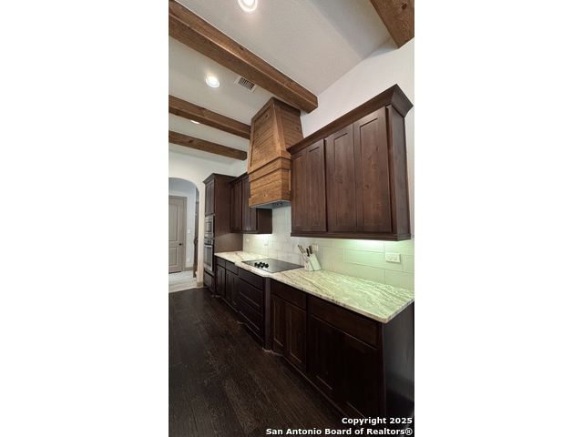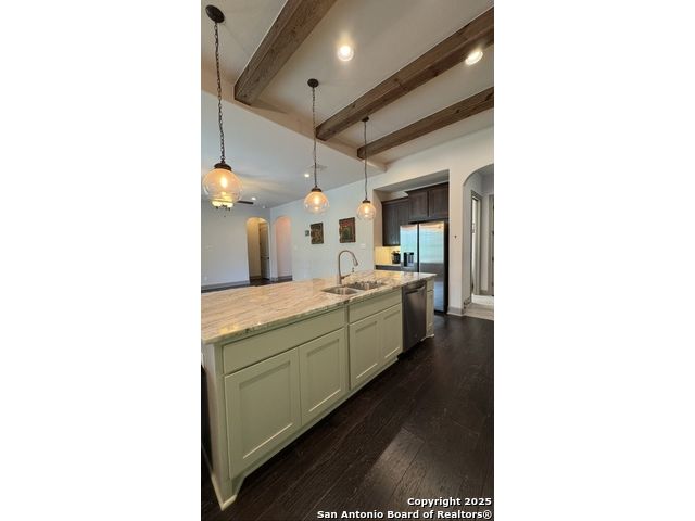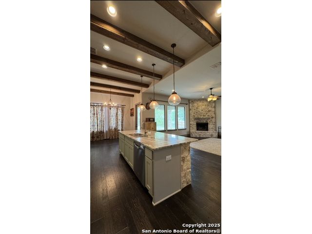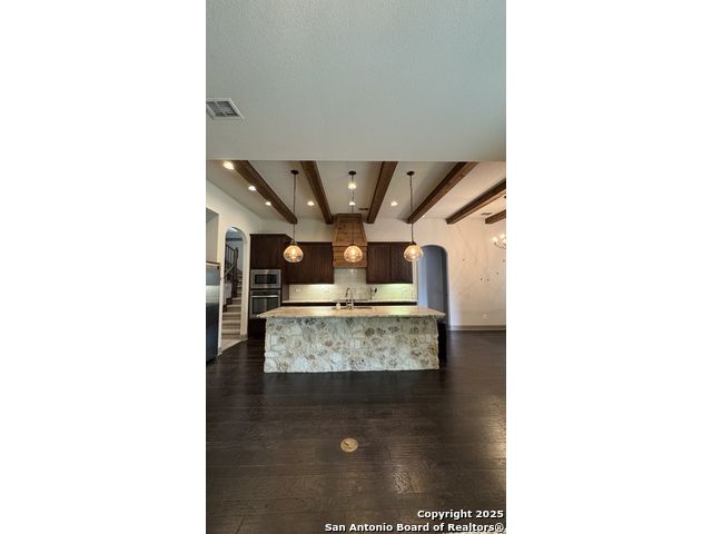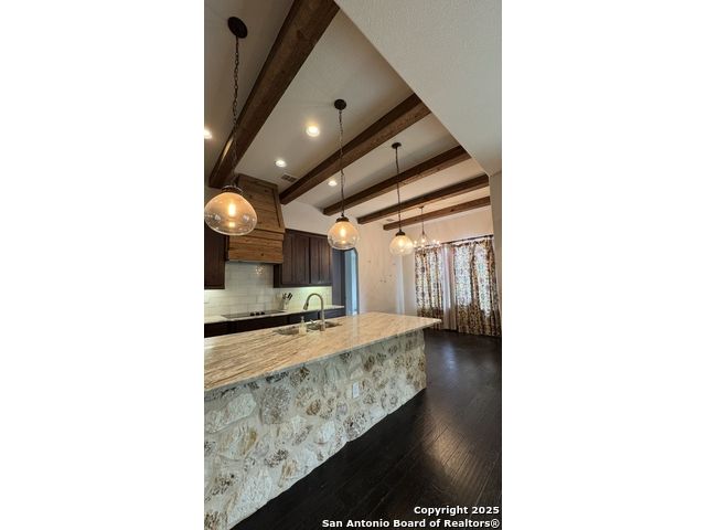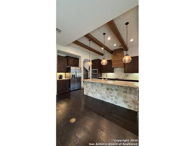 Gorgeous 1.5 story home in Historic Castroville in a very nice & peaceful neighborhood! Very nice & open gourmet kitchen, beautiful marble counters, large island w/cabinets, gorgeous light fixtures, ceiling beams in kitchen, dining & primary bedroom, rustic features, beautiful hard wood floors, tile & berber carpet, rock fireplace, large windows across home for outdoor back views with no neighbors behind & custom drapes. 8' doors, large study w/double glass doors, large loft or 4th bedroom/game/media or hobby room w/attic door for easy access to HVAC. Primary bath marble floor inlay, marble counters, large shower w/bench, separate soaking tub, large walk in primary closet w/shelving & small windows for natural lighting. Storage & bench area below stairs leading out to garage & nearby laundry room w/pocket door & shelving. Garage has extra storage space for garbage bins/workshop/or additional appliances & plumb for water softener.Great yard, full sprinkler system, pipe fence across front & back, privacy fence on both neighbor sides, shaded covered back patio w/ceiling fan, sliding barn door storage metal building on slab w/overhang cover & additional sitting area off patio w/connecting walkway to storage. Upgrades galore in this beautiful property w/neutral colors inside & out, nestled in a great location in the neighborhood!
