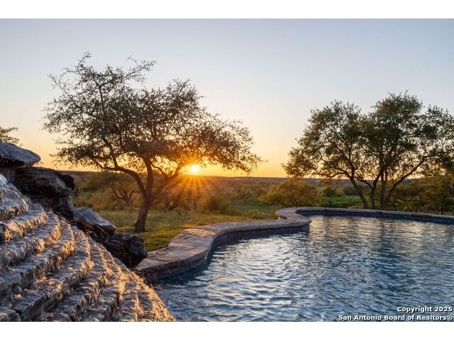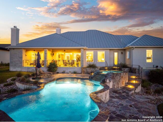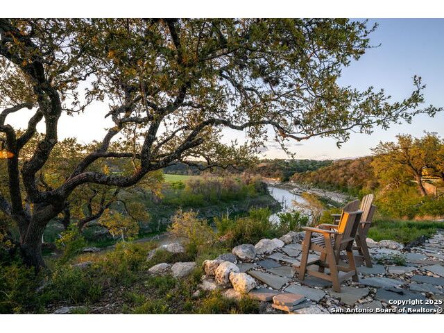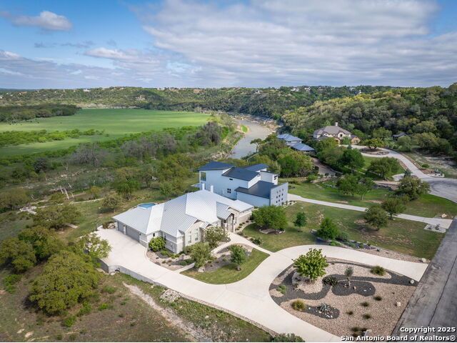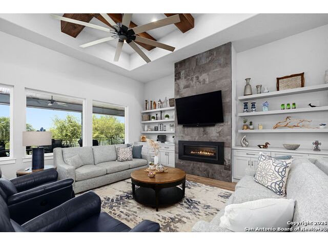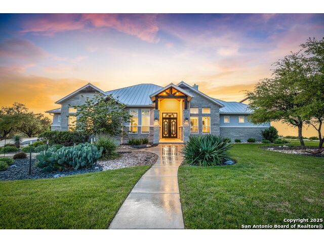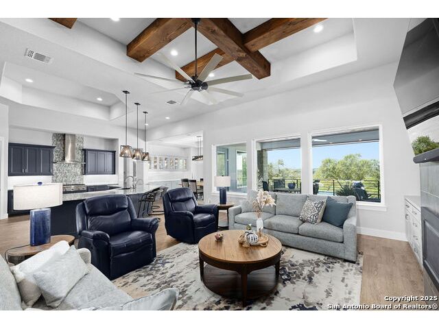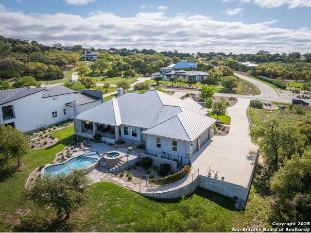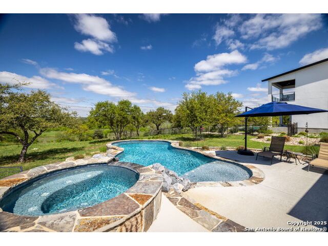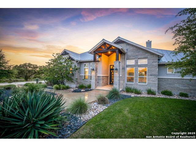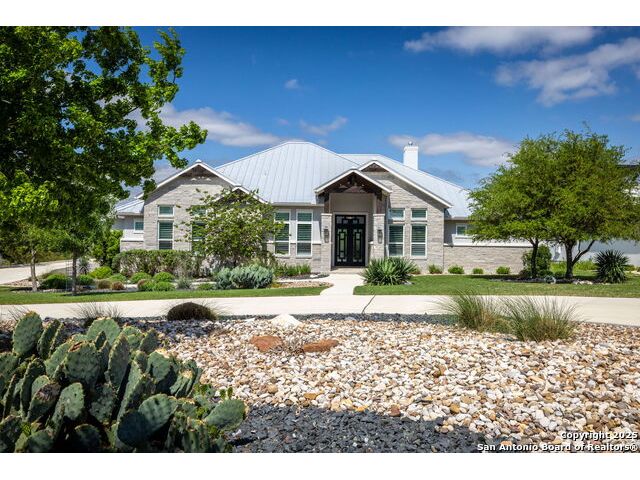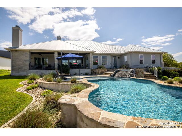 Stunning Home in Mystic Shores - A Private Oasis on 1.11 Acres Welcome to your dream retreat on the banks of the Guadalupe River in the highly sought-after Rio Central section of Mystic Shores in Spring Branch, Texas. This beautifully designed 3,308 sq. ft. home features 4 spacious bedrooms, 4 full bathrooms. Inside, the open-concept living space is ideal for entertaining, featuring a striking gray slate stone fireplace, built-in shelving, and a coffered ceiling with cedar beams that add warmth and character. The gourmet kitchen is a chef's delight with high-end appliances, a six-burner gas cooktop, and an adjoining dining area complete with built-in butler's cabinetry. Enjoy breathtaking views of your private backyard oasis, where a resort-style pool with hot tub and waterfall awaits. The oversized covered patio includes a built-in outdoor kitchen and fireplace-perfect for dining and relaxing by the fire year-round. A full bathroom with direct pool access adds convenience. The primary suite is a luxurious haven, offering an oversized walk-in shower, dual vanities, and his-and-hers walk-in closets. Additional bedrooms and the dedicated office space feature elegant wooden shutters, creating both style and privacy. Complete with a large circular driveway for ample guest parking, this property blends sophistication with natural beauty and comfort. Don't miss this rare opportunity to own a slice of Texas Hill Country paradise.