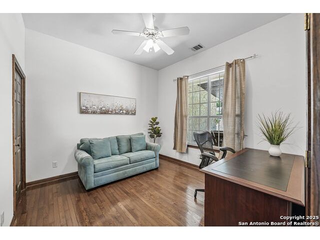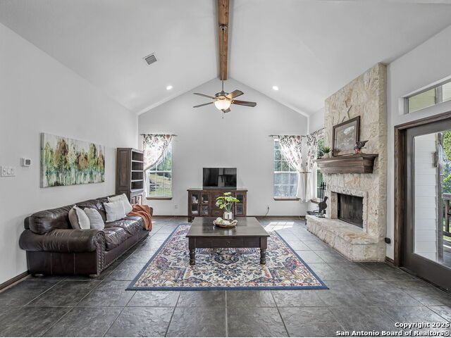 Discover timeless comfort and rustic elegance in this expansive 6-bedroom, 4-bath estate nestled on over five serene acres in the highly sought-after River Mountain Ranch community. Thoughtfully designed for multi-generational living or guest accommodations. This home features three bedrooms and two full baths on the main level, including a private suite with its own entrance, en-suite bath, and covered patio-ideal for long-term guests or an in home office. Wood flooring and tile throughout with high ceilings ads to the open concept and spacious feel. Granite countertops, lots of tall cabinets, central gas cooktop and walk in pantry is a chefs delight. Upstairs, you'll find the primary suite, two additional spacious bedrooms, walk in closets and a Jack & Jill bath. Offering comfort, views of the tree tops, privacy for family and visitors alike. Surrounded by mature native trees and thoughtfully planted landscaping, including various fruit trees. This property offers a tranquil, park-like setting with natural beauty in every direction. Enjoy exclusive access to three private homeowner parks, perfect for outdoor recreation, scenic river access, or peaceful afternoon strolls. Wildlife lovers will delight in the frequent sightings of white-tailed deer, wild turkeys, and other native animals that roam freely across the land where cypress and live oaks grow along the creek. A new water heater was recently installed, several new windows and flooring refinished in the secondary upstairs bedrooms. There's also a chicken coop conveniently on site, just ad the chickens. Experience the quiet elegance and unspoiled charm of Texas Hill Country living-a perfect blend of space, privacy, and community today.