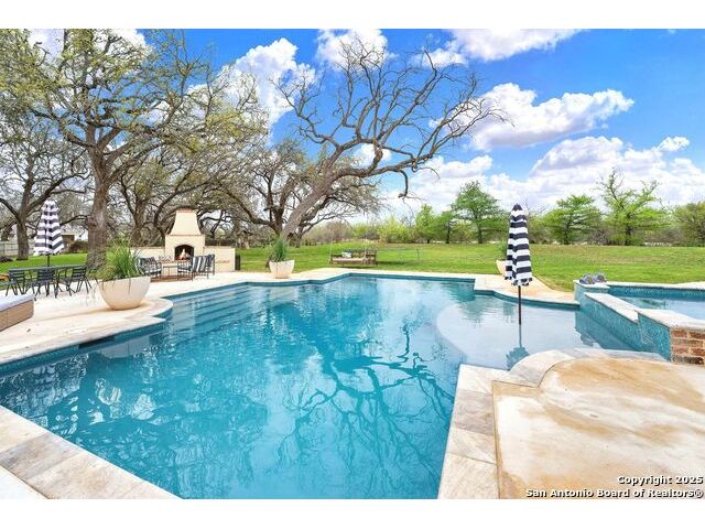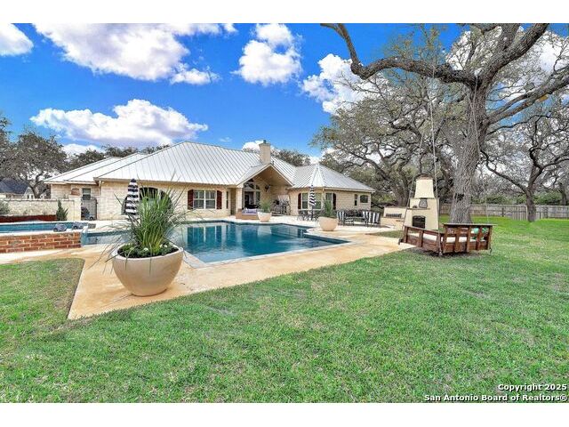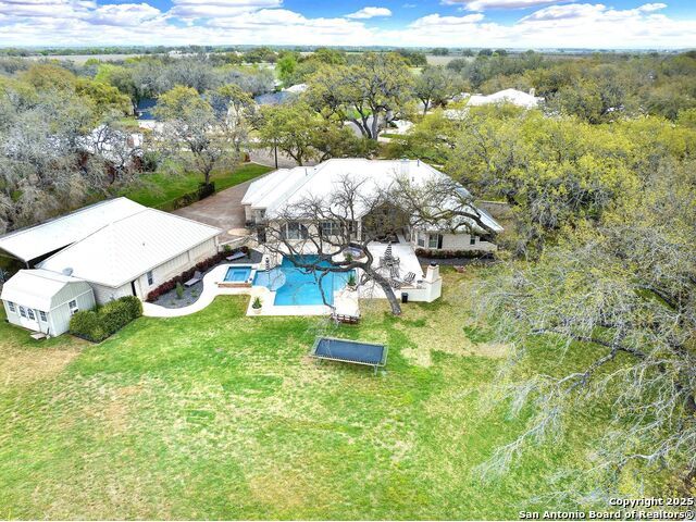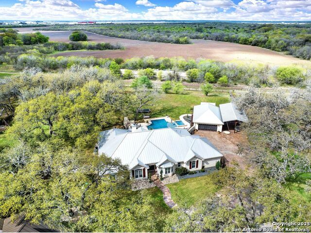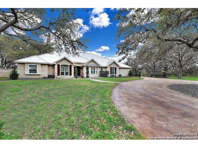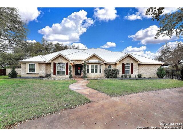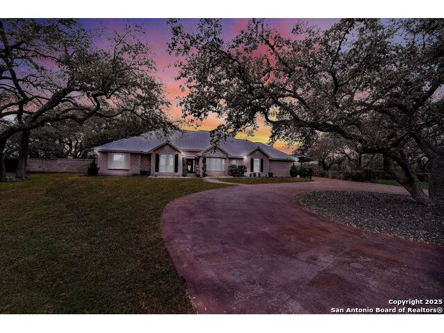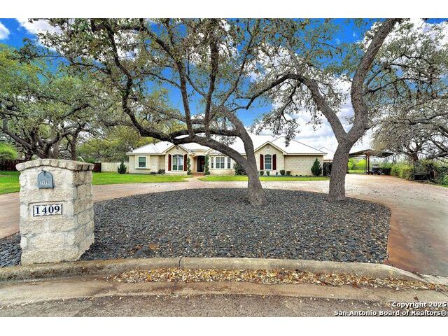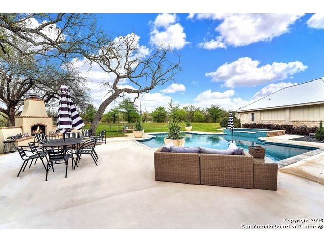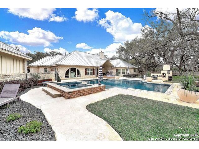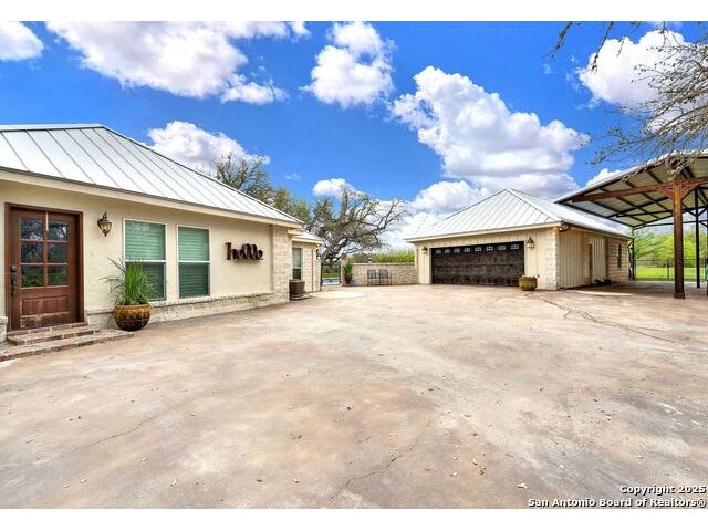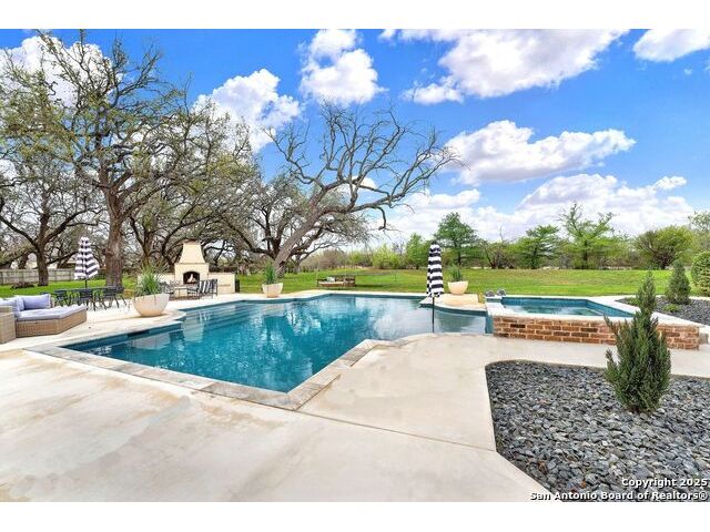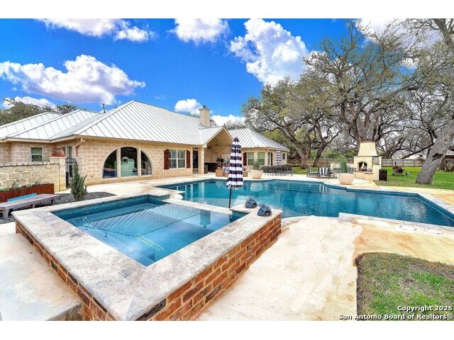 Hill country style beauty just north of downtown Hondo, TX on an exclusive cul-de-sac! Nestled in the gorgeous Kollman Oaks neighborhood, this one-story estate is situated on a 1.3-acre oversized lot with backyard country views. The state-of-the-art backyard is a dream with majestic oaks, a huge custom swimming pool and oversized attached spa, tanning deck, newly poured concrete patio space, a stucco gas outdoor fireplace and so much more! Enjoy a "pool room" which opens to the pool area and has an outdoor bathroom and approximately 300 sq ft of space! Where rustic meets elegance, inside this 3800+ sq ft residence you will find an open concept with two eating spaces, an office open to the living room and a second living space off of the main space! With antique hardwood floors, high ceilings, floor to ceiling rock fireplace and plantation shutters, the style of the home is timeless. With two owner's suites and two additional bedrooms with a jack and jill bathroom, this 4 bedroom, 3.5 bath floor plan is extremely functional. The laundry room is massive and can double as a craft room or butler's kitchen and leads out to the mud room which boasts a gorgeous brick floor. Some extras include a water softener, in wall vacuum system, a gated driveway, new metal roof, new landscaping, carport for boat/RV, stained driveway and a detached two car garage. Enjoy small acreage living just minutes from all of the conveniences of town!